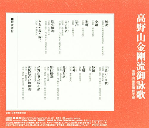 Kongouryu Takano Yama Eingi Kongo Takano Yama Kongo Kouso Headquarters [Contents] About Kongouriu Takano Yama’s Eiringo(Director of Kongo Takanoyama, Director of Kongouji Kongo (Yumasa Shiii) Kongo (Editor: Shunoi Fukushima) Kouaki (Editor: Old Horo Castle) Sanskrit (Editor: Ryutaka Nakano) Admission Japanese Version, Eimon: Yasuchi Takagi, Chant/Artist: Eeko Moneya, Hidao Fukuoka others) Honor (Eichi: Ancient Hojo Castle Chant/Artist: Eeko Moneya, Hidao Fukuoka others) Mioya Kai Chest (Editors: Old Horo Castle) Song of Song (Eichi: Shunoshi Fukushima, Chir, Artist: Eiko Moneya, Hidao Fukuoka and others) Kameen (Editor: Yasushi Takagi) Tamagawa (Editor: Yasushi Takagi) Kazuchi (Eichi: Shunoshi Fukushima, Choir, Artist: Eeko Moneya, Hidao Fukuoka others) Shugi Waku (Eichi: Anogororo Hojo Chant/Artist: Eeko Moneya, Hidao Fukuoka others) Kazuyama Okunoin (Editor: Shunoshi Fukushima) Wishing honor of the Law Jewership (Eichi: Ryusani Nakano, Chir, Artist: Eeko Moneya, Hidao Fukuoka, others) [Sold by] Pony Canyon