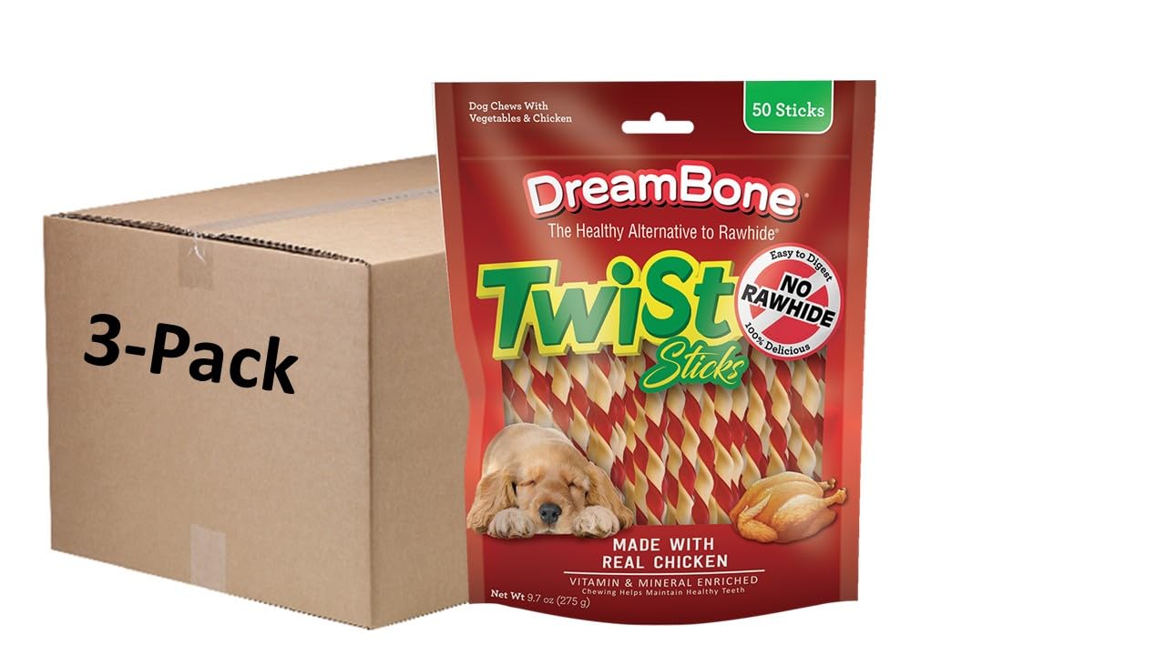 DreamBone® chews have all the benefits of a rawhide chew…without the rawhide! No-rawhide DreamBone chews are made with real chicken, beef, bacon and cheese or sweet potato and wholesome vegetables for a scrumptious taste dogs can’t resist! No-rawhide DreamBone® Twist Sticks for dogs are made with real chicken and wholesome vegetables for a scrumptious taste dogs can’t resist! They have all the benefits of a rawhide chew – without the rawhide! These easy-to-digest chews are enriched with vitamins and minerals in a twist-shaped chew for all sizes of dog. They’re highly digestible and 100 percent delicious. DreamBone Twist Sticks help maintain healthy teeth and gums through the natural action of chewing, making them chews both you and your dog can love! Give your dog one to two DreamBone Twist Sticks chews per day. For supervised consumption only. This product is intended for intermittent or supplemental feeding only. Store in a cool, dry place. After opening this resealable bag, reseal or store in an airtight container to preserve freshness.