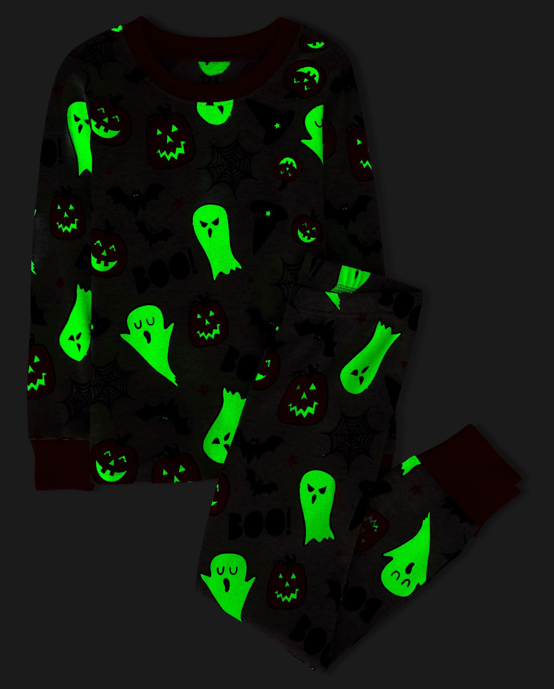 FABRICATION: 100% rib-knit cotton, imported PAJAMA TOP: Rib-knit crew neck, long sleeves, glow in the dark Halloween print; For best glow effect, expose to light before wearing.