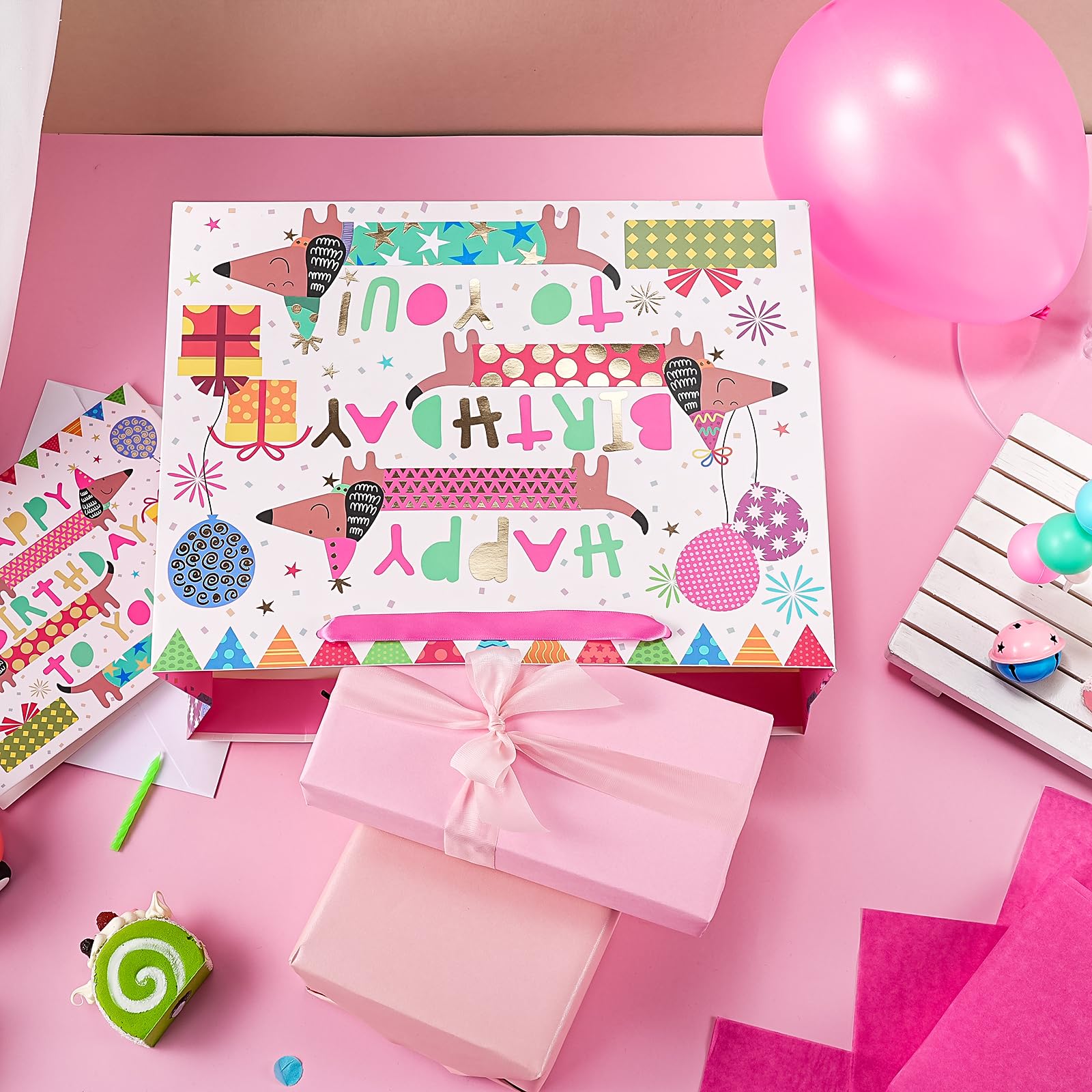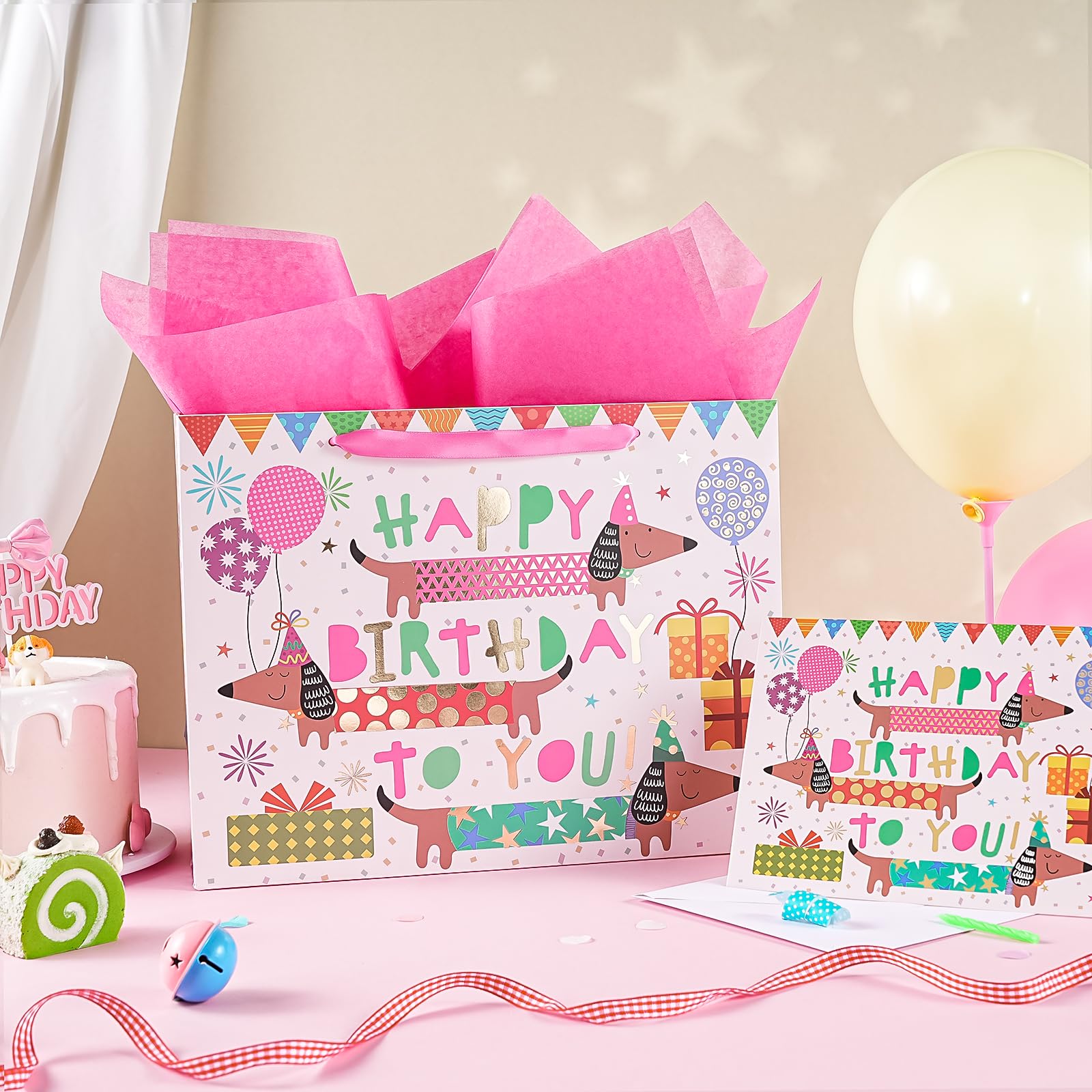 Package: The package includes 1 gift bag + 1 greeting card + 2 tissue paper, the gift bag measure 13" Wide x 10" High x 5" Deep, its big inside space is ideal for housing a diverse range of presents. Strong & Premium Quality: WRAPAHOLIC gift bags are all made with superior quality, every part of the bag is well-made using heavy duty glue, making them sturdy and reliable for every packing need. Unique Looking: Adorable dachshund dogs birthday party and "HAPPY BIRTHDAY TO YOU!" lettering design adds to the cheerful vibe, make the birthday gift even more special. Super Convenient: It is convenient to use with ribbon handle design, the gift bag is perfect for craft and DIY, you can decorate it with beautiful ribbons. Use All Occasion: Our excellent gift bags perfect for child or an adult who adores dogs, girls boy kids birthday, baby shower, party favor bag, celebration gift bag. QUALITY CUSTOMER SERVICE: Any question about products or orders, please feel free to contact the customer service, we will try our best to solve the problem.