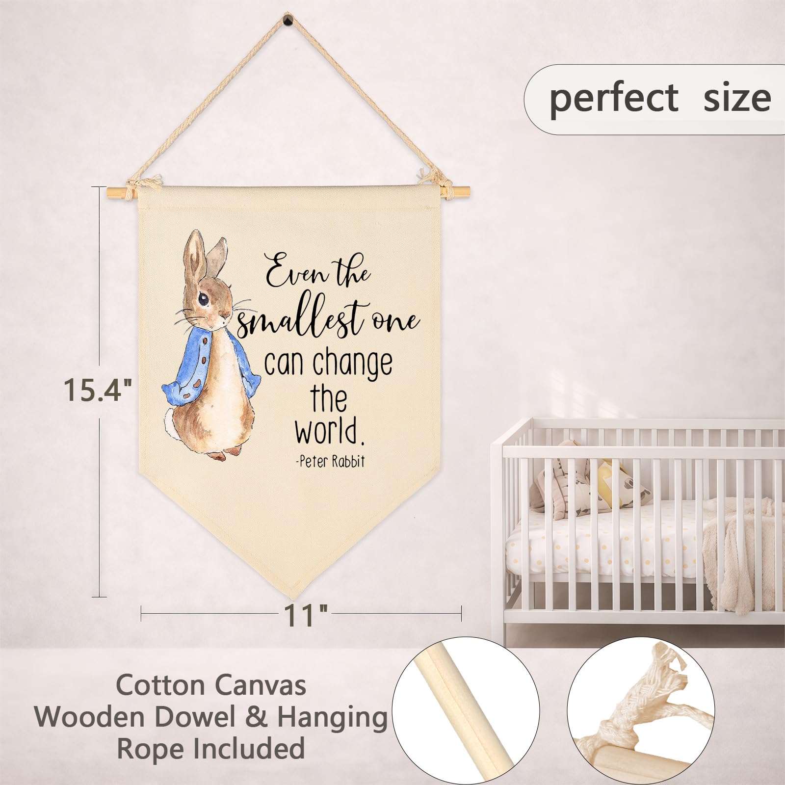 Bring gentle spring charm to your home with this Easter canvas hanging flag banner. Crafted from durable natural cotton canvas, it has a premium, long-lasting finish with cozy texture and a fade-resistant print that stays bright and attractive for years. The cute watercolor bunny and uplifting message “Even the smallest one can change the world” create a warm, encouraging vibe for nursery baby room wall decor, kids room, playroom, teen room Bedroom Playroom Reading Room, or as Front Door decor. Measuring 15.4" x 11.1", it fits comfortably in a variety of spaces and makes a sweet statement without overwhelming. It arrives fully assembled with a pre-tied 1 twine and 1 sturdy wooden stick, lightweight for quick hanging on any wall, door, or hook, and easy to remove if you need a change. A meaningful gift for baby kids girl boy and new parents, perfect for Easter, baby shower, birthday party, Christmas, New Year, and new house renovation.