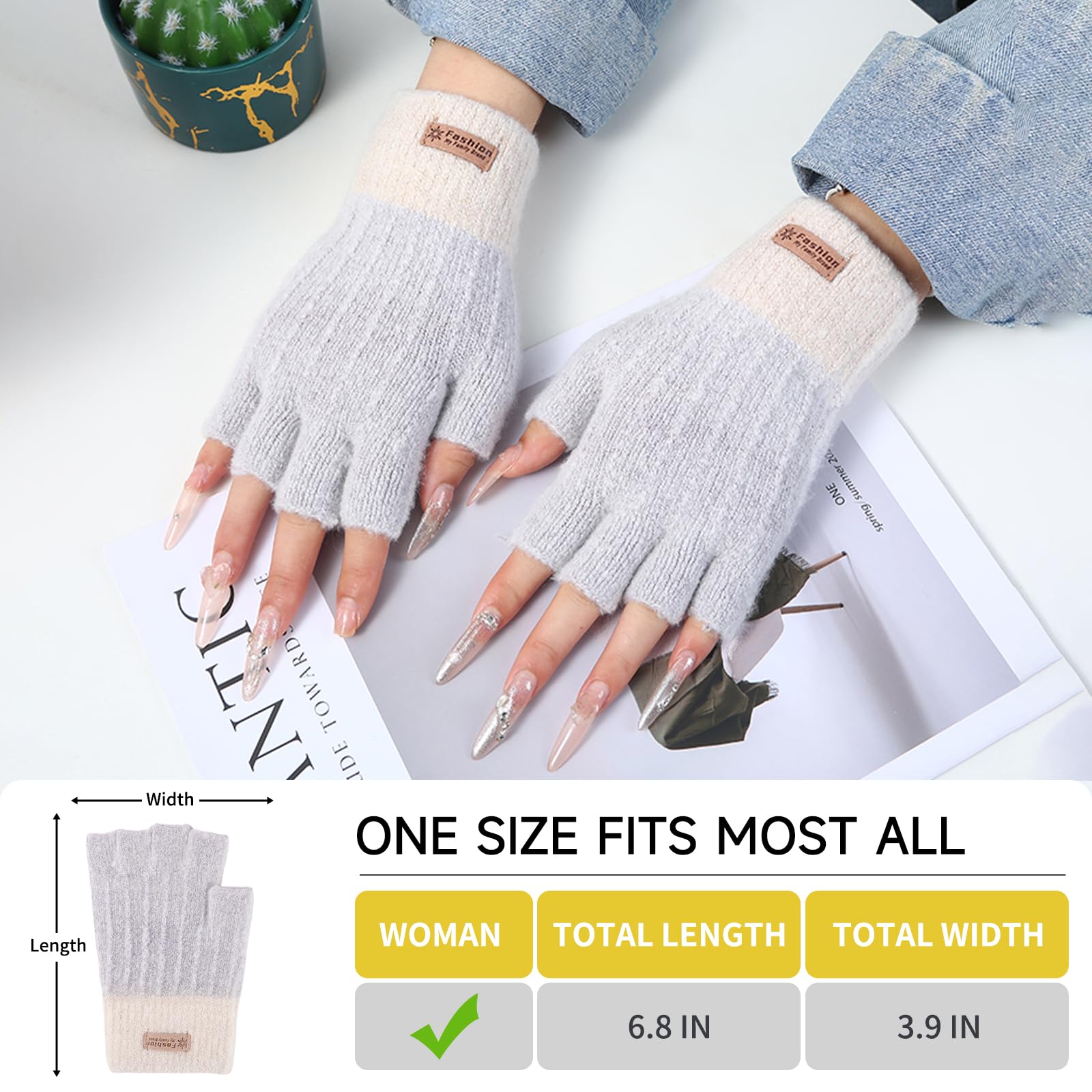 [GOOD ELASTIC & SNUG FIT]: The fingerless knitted gloves for women designed with excellent elasticity, which can make these half finger gloves easily fit most women. The elastic nature of the womens gloves provides a secure fit that adapts to different hand sizes. Our womens fingerless gloves add thick knitted in wrist area to prevent the wind in. The warm fingerless gloves for women are in 6.8 inches length and 3.9 inches width.