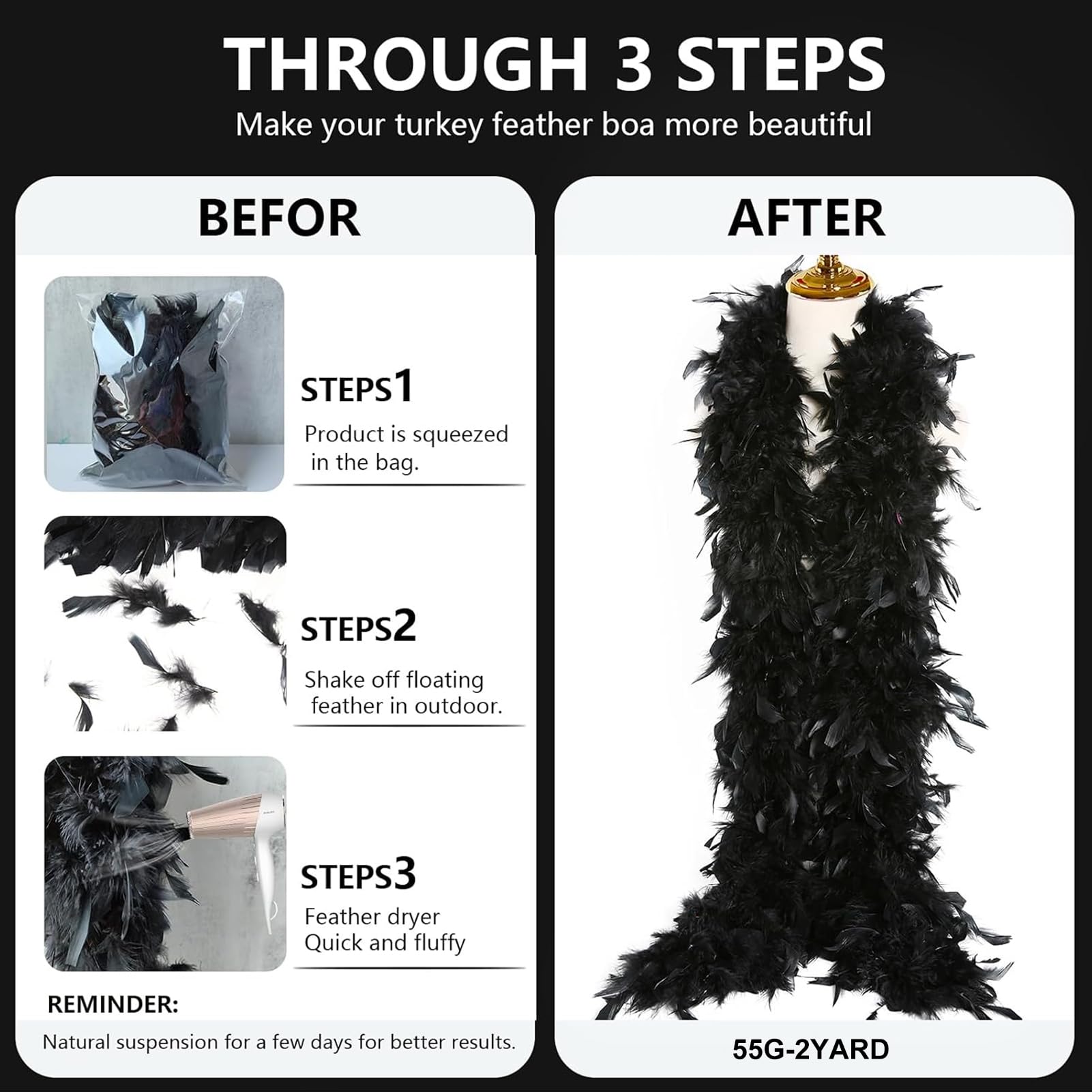 ❤️Precautions before use:Since our feathers are all natural and handcrafted,After you receive the boas, take them out of the package and shake them outdoor first, in order to get rid of debris and fallen feathers.Then hang it up for few hours before wearing. If you can hang up blowed few days, it will looks as the picture full and big.Of course,the longer you hang them up, the turkey feather boa will be more fluffy and the effect will be more stunning.