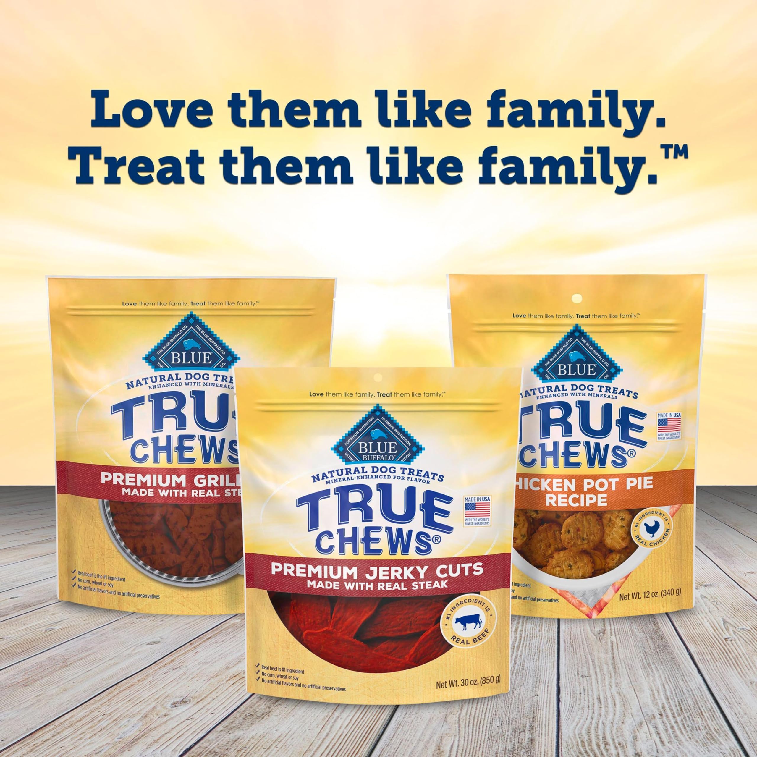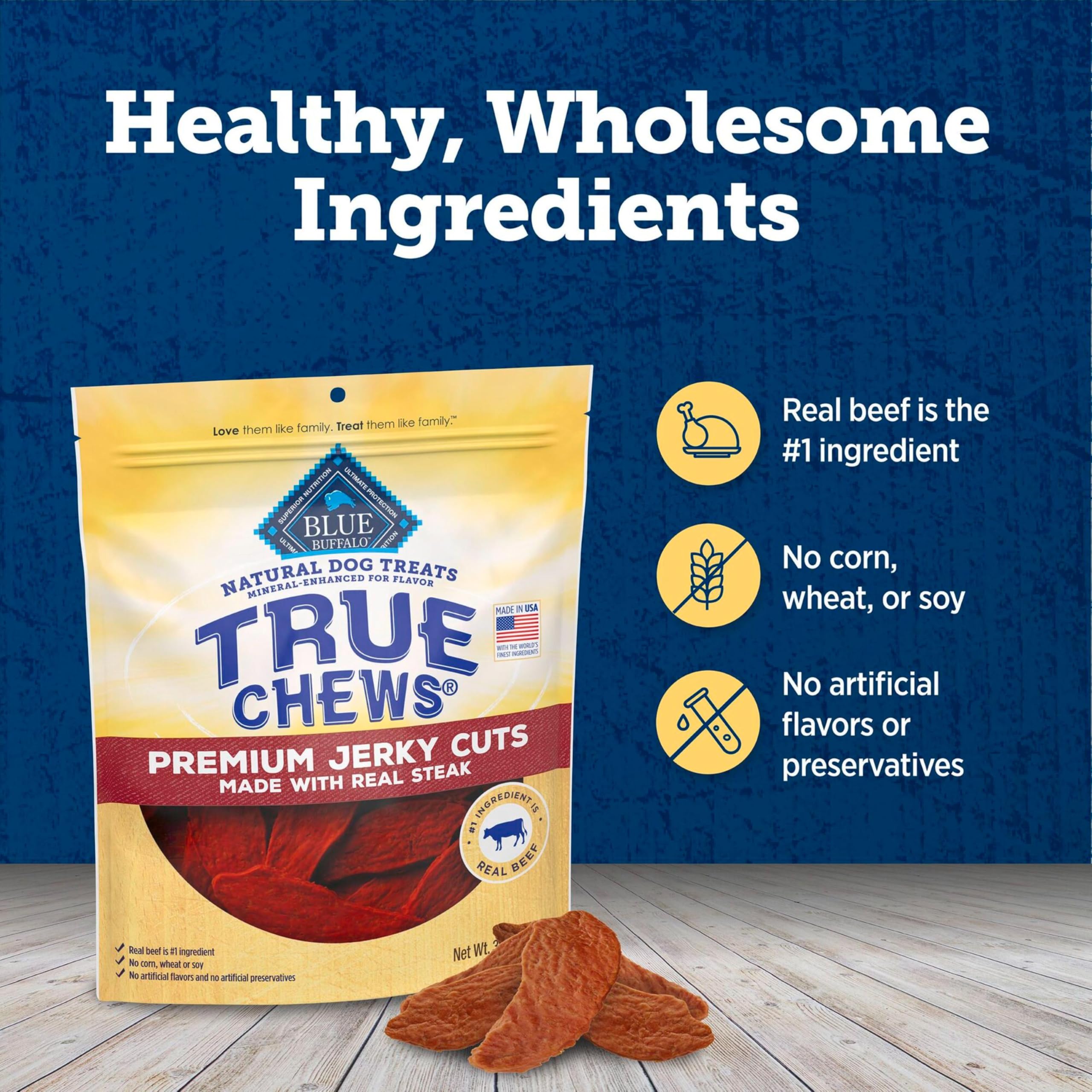 Contains: One (1) 30-oz bag of BLUE True Chews Natural Jerky Cuts Dog Treats; Steak Recipe