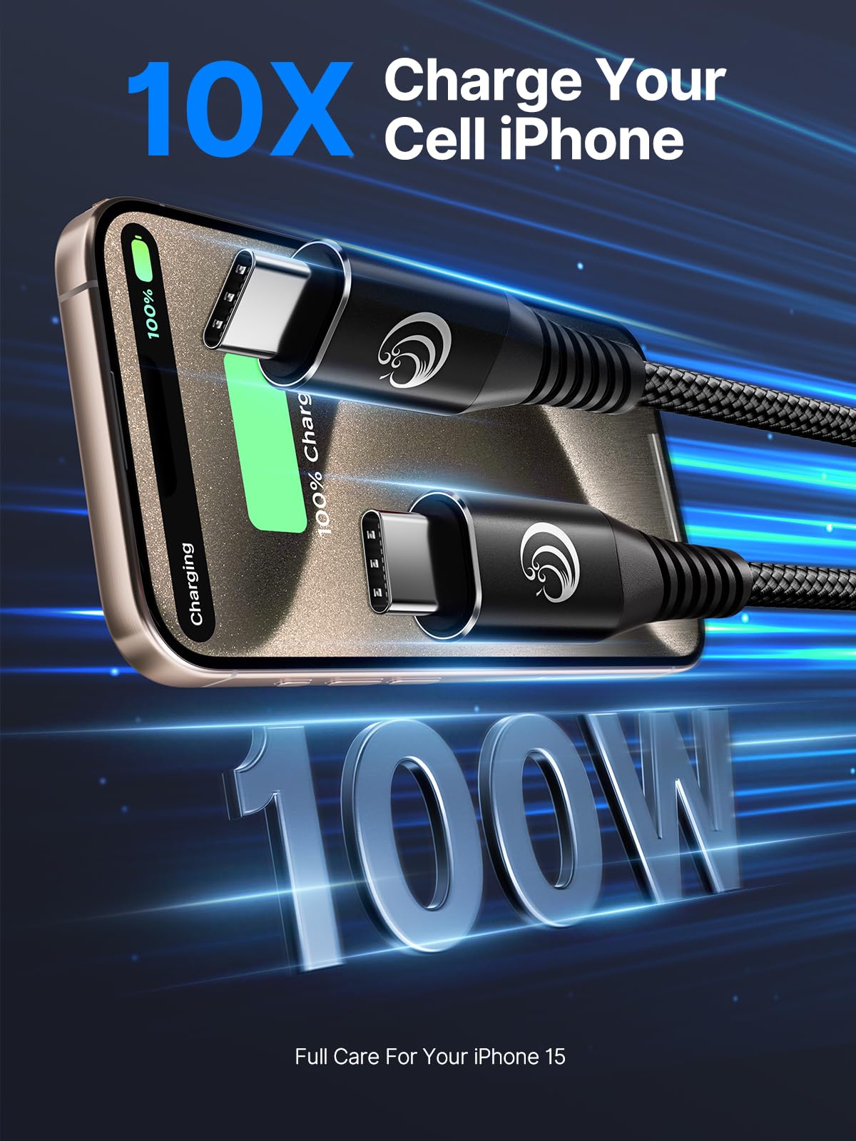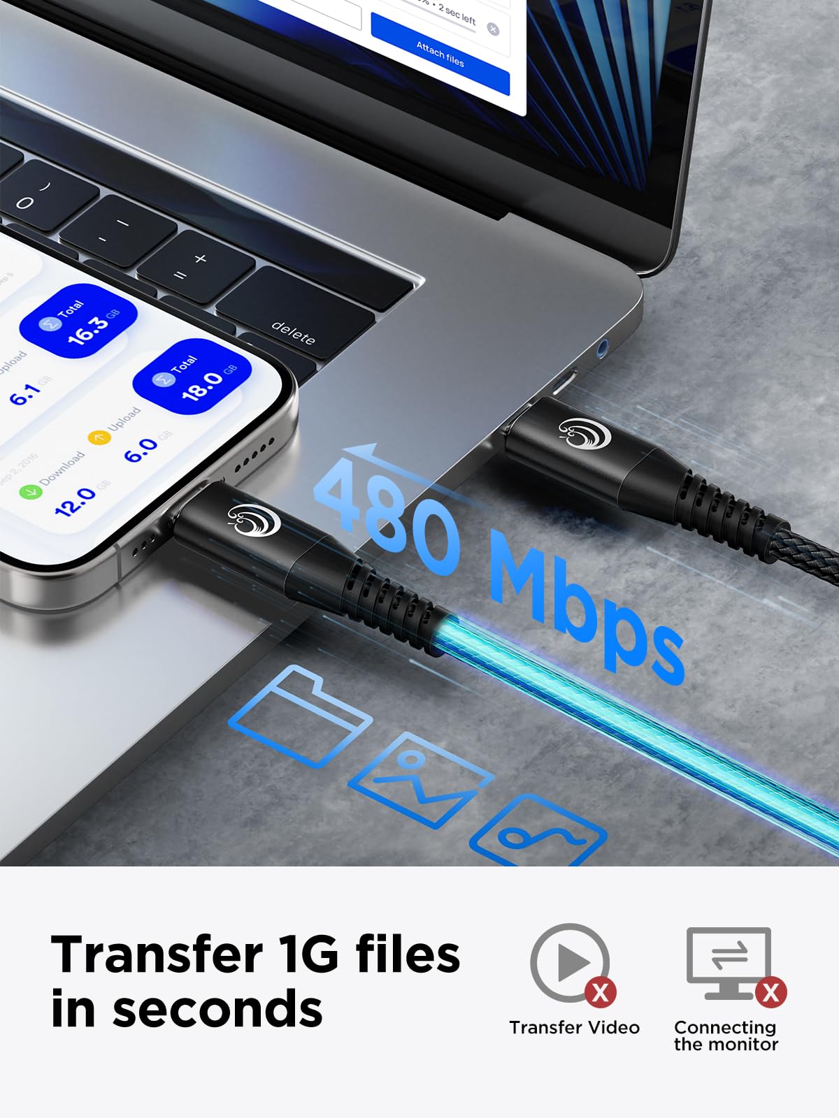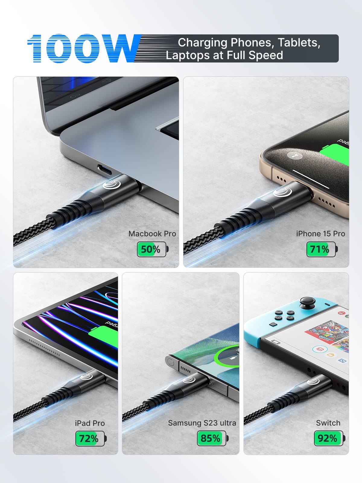 【2024 Upgraded 100W/5A Fast Charging】Experience the next level of charging! With our lightning-speed 100W usb c to c cable, your iPhone 15 Pro Max reaches a whopping 71% battery in 30 minutes, fast charging MacBook Pro 16" up to 50%, also charge Samsung S23 Ultra to 85% while 60W cable is only 54%, notably knocks off 45mins of your waiting time. And data transfer speeds up to 480Mbps