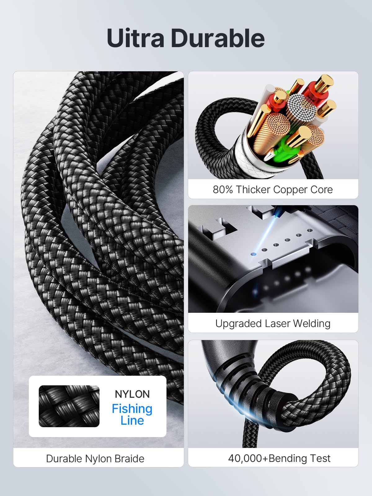 【Amazing Durability】Featured by a sandblasted aluminum shell and unibody plug and the body is made of revolutionary fishing net X Nylon braided wire, usbc to usbc cable provides a high-quality texture and enhance heat dissipation capability, Lasts 10x longer than ordinary cables-proven in a laboratory environment to withstand 40000 bends, resulting in a longer lifespan compared to ordinary TPE C to C cables