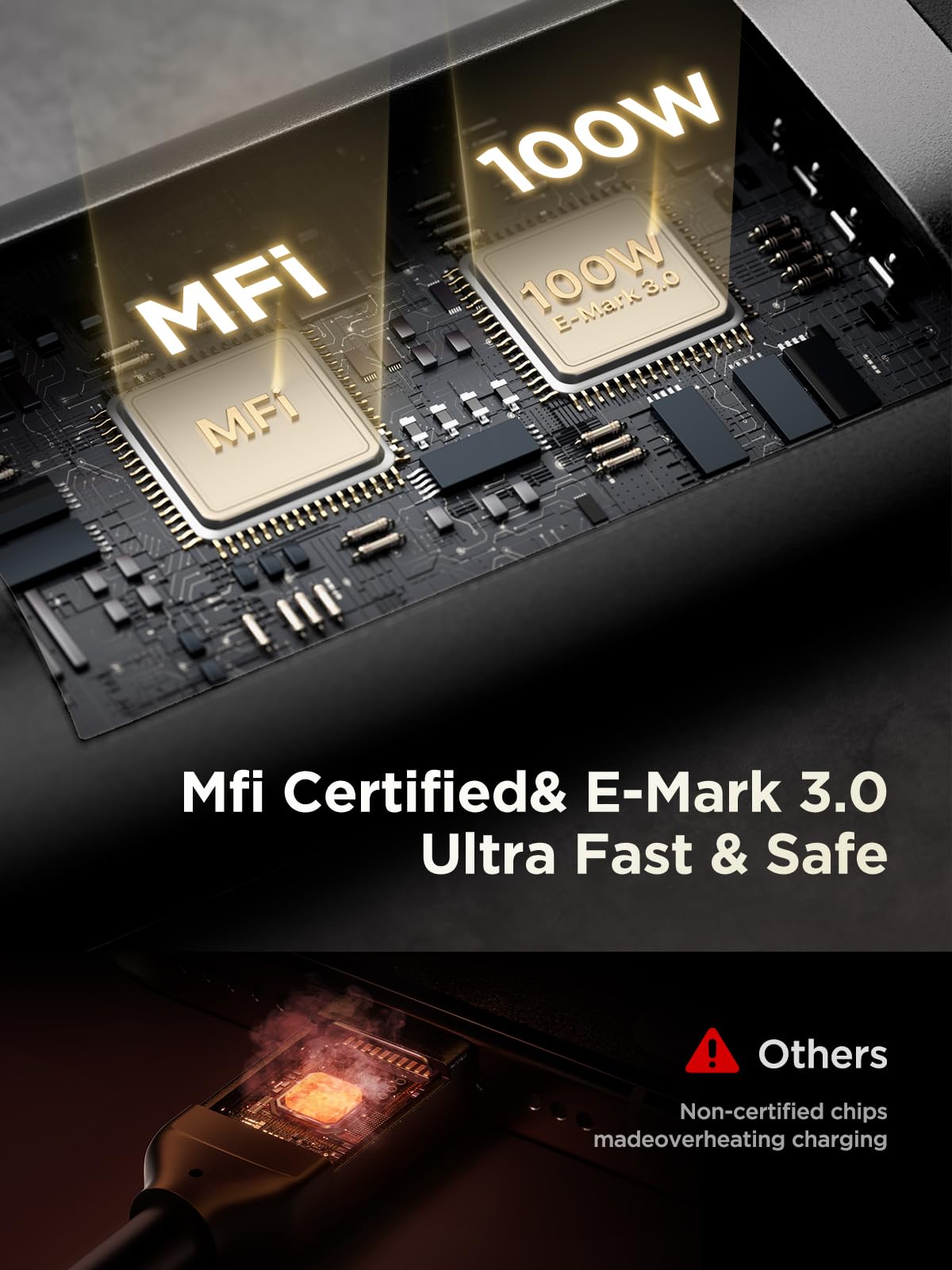 【MFI Certified Emark Chip】Yosou 100W c to c cable fast charging cord is build in the original power delivery E-Mark chip, which supports USB C PD fast charging. Also has passed 48-hour salt spray test ,ROHS,REACH USB-IF, provides comprehensive protection to devices battery and adapters, keep you in light-speed charging and safe