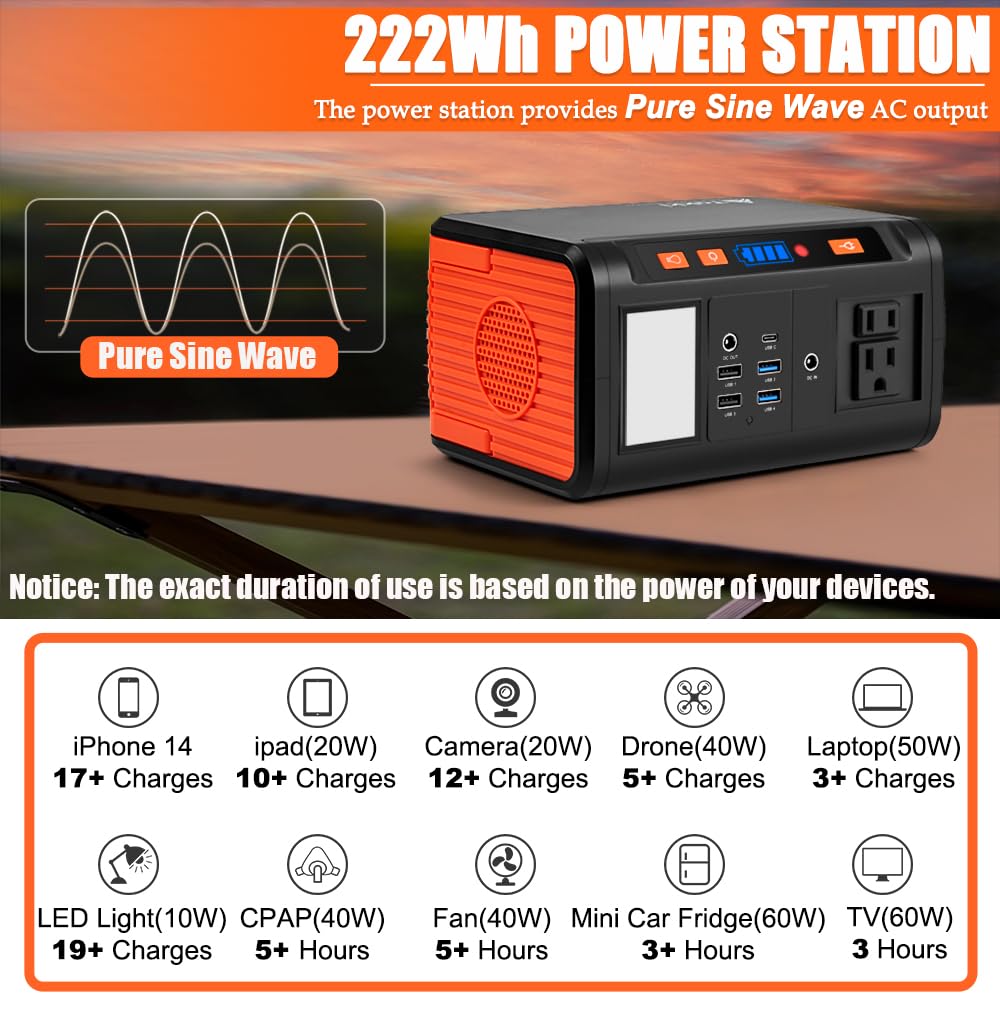 Pure Sine Wave Outlet: With a battery capacity of 222Wh (60000mAh/3.7V), the portable power station is compact(8.13 x 4.35 x 5.93 inches) and lightweight(5.95 lbs), designed for home, outdoor camping, office and emergency. Safe Pure Sine Wave charge your devices more stable and safety without damage and reduces audible and electrical noise. It supports power for devices up to 250W/Peak 450W.(Solar panel not included)