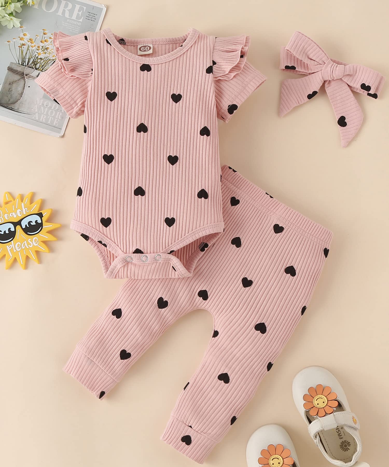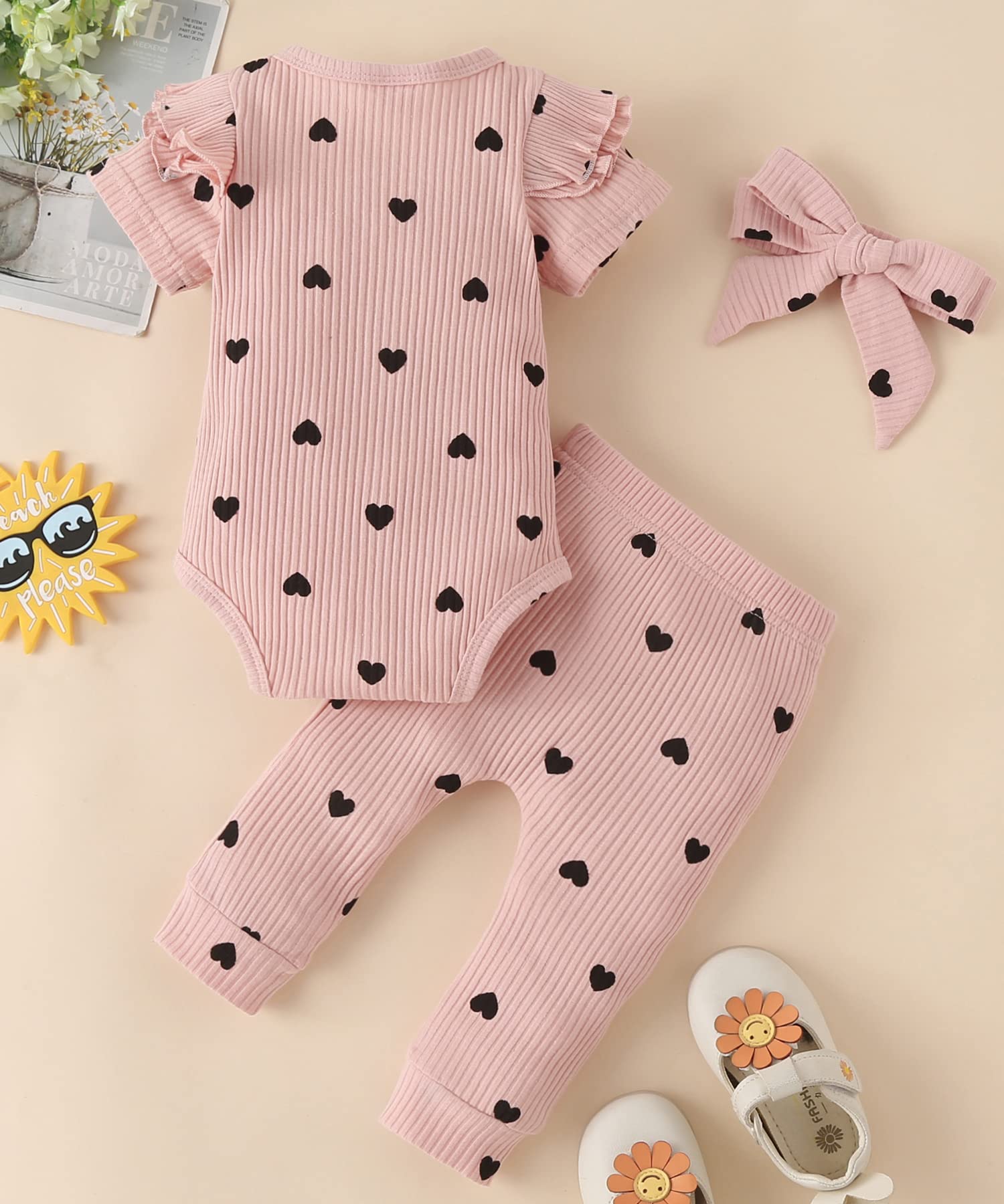 Baby girl outfits with adorable heart prints express great love from family.The ruffled layered shoulder,frill pant and headband will highlight your beloved Baby beauty.
