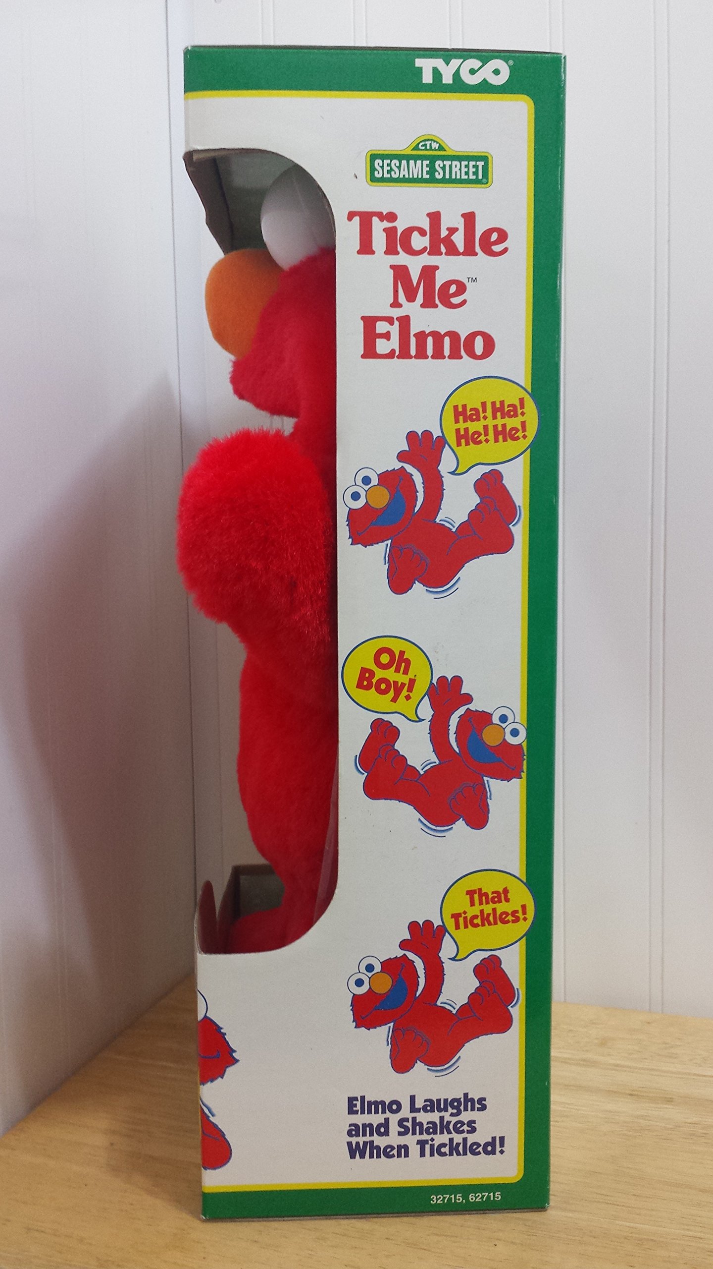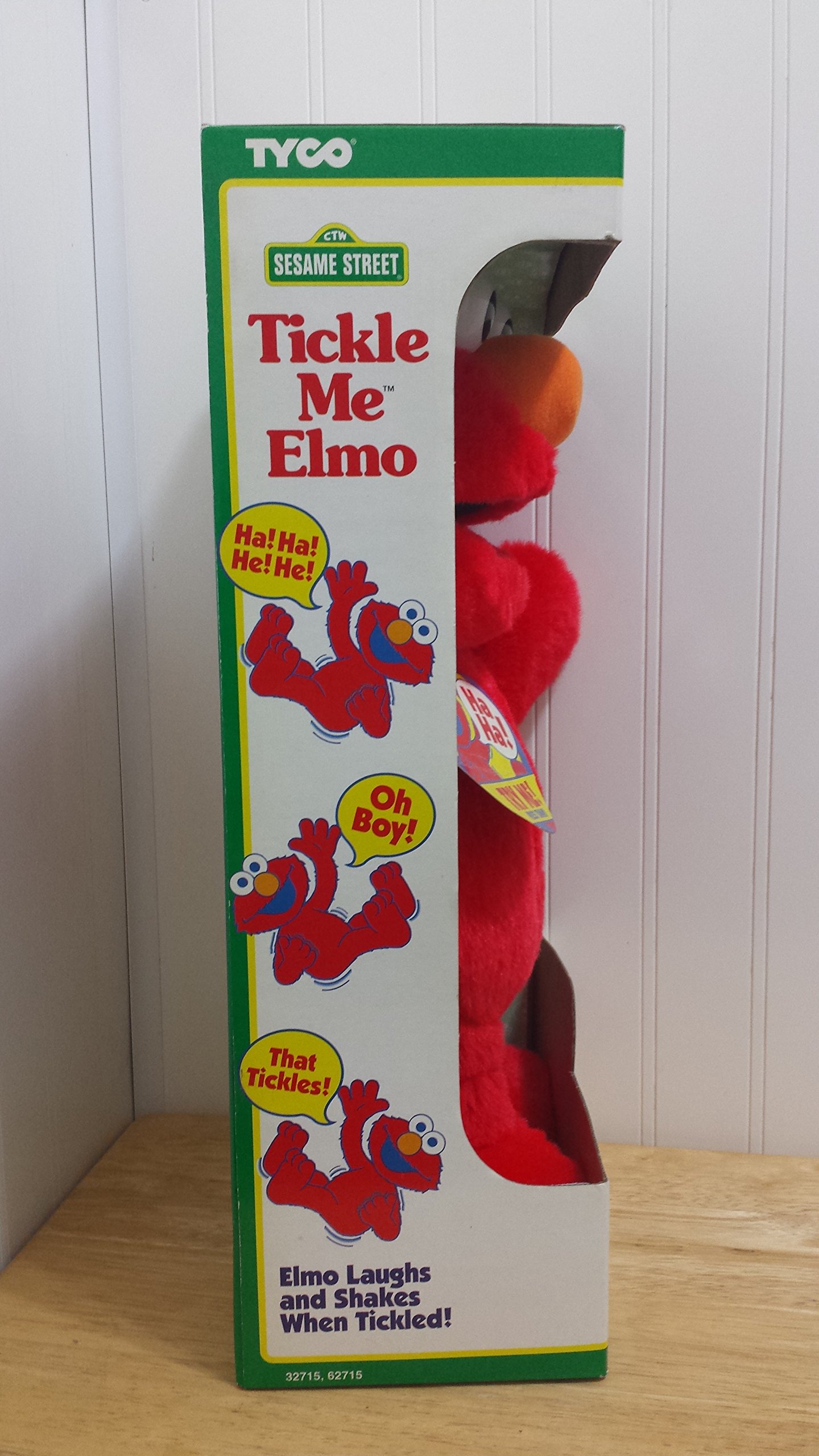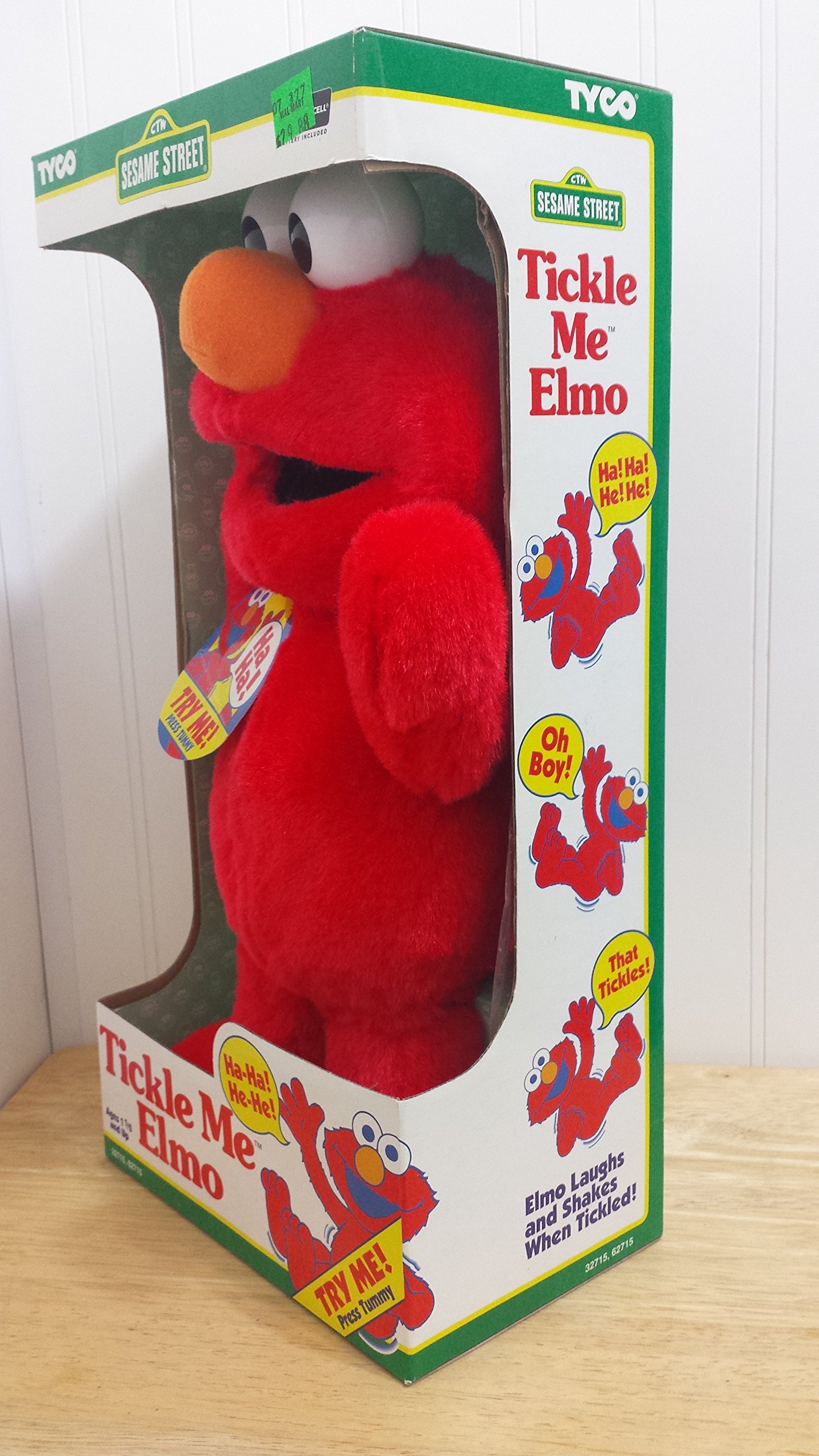 The original 1995 (release date 1996) vintage Tickle Me Elmo 15 inch plush doll that giggles, talks and shakes when squeezed on his side. Covered in red faux fur.