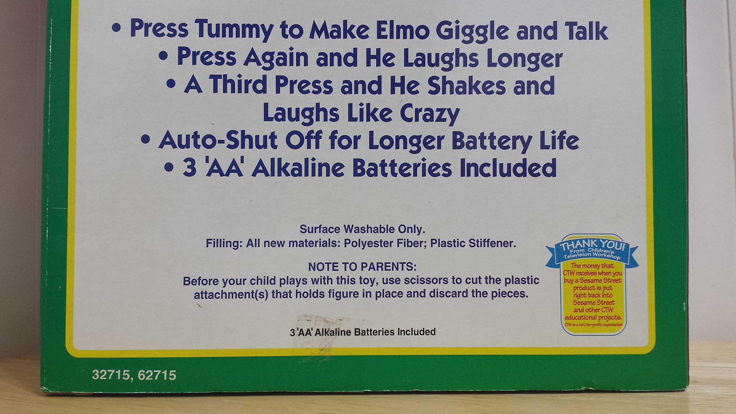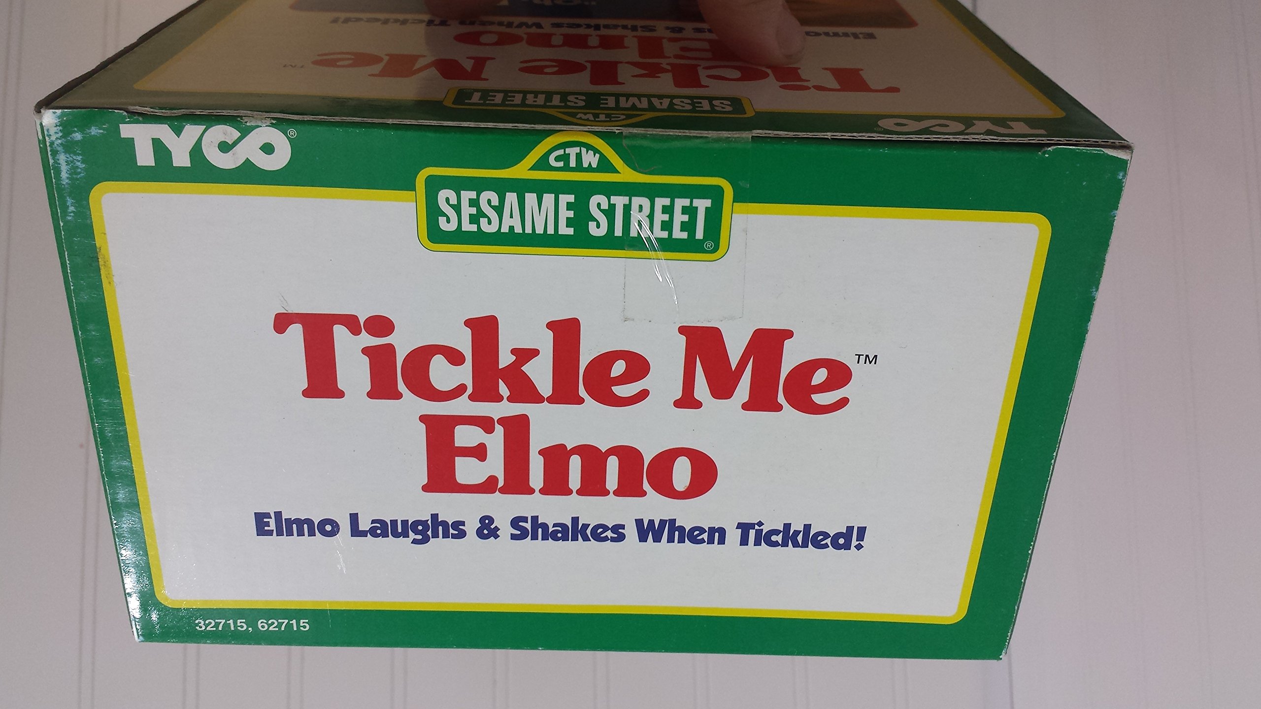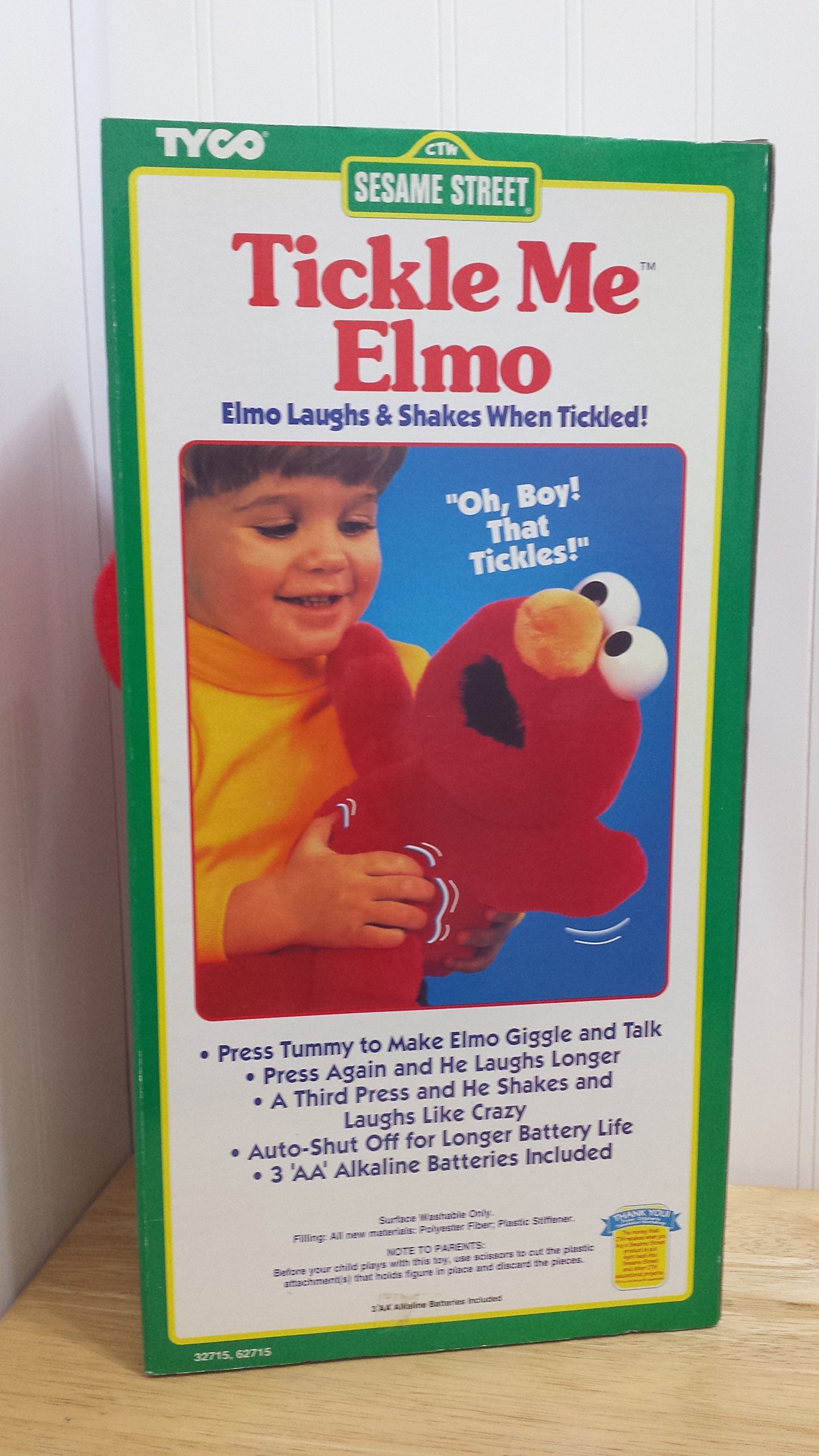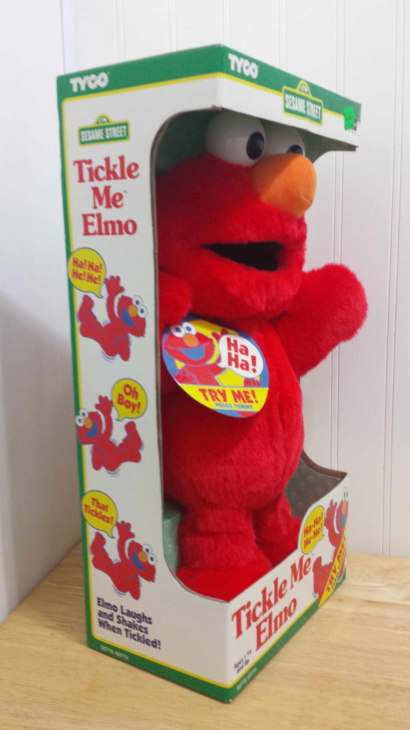 The original 1995 (release date 1996) vintage Tickle Me Elmo 15 inch plush doll that giggles, talks and shakes when squeezed on his side. Covered in red faux fur.
