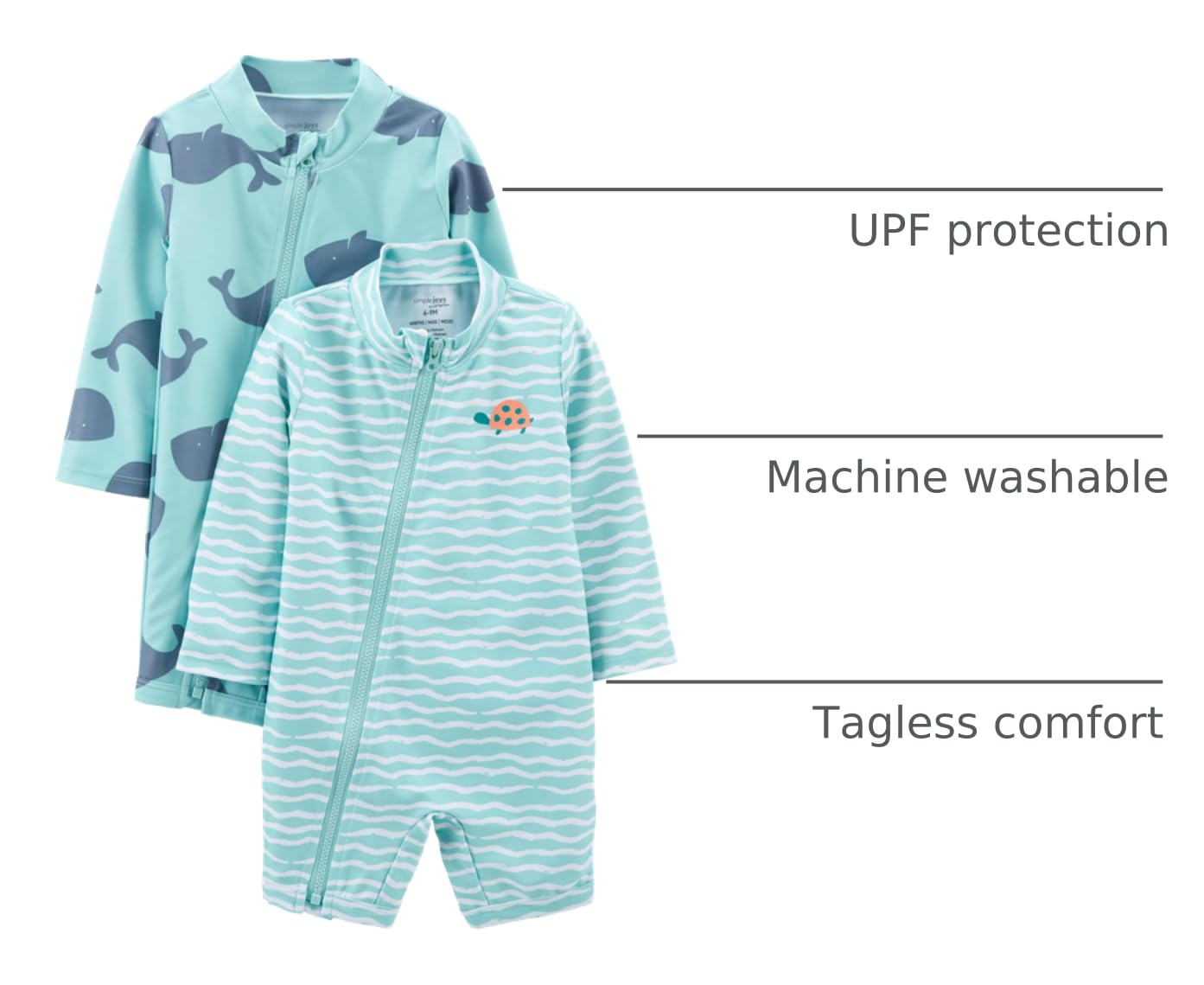 Description This 2-Pack One-Piece Long Sleeve Zip-Up Rashguard Swimsuit for Boys from Simple Joys by Carterβs combines comfort, protection, and playful style for the ultimate summer gear. Designed with fun, vibrant prints and colors, it will keep your little one excited for every swim. The UPF 50 rating offers excellent sun protection, ensuring that they stay safe from harmful UV rays while enjoying the outdoors. Featuring a full zip closure for easy on-and-off, this swimsuit provides a snug fit with added convenience. The long sleeves provide extra coverage, making it perfect for days at the beach, pool, or any water activity. Whether splashing around or lounging under the sun, this rashguard swimsuit is the ideal choice for active boys who love to make a splash!