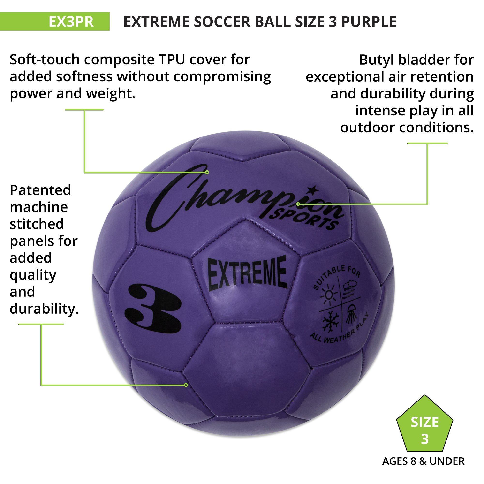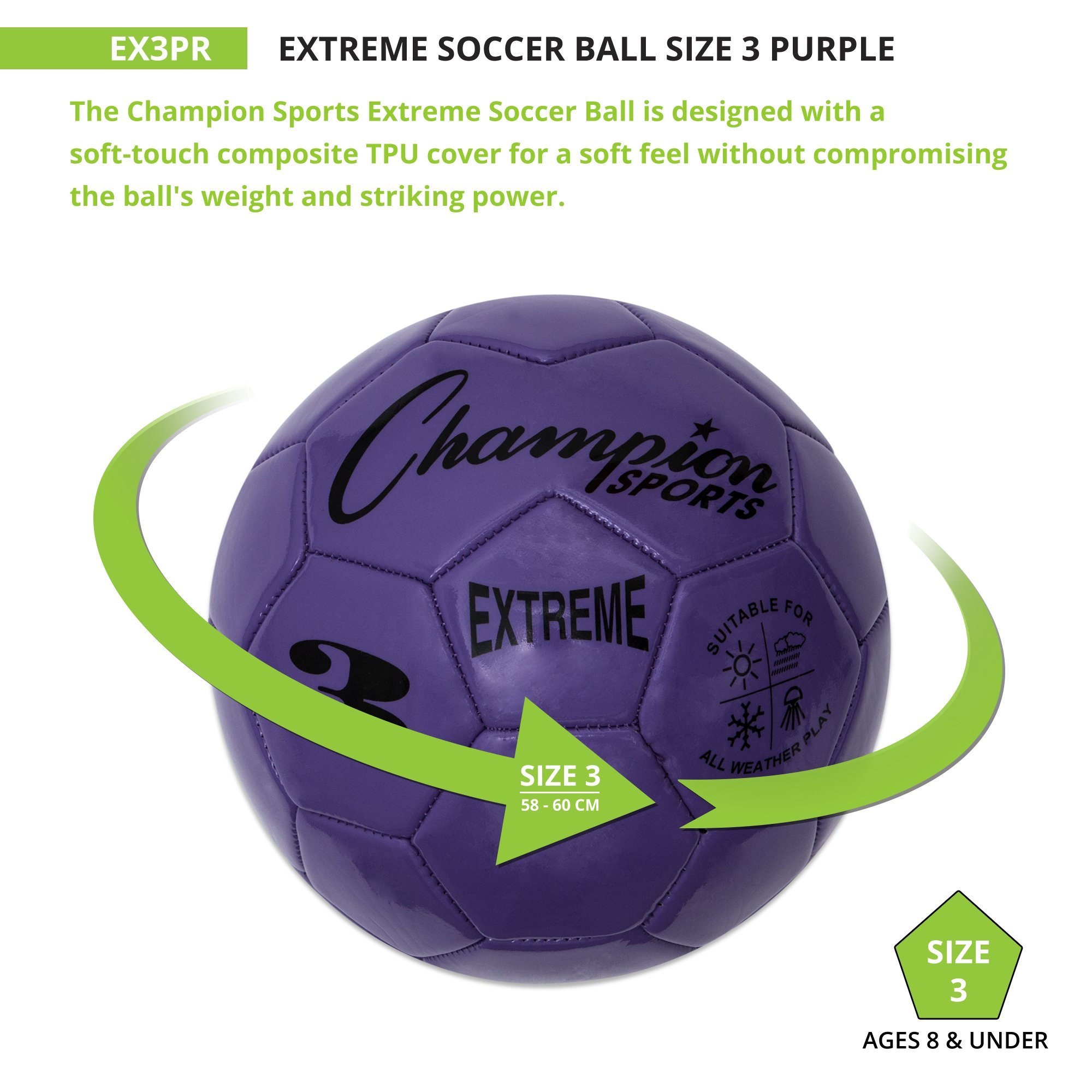 The Champion Sports Extreme Soccer Ball is a Durable, All-Weather Ball for Competition & Training. Built for both competitive matches and casual play, the Champion Sports Extreme Soccer Ball is designed to perform in any weather. Its soft-touch TPU cover provides a comfortable feel for dribbling, passing, and striking, while maintaining the weight and power needed for accurate shots. Engineered for durability, this high-quality soccer ball features a butyl bladder for superior air retention and machine-stitched panels for long-lasting performance. Whether you're playing in the heat, cold, wind, or rain, this ball maintains its shape and reliability. Available in three sizes: EX3 (Size 3): Ages 8 & under, EX4 (Size 4): Ages 8 to 12, and EX5 (Size 5 – Official Size): Ages 12 & up. Choose from a variety of vibrant colors, including Red, Orange, Yellow, Green, Blue, Purple, Black, Silver, and Pink. Note: Ball ships deflated. Pump sold separately.
