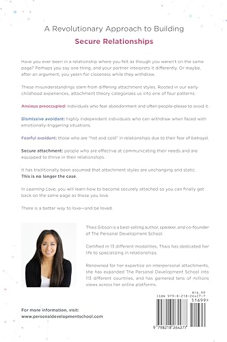Have you ever been in a relationship with someone and felt like you’re not on the same page? You say one thing, but your partner hears another? Or, after a big fight, you yearn for closeness but they want to withdraw? Or maybe it’s the other way around? These disconnects can be attributed to a difference in what are called “attachment styles.” Attachment styles refer to how childhood experiences shape our adult relationships and how these early bonds impact future connections. In the past, a person’s attachment style was considered unchangeable, but this is not the case. You don’t have to feel as though relationships are impossible, with so many things left unsaid and misunderstood. You can heal your attachment style for good, changing the way you relate to everyone around you. In this revolutionary book, relationship expert Thais Gibson will help you discover how to build secure relationships in less than 90 days and transform your life from the inside out. In Learning Love, you will learn the process of building fulfilling and fail-proof relationships that have you on the same page with the people you care most about. There is a better way to love―and be loved. And it all starts with you.