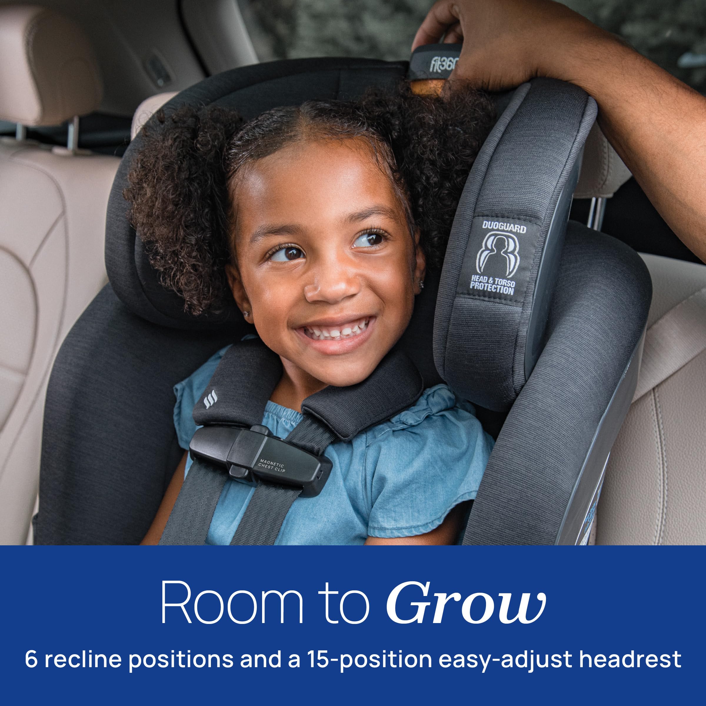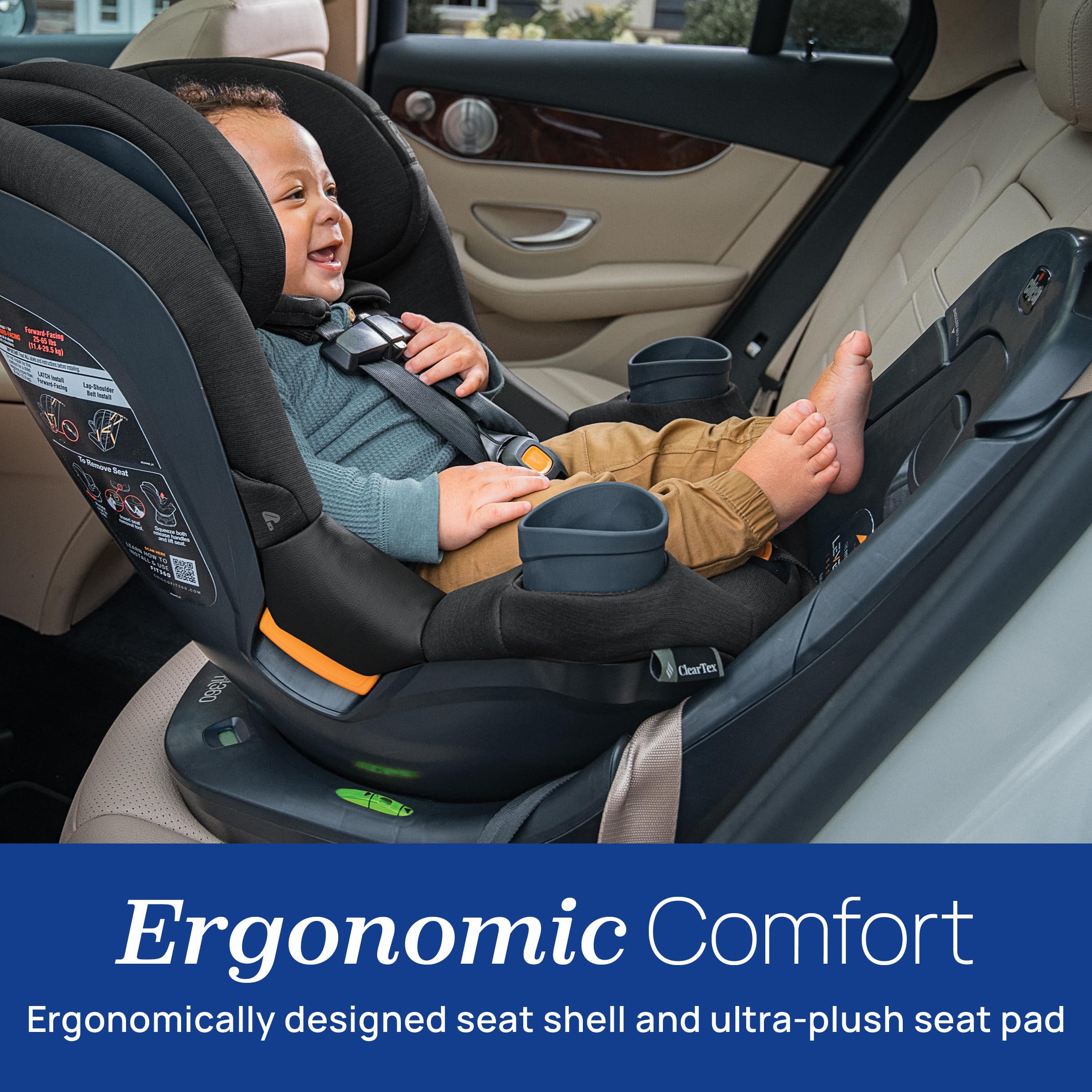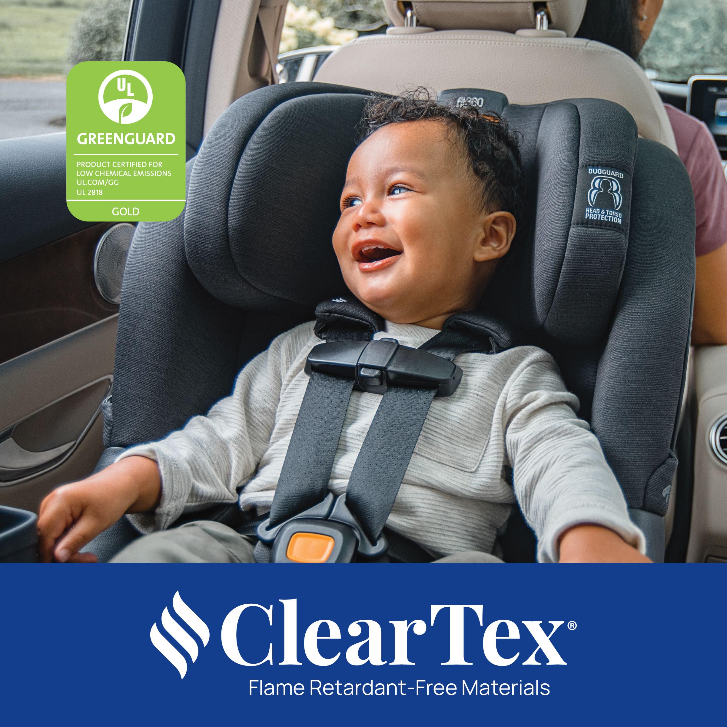 Make Every Day Easier The Fit360 ClearTex Rotating Convertible Car Seat is the all-around easiest-to-use rotating car seat, thoughtfully designed to make every day travel easier. The 360Β° one-hand rotation provides an optimal experience to comfortably secure your child in the seat and just as comfortably remove them from the seat when your ride is complete. Built to bring your child closer to you when buckling and unbuckling, Fit360 is also enhanced with an innovative Quick Secure Harness System including a magnetic chest clip, flex-forward buckle, 15-position easy-adjust headrest and easy-flow harness. The Fit360 provides the all-around best 360 car seat experience starting face-to-face for easy loading and unloading, and then turning to rear-facing (4-40 lbs.) or forward-facing (26.5-65 lbs.) when youβre ready to ride. Installing the Fit360 into your vehicle is as simple as open-route-close with innovative LeverLock seat belt installation. Open the LeverLock door on the Fit360 base and route the seat belt using the easy-access belt guides. The carβs shoulder and lap belts follow their natural path through the guides for trouble-free belt routing. The built-in LeverLock self-tensioning lock system offers superior stability with three points of contact for continuous use from rear-facing (4-40 lbs.) through forward-facing (26.5-65 lbs.) usage. By simply closing and latching the LeverLock door, the vehicle belt is tightened in a way that eliminates any movement from front-to-back or side-to-side. This provides a secure installation with minimal effort, ensuring reliable stability over time. Install with Confidence Two RideRight bubble level-indicators work in tandem with the 6-position ReclineSure leveling system to provide improved vehicle fit and child comfort. Once the base is securely installed in the vehicle and the seat is attached to the base, the red or green ready-to-ride indicators found on both sides of the base clearly indicate if the seat is properly positioned (green) or not (red) for travel in a moving vehicle. Everyday Comfort The ergonomic seat shell combined with the ultra-plush seat pad, supports your child in a natural seated position and provides enhanced comfort as they grow. The Fit360 base is equipped with six recline positions that allow you to select the ideal seating angle during installation that will provide peace of mind throughout the duration of use. Featuring ClearTex flame retardant-free materials, Fit360 rotational car seat is GREENGUARD Gold Certified for low chemical emissions, contributing to healthier air quality around your child. Everyday conveniences include machine-washable fabrics for easy cleaning and two flexible, removable dishwasher-safe cup holders. Everyday Ease The quick-secure harness system features a 15-position, easy-adjust headrest that, when adjusted, simultaneously also adjusts with the harness height. The flex-forward crotch buckle stays auto-positions to ensure it is out of the way for easy child loading and harness pockets keep straps and buckles contained until ready for use. The quick-secure magnetic chest clip offers easy in and out without the fuss. Everyday Protection Offering two layers of protection, DuoGuard features a steel-reinforced frame, a deep rigid shell and EPP energy-absorbing foam that surrounds the head and torso. A removable head and body support for newborns (4-11 lbs.) makes the Fit360 ready to go from day one. From installation to in and out, the Fit360 ClearTex Rotating Convertible Car Seat is the all-around easiest, every day, wherever the day takes you.