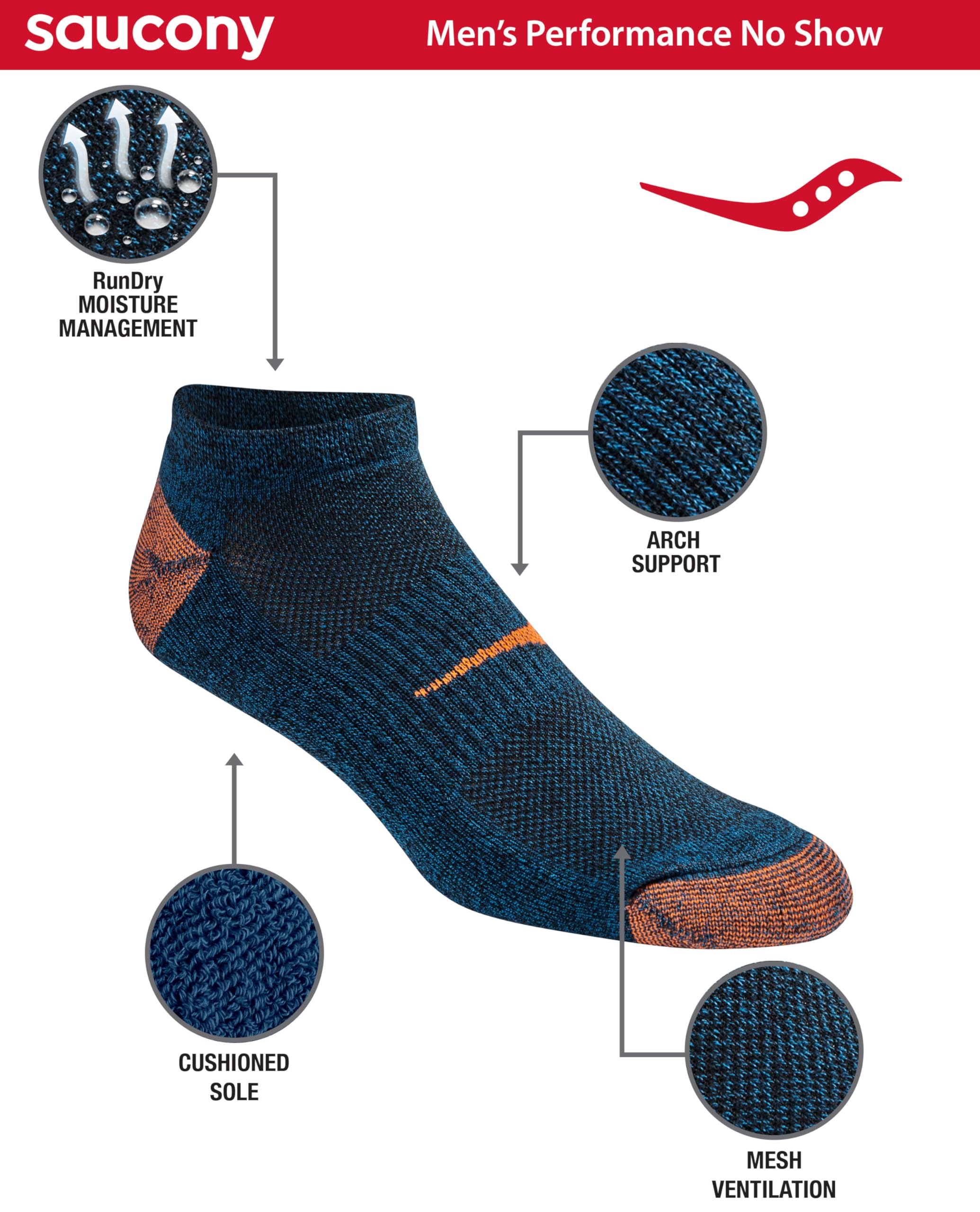 Description Saucony men's performance no show socks is a perfect combination of comfort and support. Great for the toughest training sessions. Its arch support, air mesh venting, and moisture management features will ensure lasting comfort Run for Good - Saucony was founded way back in 1898. Ever since, we have been loyal to the sport, building goodness into every product and inviting millions around the world to run with us. At Saucony, we exist for runners, Runners inspire us, bringing us new idea, force us to be better, they drive our design and engineering. They keep us competitive. They keep us hungry. They keep us honest. This focus and passion fuels us as we strive to create the best running shoes and apparel on the planet. We leave work each day knowing we’ve done everything to make runners live just a little better.