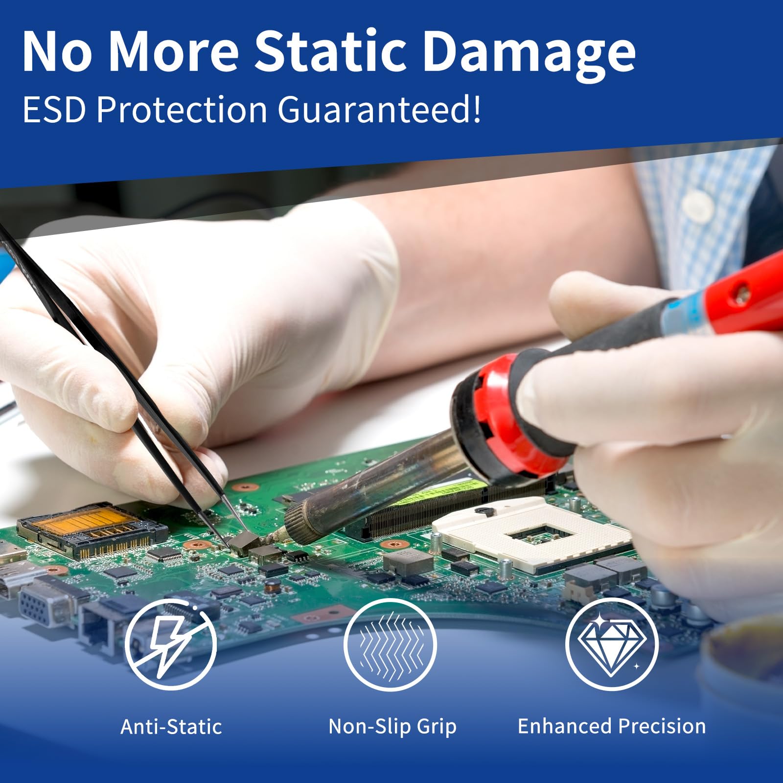 【Anti-static & Anti-slip】 The kit aim to meet the requirements of the electronics. Every tweezers is plated resistive ESD coating, which prevents static damage to electronic components. Resistive ESD coating helps to protect electronics from static. Its high hardness is perfect for precise operation like circuit board welding or watches repairing. The cover of tweezers takes anti-slip treatment to make your work easier.