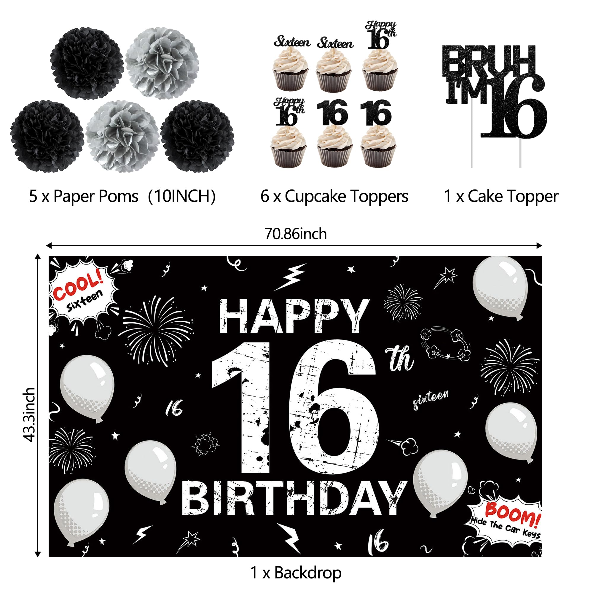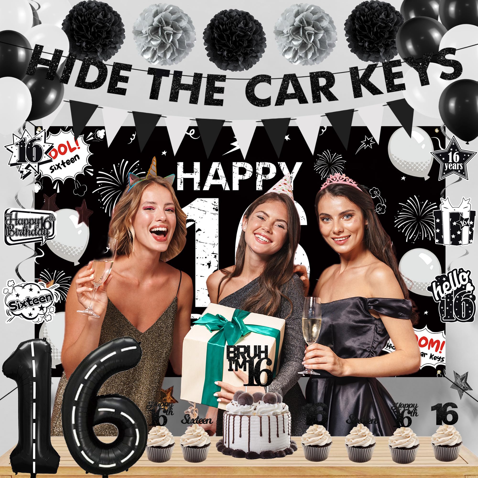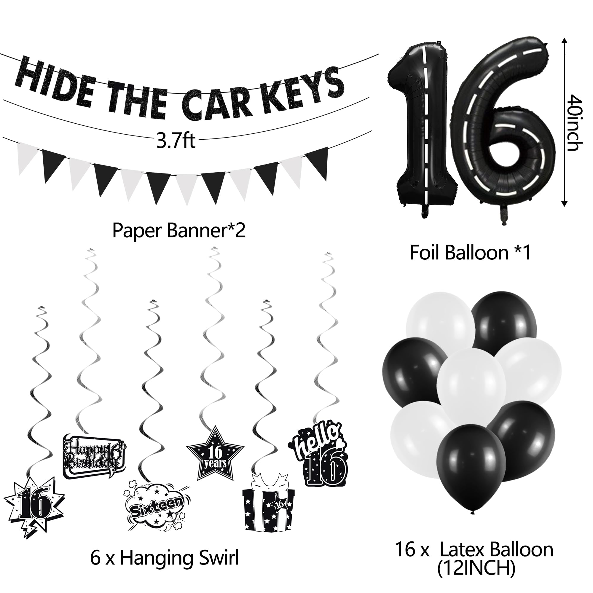 【16 Birthday Decorations Kit Includes】: 16pcs 12 inch latex balloons, 2pcs 40 inch 16 size aluminum foil balloons (no helium support), 1pcs "Hide Your Car Keys" birthday banner, 1pcs black white triangle pull flag, 5pcs paper flower balls, 6pcs black white 16 year old card spiral hangers, 1pcs 16 year old birthday cake topper, 6pcs cupcake toppers,1pcs black Happy 16th Birthday background (70 X 43 inches). This 16th birthday decoration set will add a surprise to the birthday party of a 16-year-old girl.