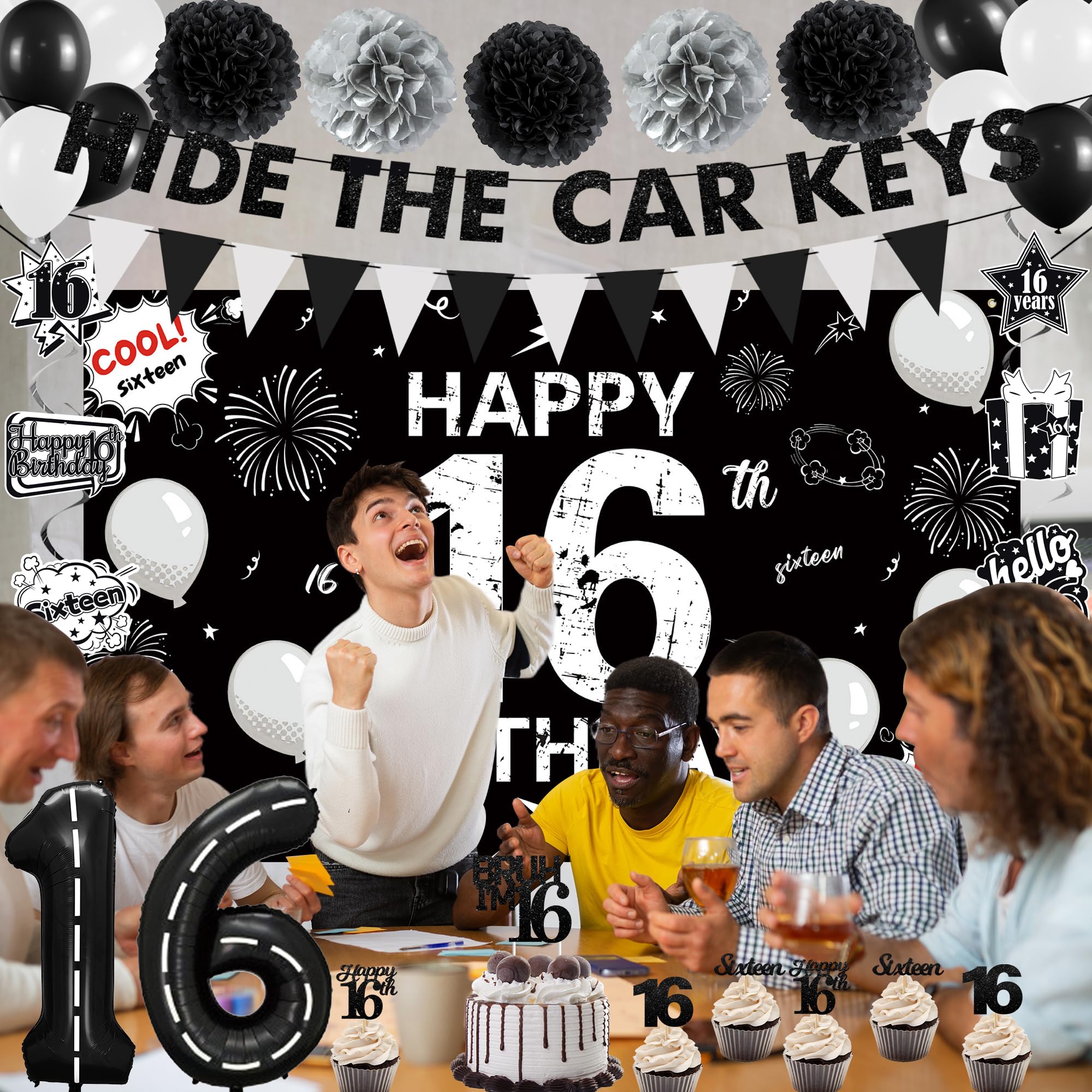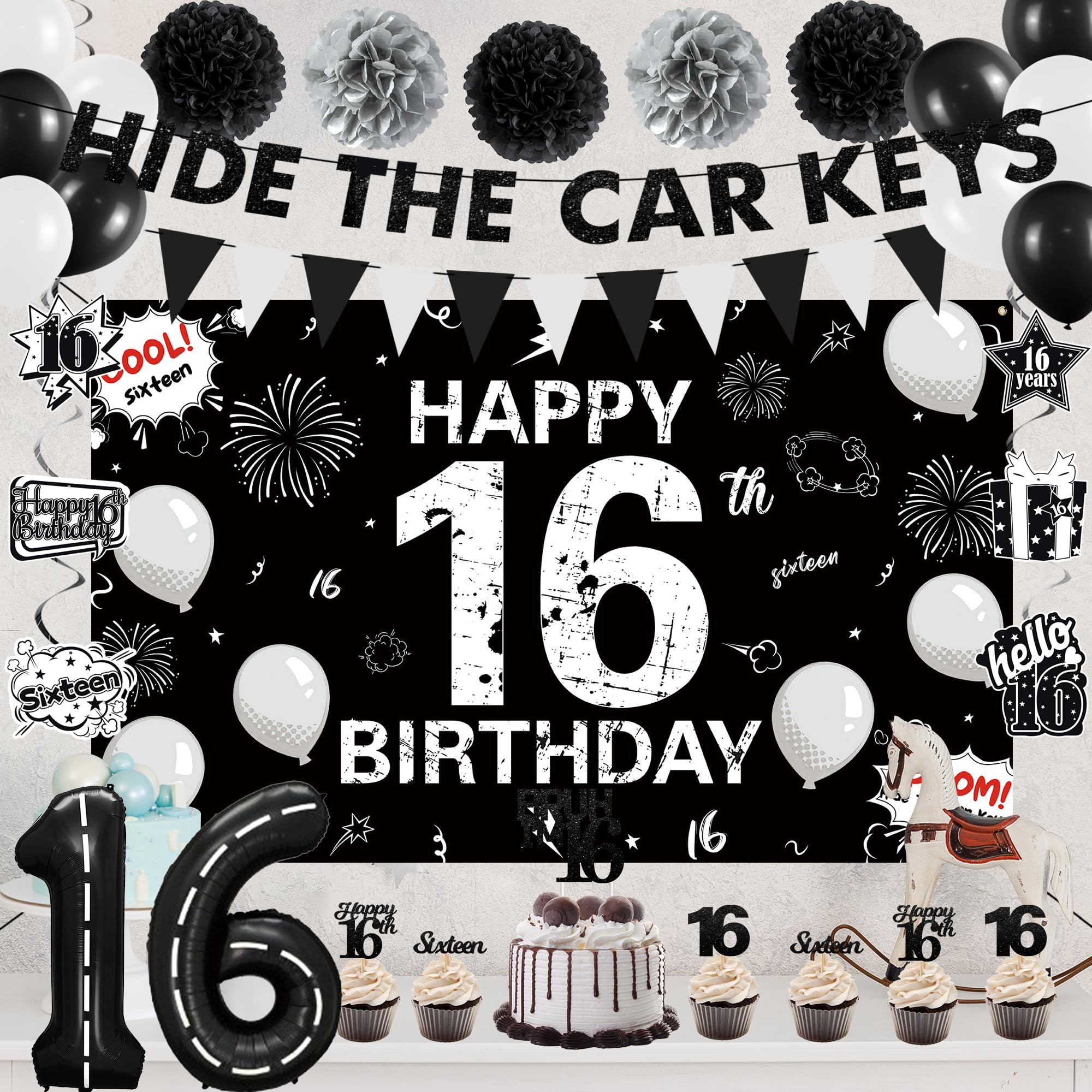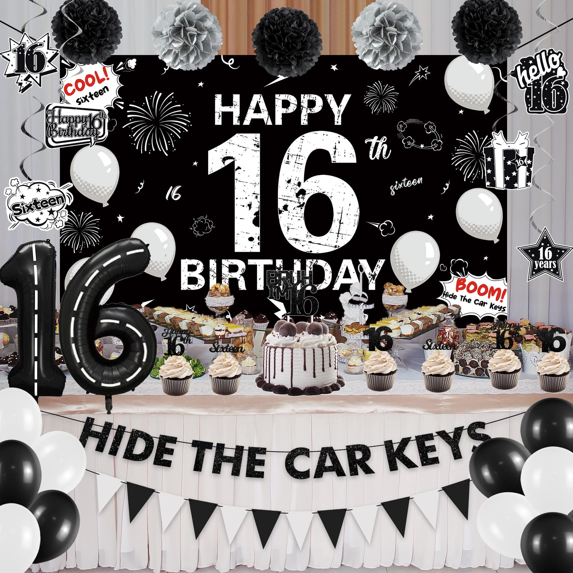 【Perfect Sweet 16th Birthday Gift】: Black white 16th birthday party set, suitable for both boys and girls' 16th birthday parties; can be used for indoor and outdoor, living room, bedroom, etc. Getting our birthday banner, "Hide your car keys" Banner and 16 year cake top will add a lot of fun to your 16th birthday celebrations. It will be an unforgettable 16th birthday to spend with your friends and family.