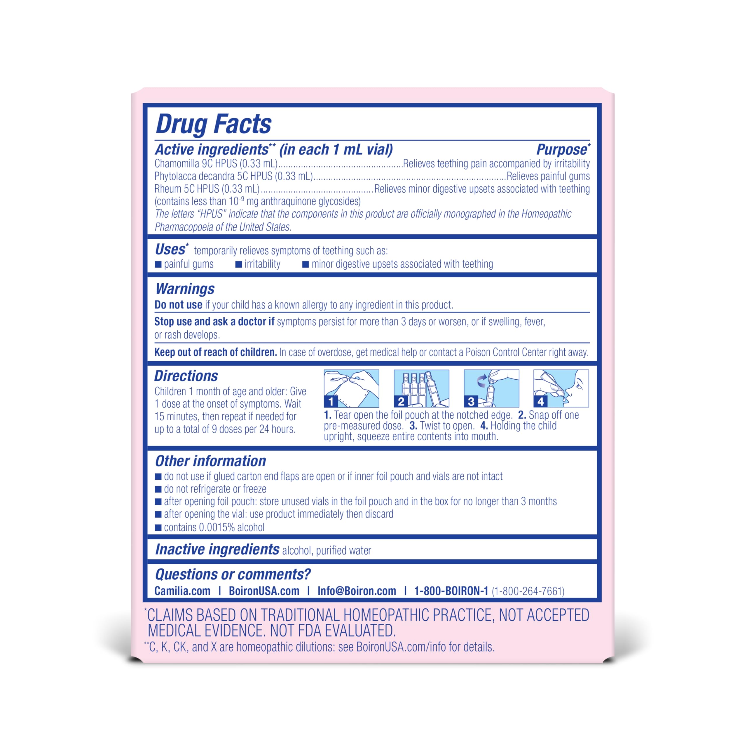 About Camilia Teething Drops: Camilia temporarily relieves symptoms of teething, including painful gums and irritability, as well as minor digestive disorders sometimes associated with teething. Camilia has no known interaction with other medications, it is not contraindicated with pre-existing conditions, and there is no risk of overdose or numbing your baby's gag reflex. The sterile, single-use liquid doses are preservative-free and help to prevent contamination. They do not contain benzocaine, alcohol, flavors, dyes, lactose, sugar or artificial sweeteners. Available in a box of 10 and 30 doses, Camilia is recommended for babies one month and up and works best when taken at the first sign of teething. These "Uses" have not been evaluated by the Food and Drug Administration. Boiron Camilia teething medicine was recently awarded the Parent Tested Parent Approved (PTPA) Seal of Approval. With over 70, 000 parents, PTPA Media has North America's largest volunteer parent testing community. These independent parent volunteers evaluate products in their own homes to ensure that PTPA winners are chosen based on merit and consumer experience-not on commercial considerations. As a result, the PTPA Seal has quickly gained recognition as an international leader in certifying consumer products for quality, effectiveness and value. At Boiron, we believe there's more than one way to feel better. Since 1932, the Boiron family has been committed to providing quality medicines. As world leader in homeopathy, our passion is your health. Our promise is your satisfaction.