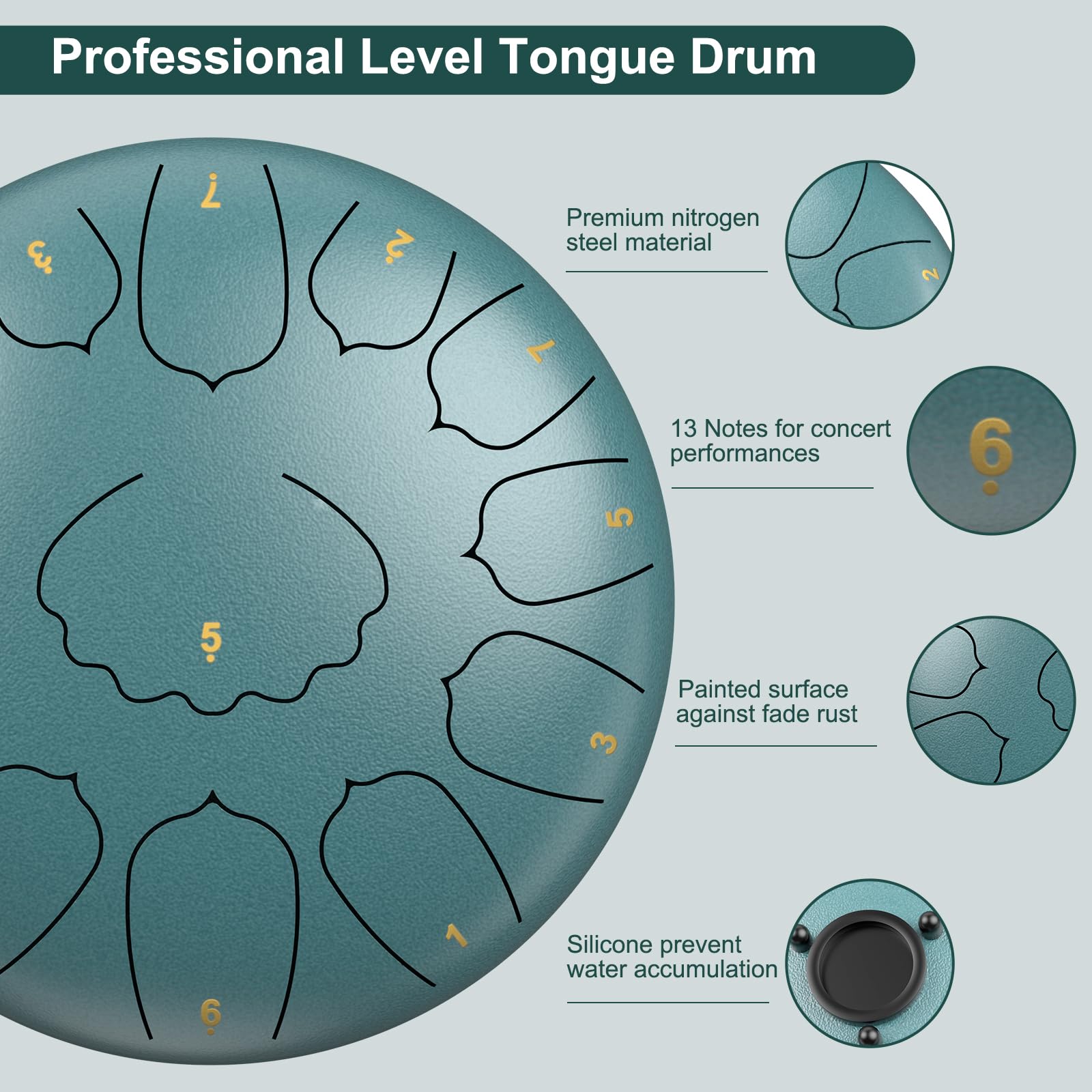 Larger Steel Tongue Drum: The steel drum features 13 tuned notes in D Major, offering a broad sound spectrum that allows for a variety of musical expression. When the drumstick beats the tongue and vibrates, the cavity resonates and makes a pleasant sound. The tone is beautiful, clear, and melodic. Bring a break from electronics.
