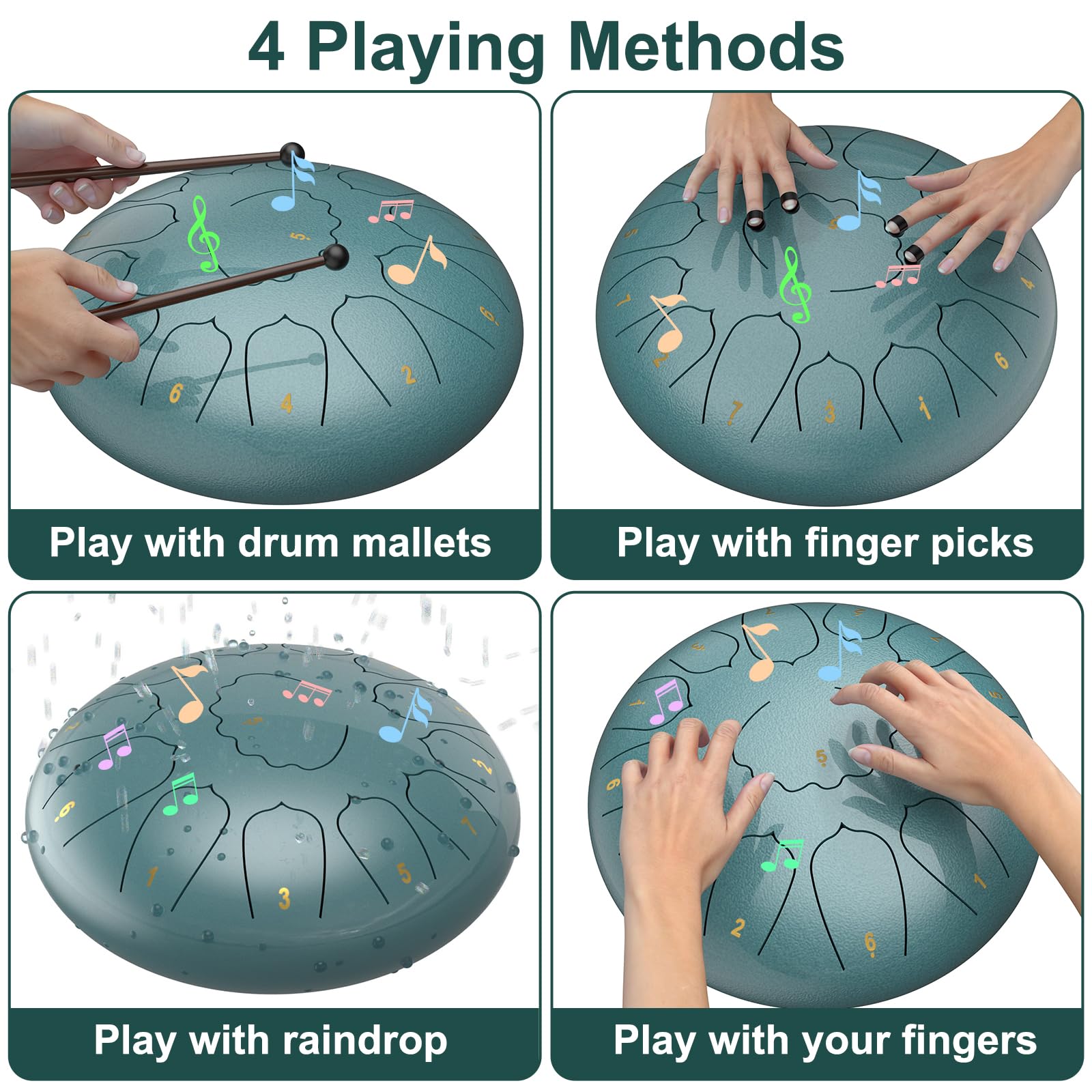 Easy To Pick Up: Whether you're a beginner or a seasoned musician, this rain tongue drum is designed for ease of use. Simply tap the hand pan drum rhythmically with the included mallets to create enchanting melodies. With the additional music book provided, you can start playing beautiful tunes even without any prior musical knowledge. It's a fantastic choice for music lovers of all ages!