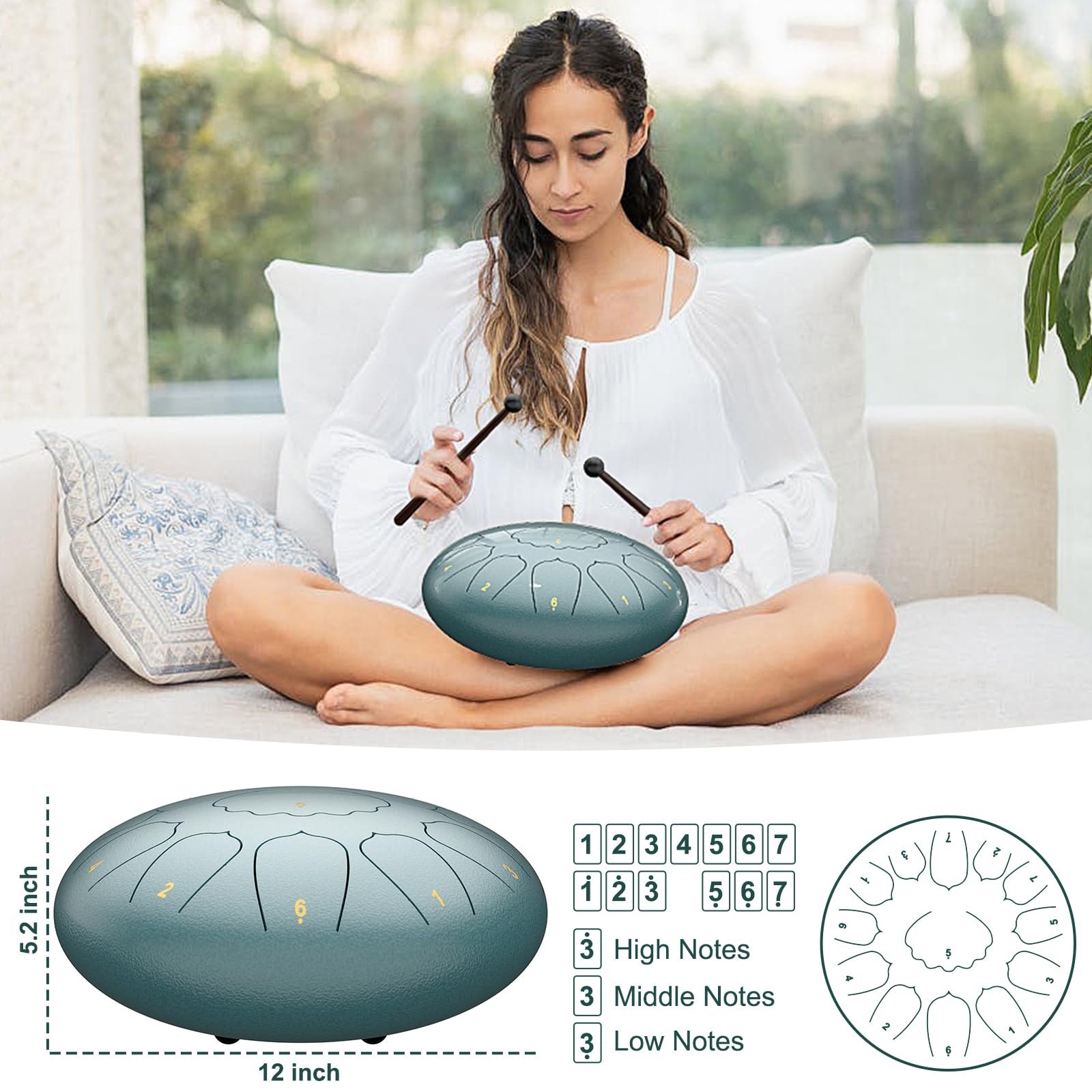 High-Quality Craftsmanship: This 12-inch handpan is made from premium carbon steel and coated with protective paint for exceptional corrosion and heat resistance. Each steel tongue drum is meticulously hand-modulated and accurately cut to ensure precise tones and harmonies, delivering a truly high-quality musical instrument.