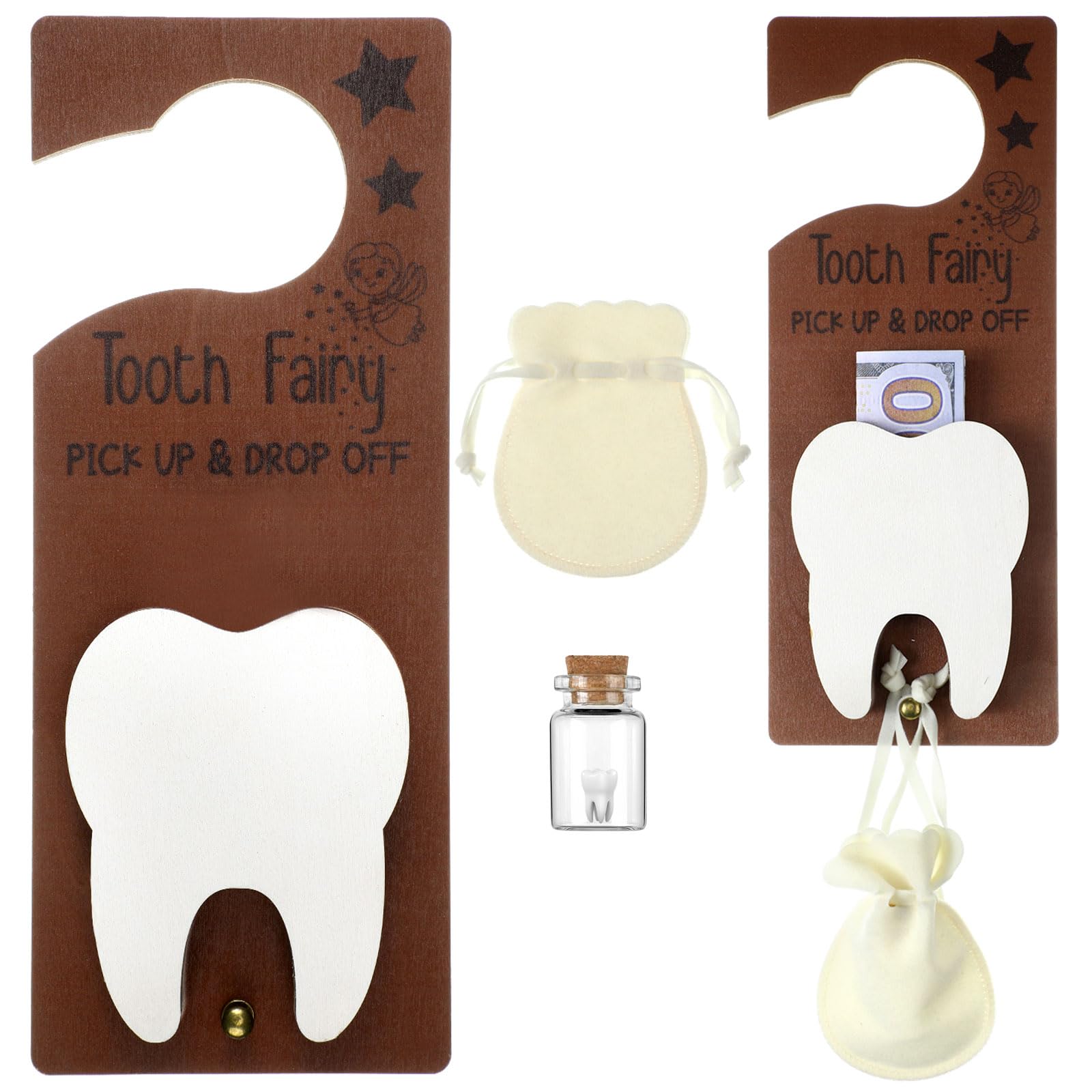 Durable Material Construction: this tooth fairy door hanger is made from wood material, offering durability and strength; The bag is crafted from burlap, offering an exquisite feel while ensuring the safe storage of your child's precious teeth; The bottle is made from glass and features a wooden cork, contributing to the set's overall classic design