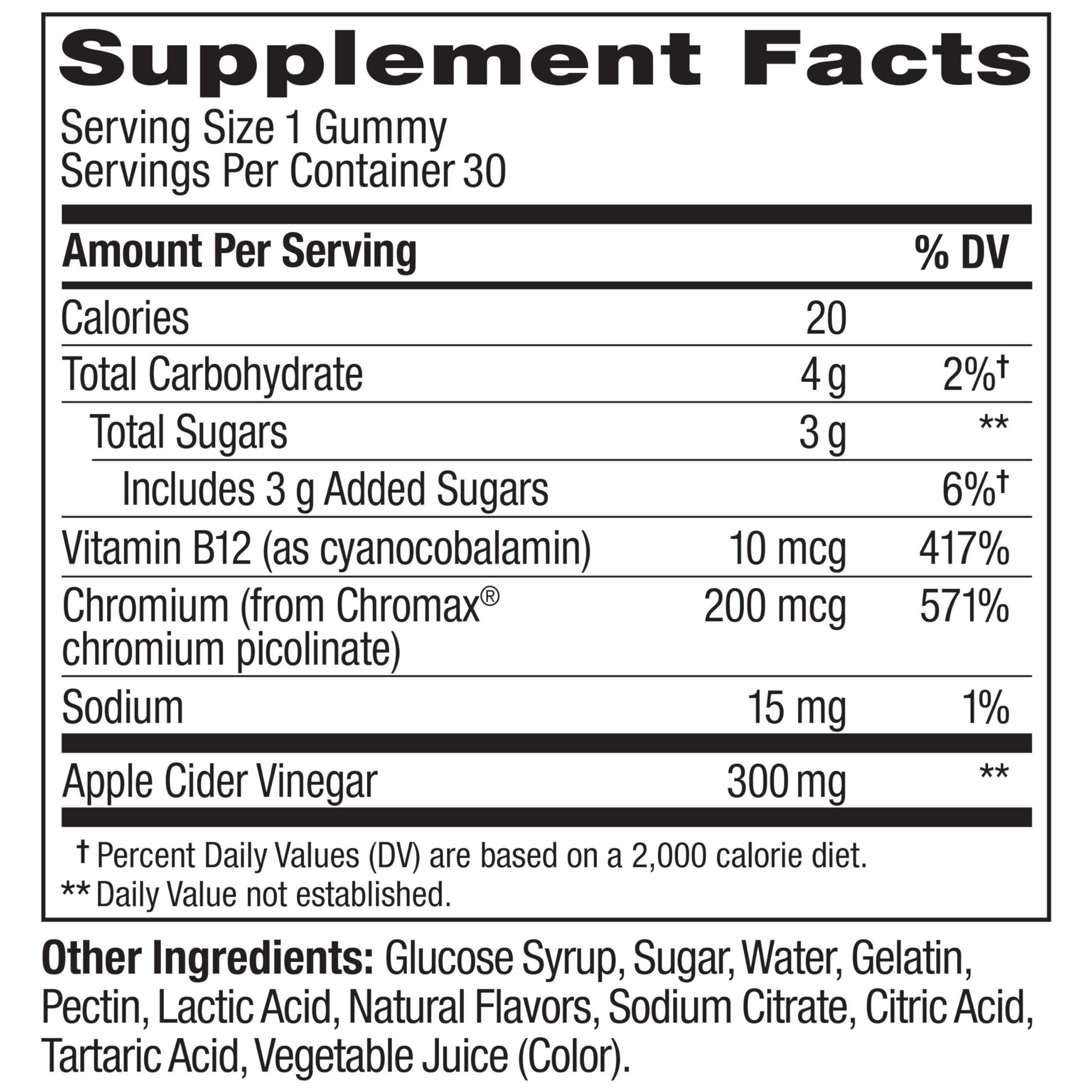 THE GOODS INSIDE: A clinically-studied amount of Chromium Picolinate to support lean body mass and help boost metabolism with Vitamin B12 for cellular energy production* and Apple Cider Vinegar with the Mother. With a healthy lifestyle, including exercise.