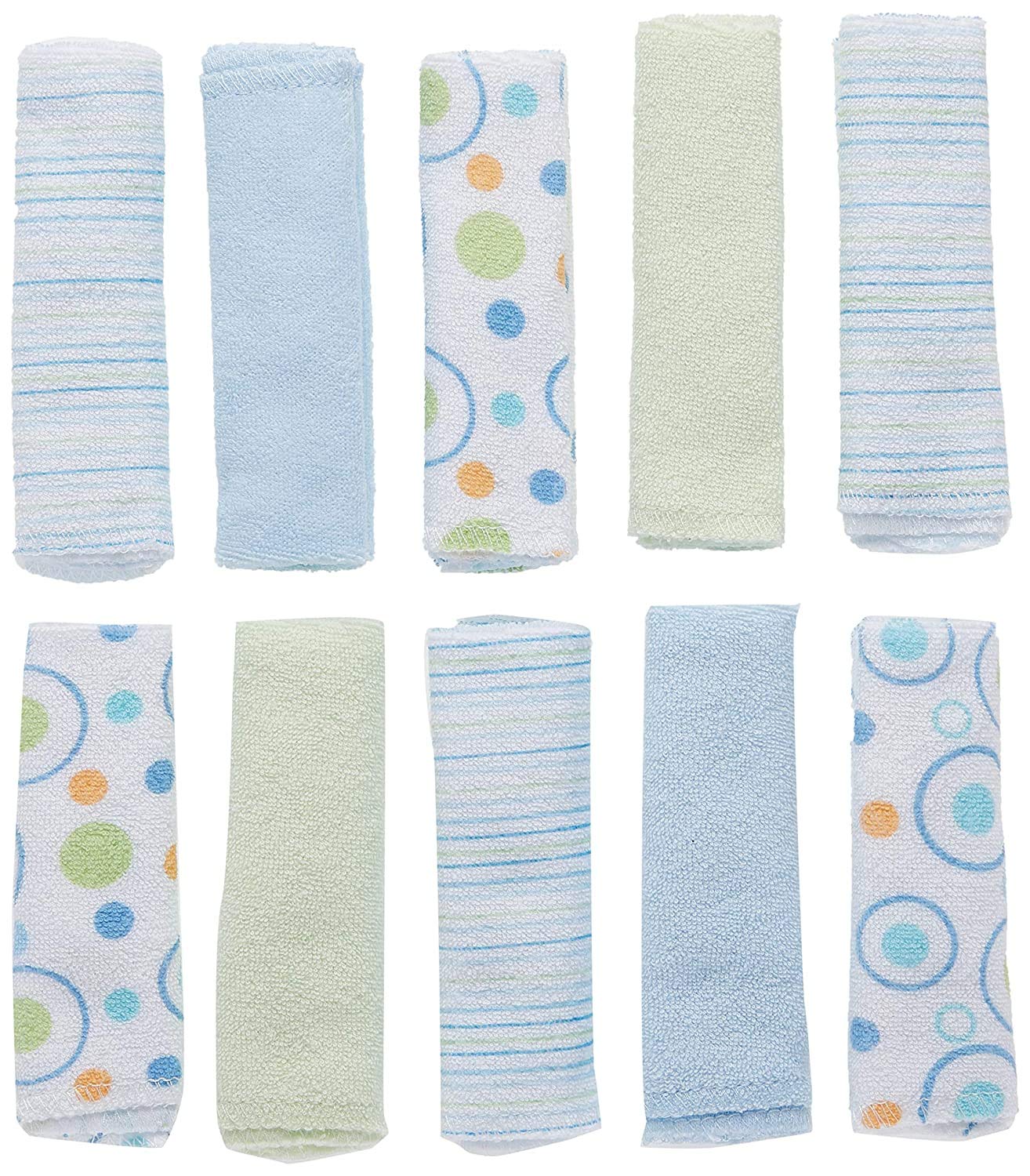 Blue Washcloth: The set of 10 washcloths come in a blue color with brightly colored circle prints and fun patterns that your baby will definitely love!