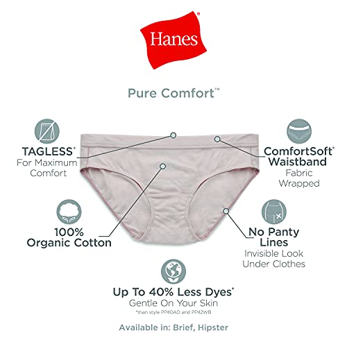 Description If you care about the fabric you wear and love the modern hipster silhouette, Hanes has the panties for you. These organic cotton hipster panties are made with 40% less dyes than traditional cotton so you can feel good about wearing them. You'll love that these smoothing cotton hipsters have a ComfortSoft cotton-covered waistband that won't pinch or bind. The silhouette is a hybrid with the low-rise waist of a bikini and the moderate back coverage of a brief, plus wider sides that sit at the hips. This lightweight underwear is wonderfully soft against your skin and super comfortable with leg bands that stay in place without riding up. Even better, they are tag-free for itch-free comfort.