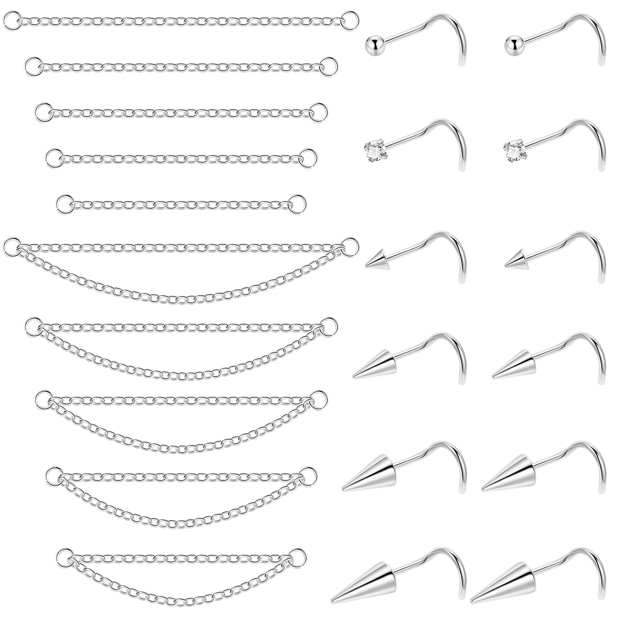 NOSE RING CHAIN SET:You will get 5Pcs nose chain, 5Pcs double nose chain and 6 pairs nose ring studs with different designs - ball nose studs, CZ nose studs, long spike nose studs. 3 colors - silver, gold and black - as well as 2 styles bar - L shaped bar and S-shaped bar- for you to choose