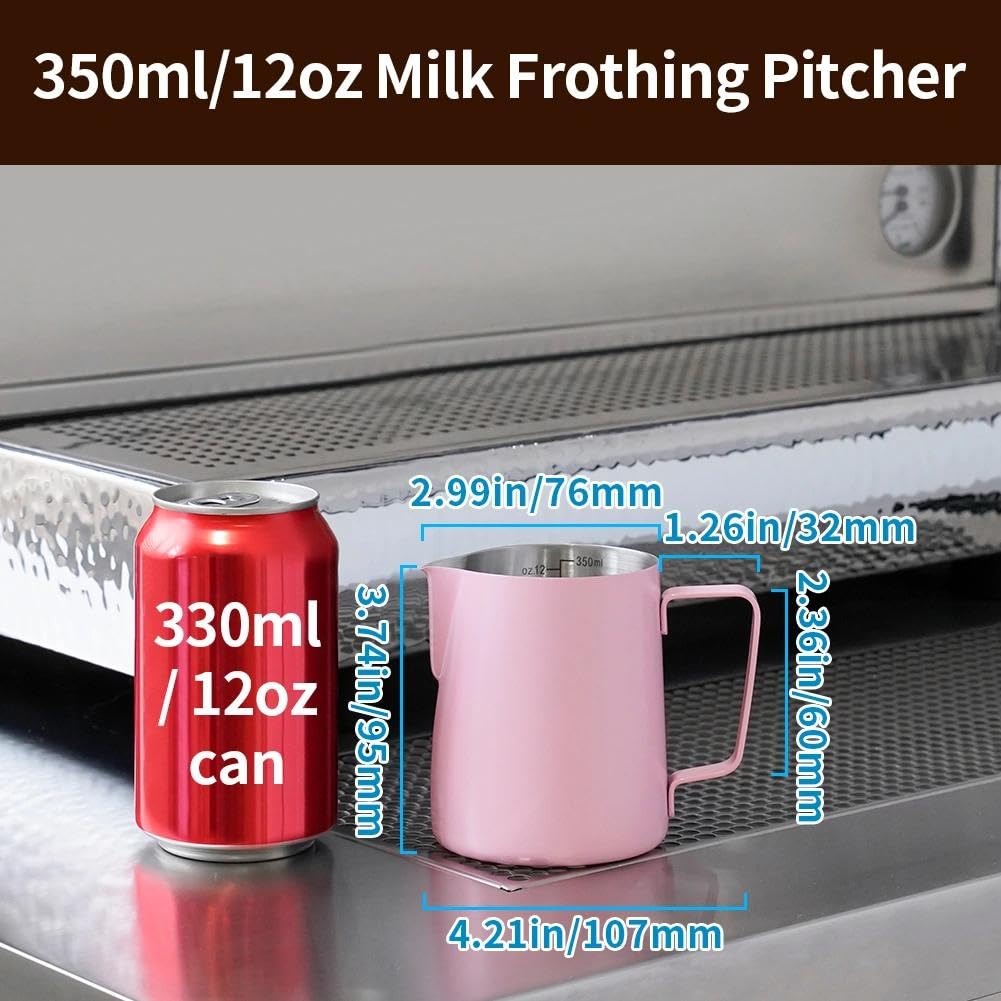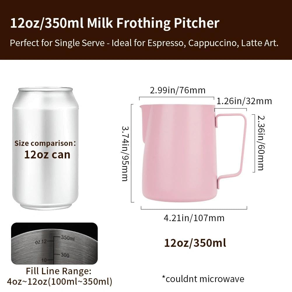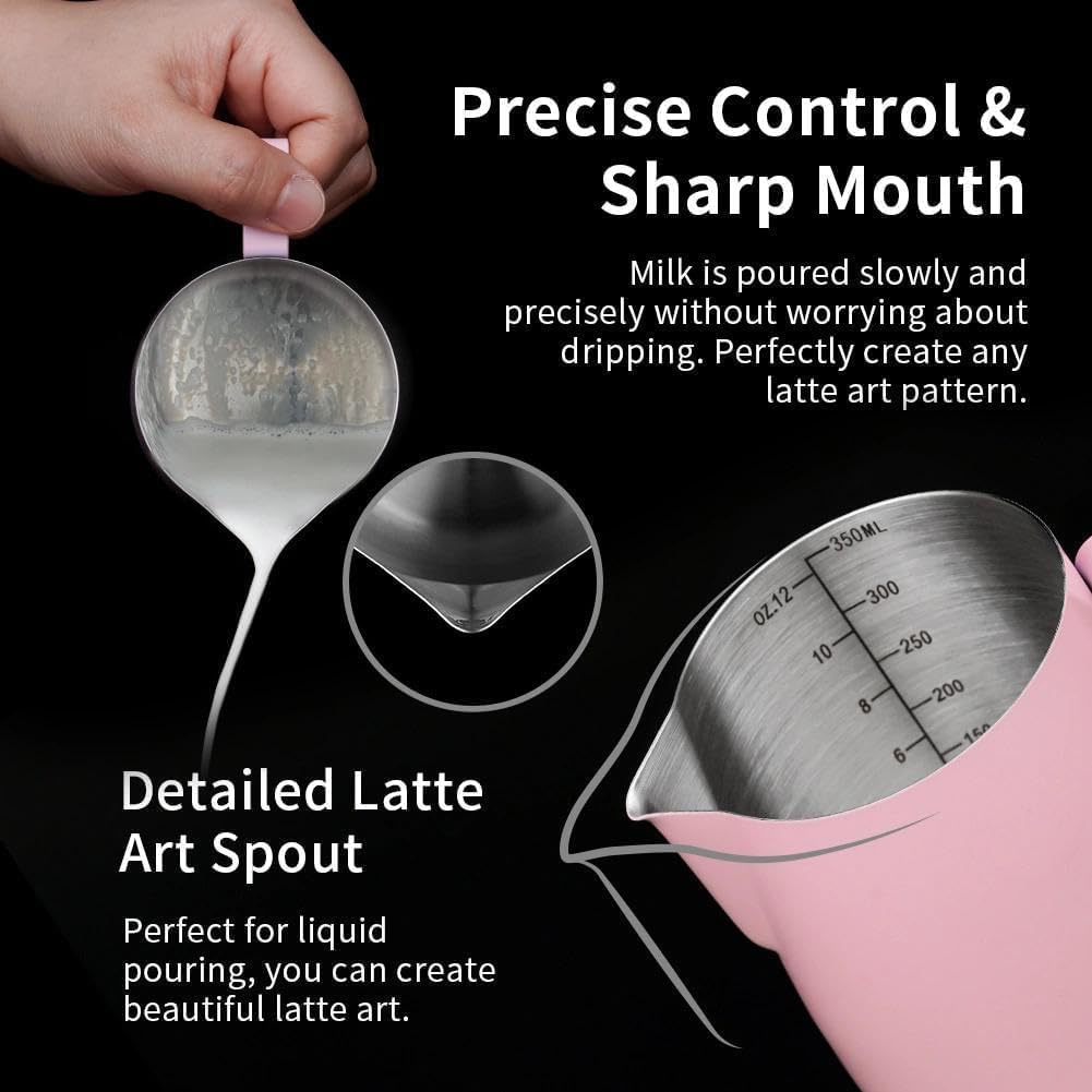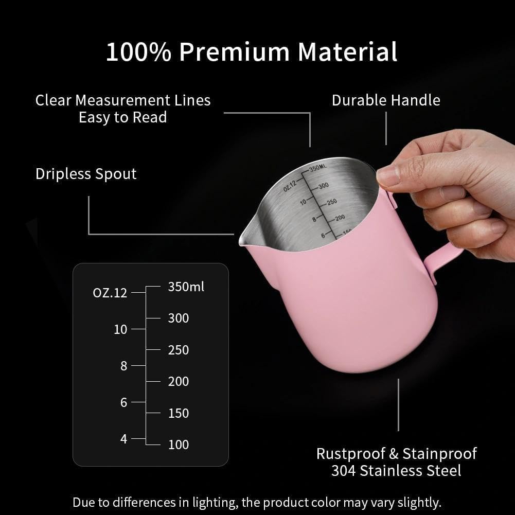 MAKE PERFECT LATTE ART: The milk pitcher ensures that the milk froth is poured slowly and precisely without dripping. Perfect frother cup for making frothing or steaming milk for espresso, cappuccino or hot chocolate. It provides you with a precious control of pouring, easy to create a perfect latte art! Perfect for both professional baristas and novice coffee lovers. PREMIUM MATERIAL: watchget milk frothing pitcher is made of food grade 304 stainless steel with Pink coating which is durable and sturdy, wear-resistant and heat resistant. Unbreakable for daily use and can serve you a long time. Easy to clean and use, it offers excellent temperature control. ERGONOMIC HANDLE: The handle provides with a easy grip and precise control of pouring speed and direction, beginner friendly. INSIDE SCALE LINES MEASURING: The milk pitcher has clear inside measurement lines(ml/oz), making it easier to control the amount of milk or cream per cup of coffee. 12oz/20oz milk frother pitcher can satisfied your different demands. Ideal for foaming or steaming milk, used in espresso and cappuccinos, it can be used for any liquid measuring like water, juices, batter mixes, smoothies etc. DRIPLESS SPOUT DESIGN: The dripless spout allows you pour milk foam smoothly and precisely without dripping. You can practice and create your own beautiful latte artwork easily! Please note that the volume indicated in the milk pitcher is only the maximum capacity, not the optimal capacity. Due to the need for frothing and other steps, it is not advisable to fill the pitcher too full.