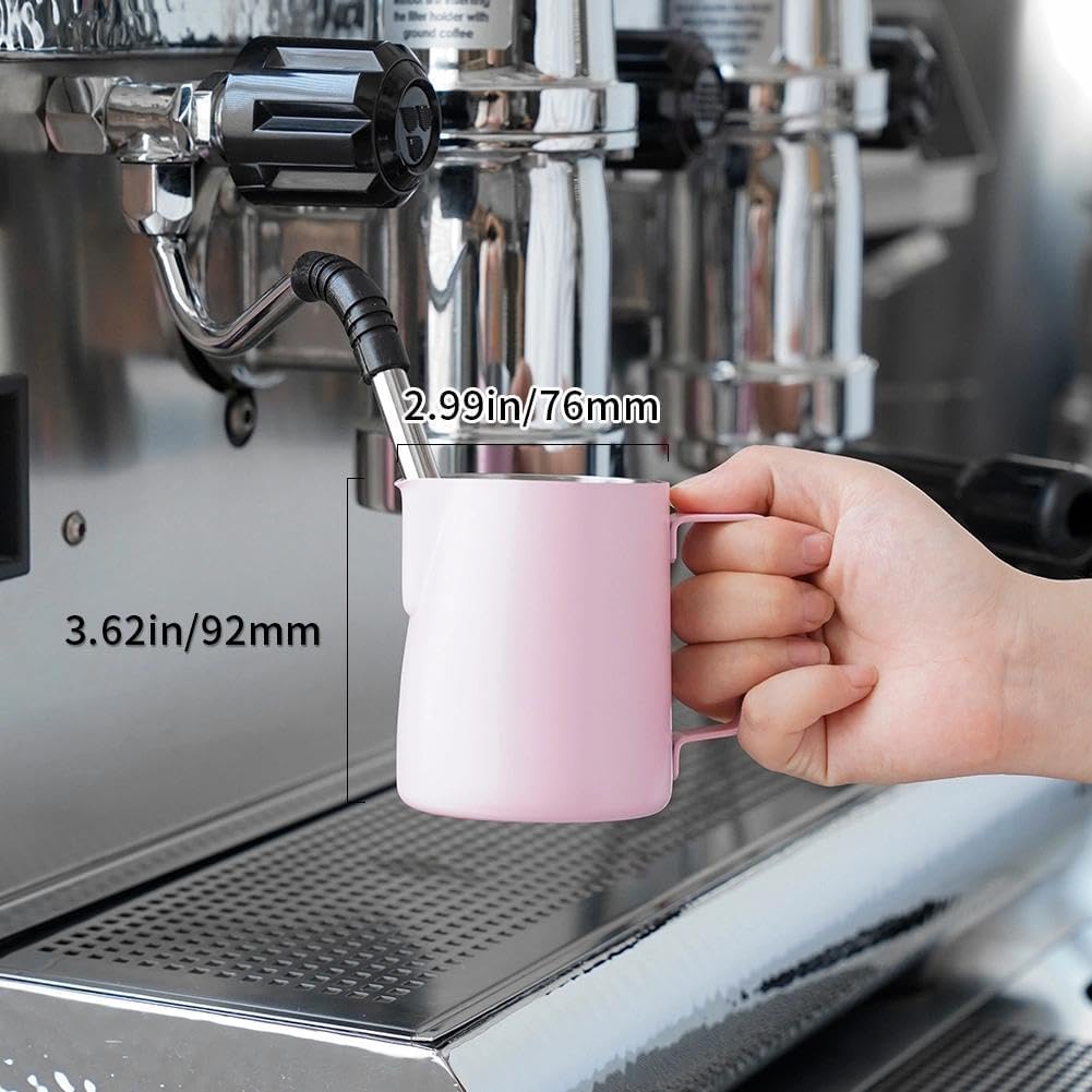 PREMIUM MATERIAL: watchget milk frothing pitcher is made of food grade 304 stainless steel with Pink coating which is durable and sturdy, wear-resistant and heat resistant. Unbreakable for daily use and can serve you a long time. Easy to clean and use, it offers excellent temperature control.