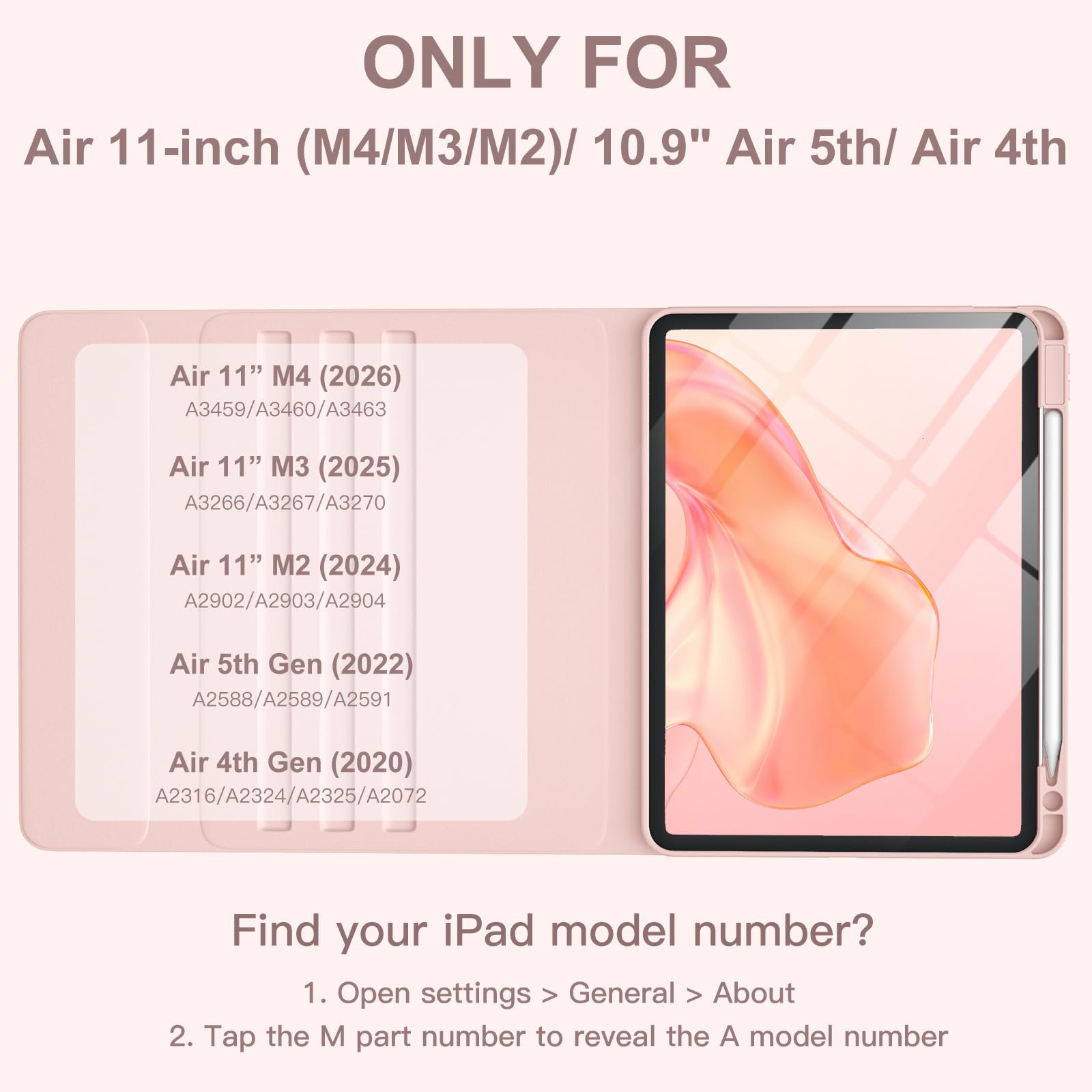 ❤【Compatibility】This air keyboard case is compatible for iPad Air 11-inch (M4) 2026 (Model Number: A3459/A3460/A3463), for iPad Air 11-inch (M3) 2025 (Model Number: A2902/AA2903/A2904), for iPad Air 11-inch (M2) 2024 (Model Number: A3266/A3267/A3270), for iPad Air 5th Generation (Model Number: A2588/A2589/A2591), for iPad Air 4th Generation 10.9 inch (Model Number: A2316/A2324/A2325/A2072). Not for other devices. Please be kindly check the model number No. starting with the letter "A" of your tablet back before order