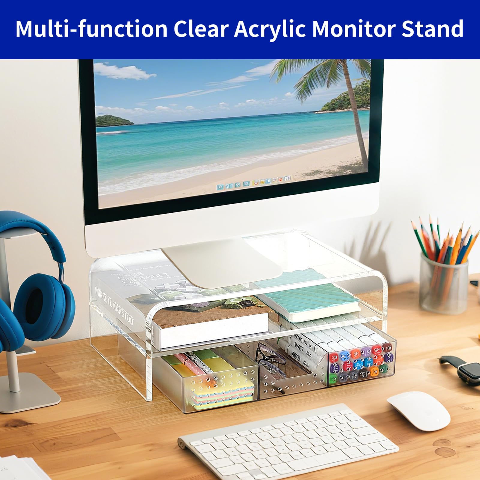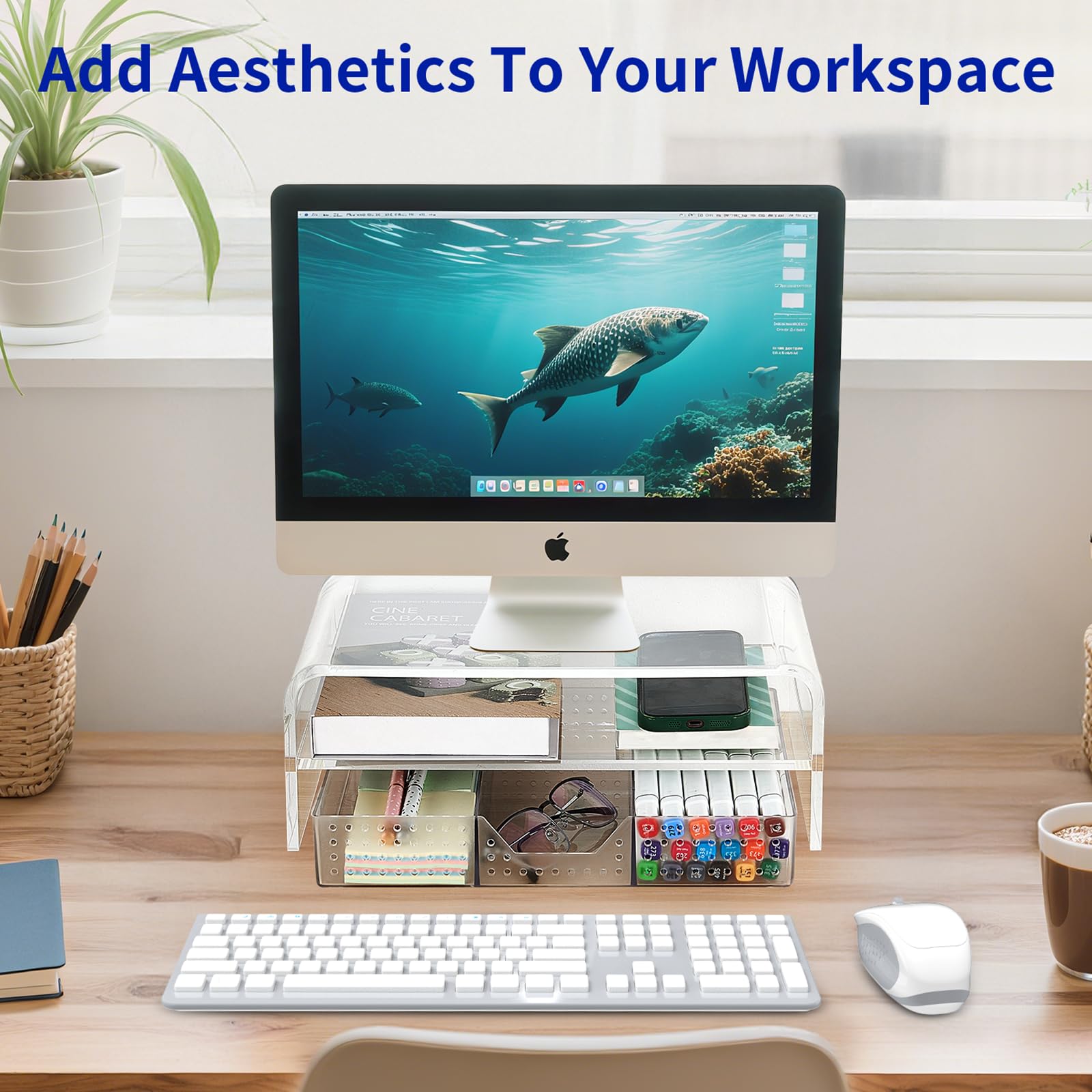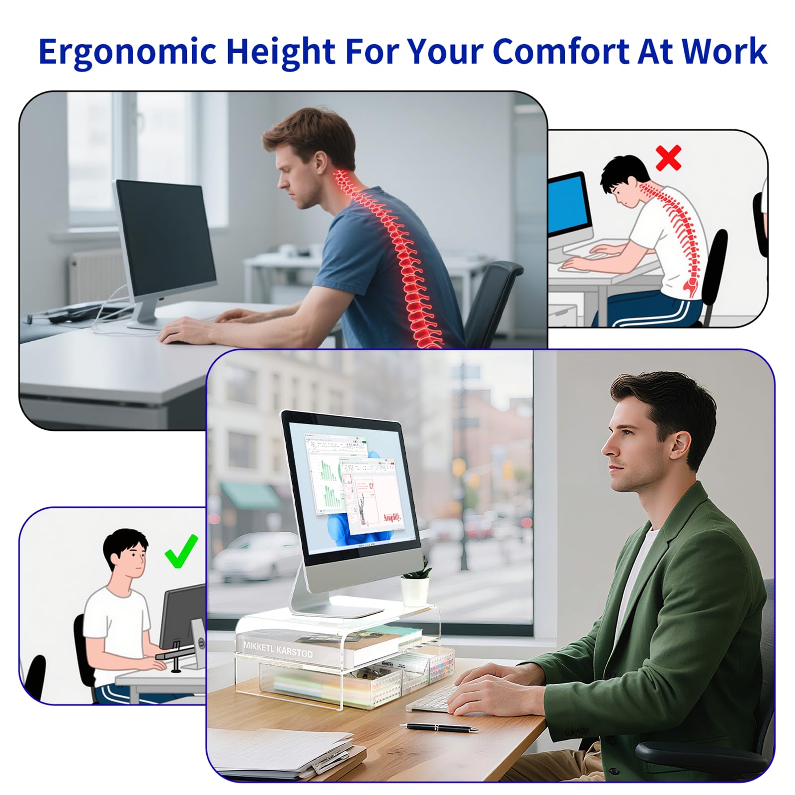 【Durable and Stable】:The crystal-clear acrylic computer stand is made of high quality material with sturdy construction, it can easily carry the weight of the display and computer accessories, to ensure stable and non-shaking for a long time, ideal for use in the office, dorm room or home