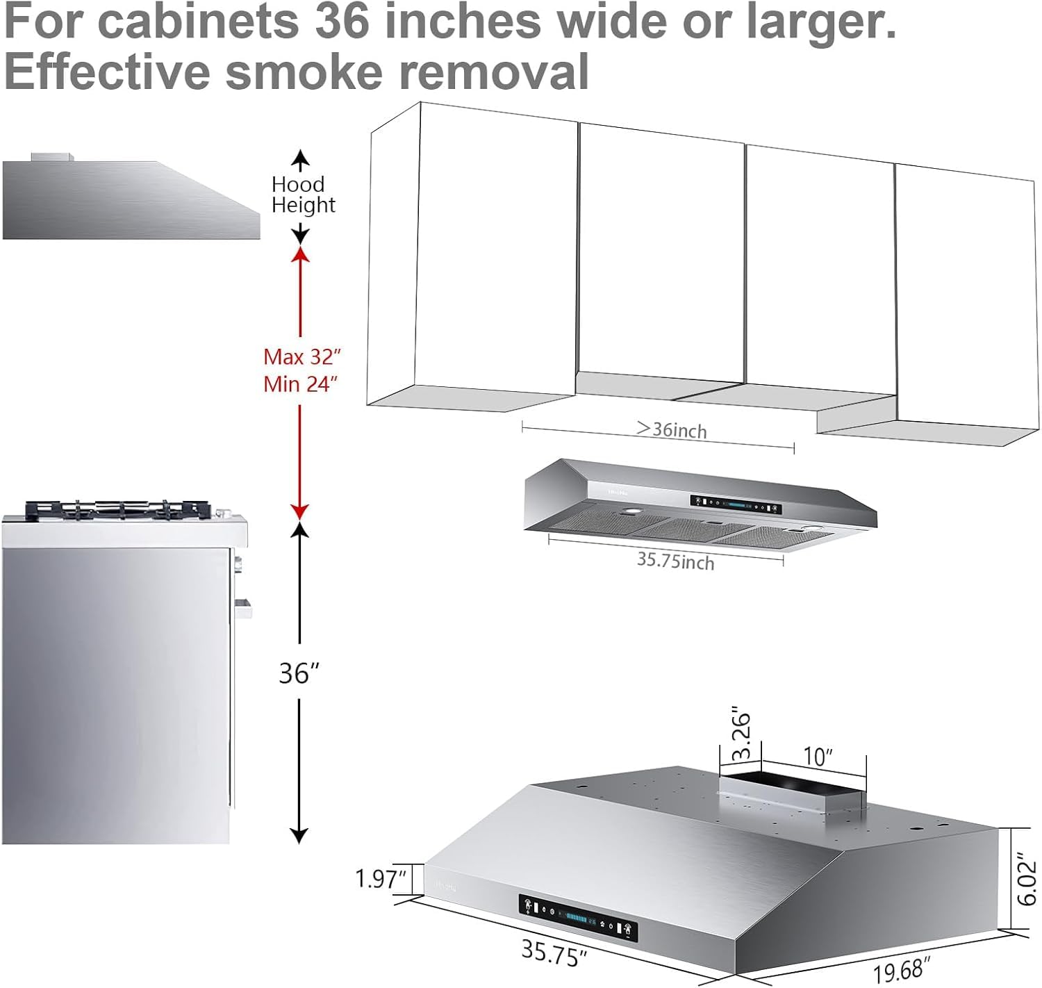 【Upgraded Dual Hood Motor】: The 36-inch Under Cabinet Range Hood is equipped with upgraded dual motors that features an 18% improvement in sealing and a 30% increase in suction power, equipped with a thermal protection system to ensure safety and enhance durability, stability.