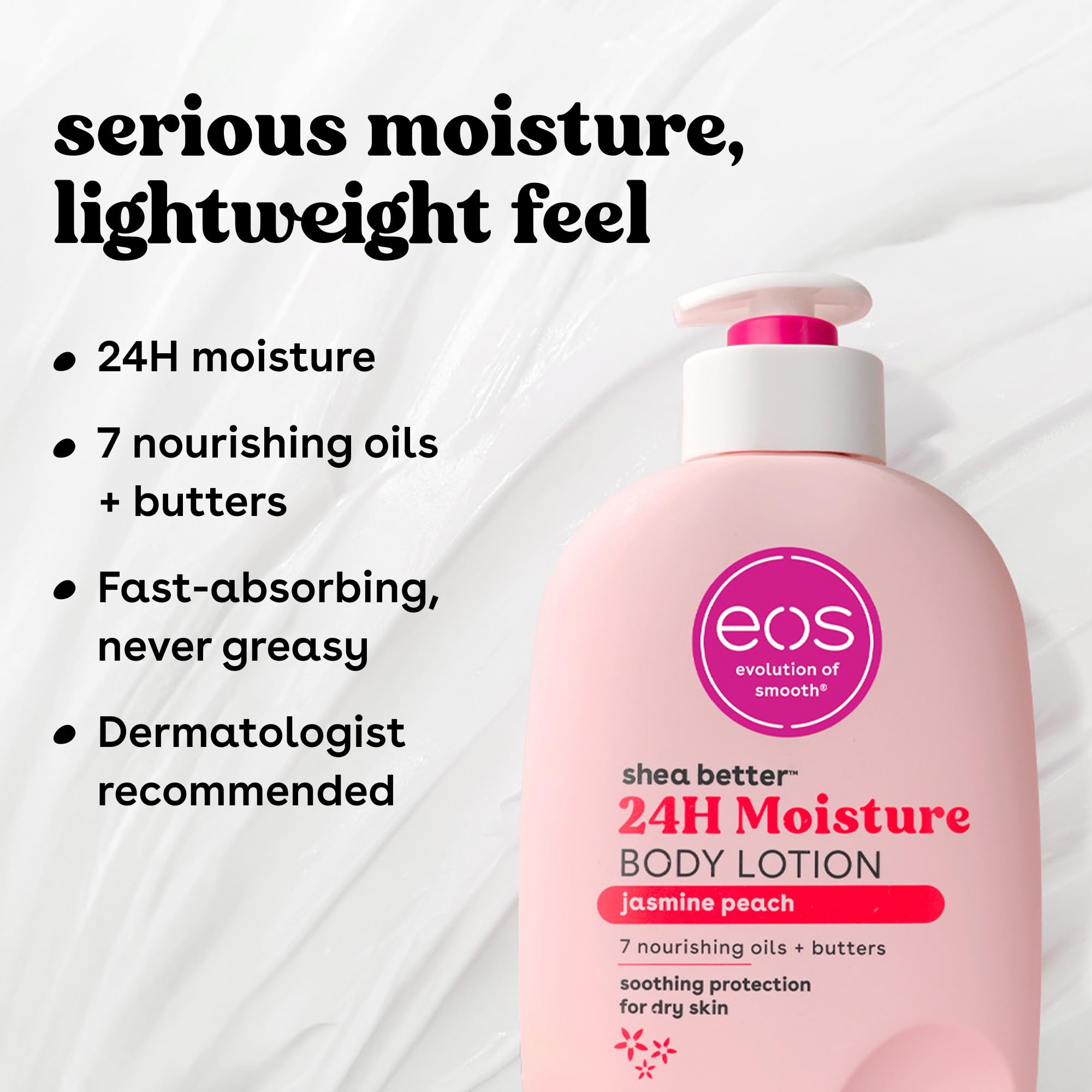eos JASMINE PEACH BODY LOTION: Liberally apply eos lotion to just-cleaned skin - we'll do the rest. Pro tip: Layer this with your favorite fragrance for an enhanced experience