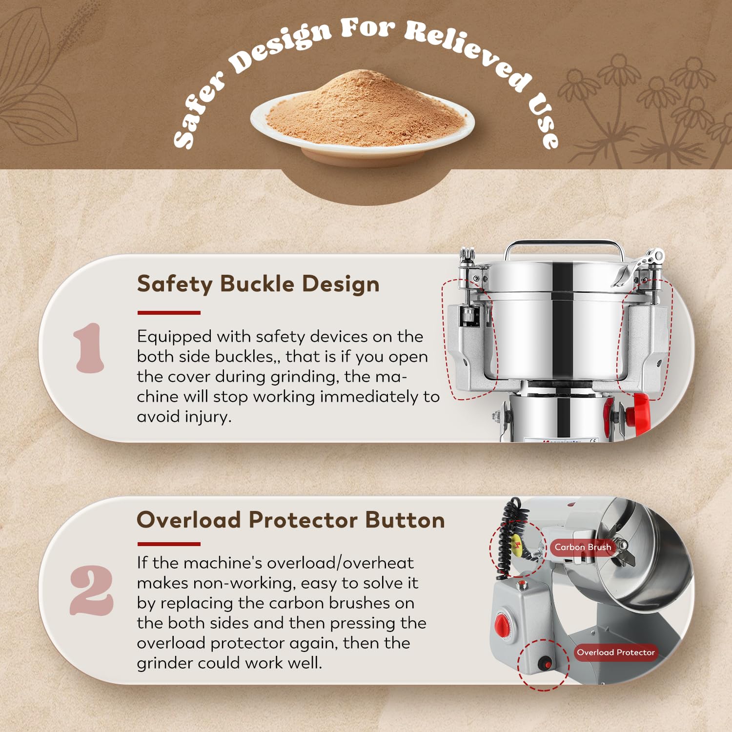 Safer Design For Relieved Use - Our electric grinder is equipped with a safety buckle device on the both sides of lid, that is if you open the lid during grinding, the machine will stop working immediately to avoid injury. And with upgraded overload protector, the grinder will also stop working to prevent the motor from burning-out when in overload/overheat state.
