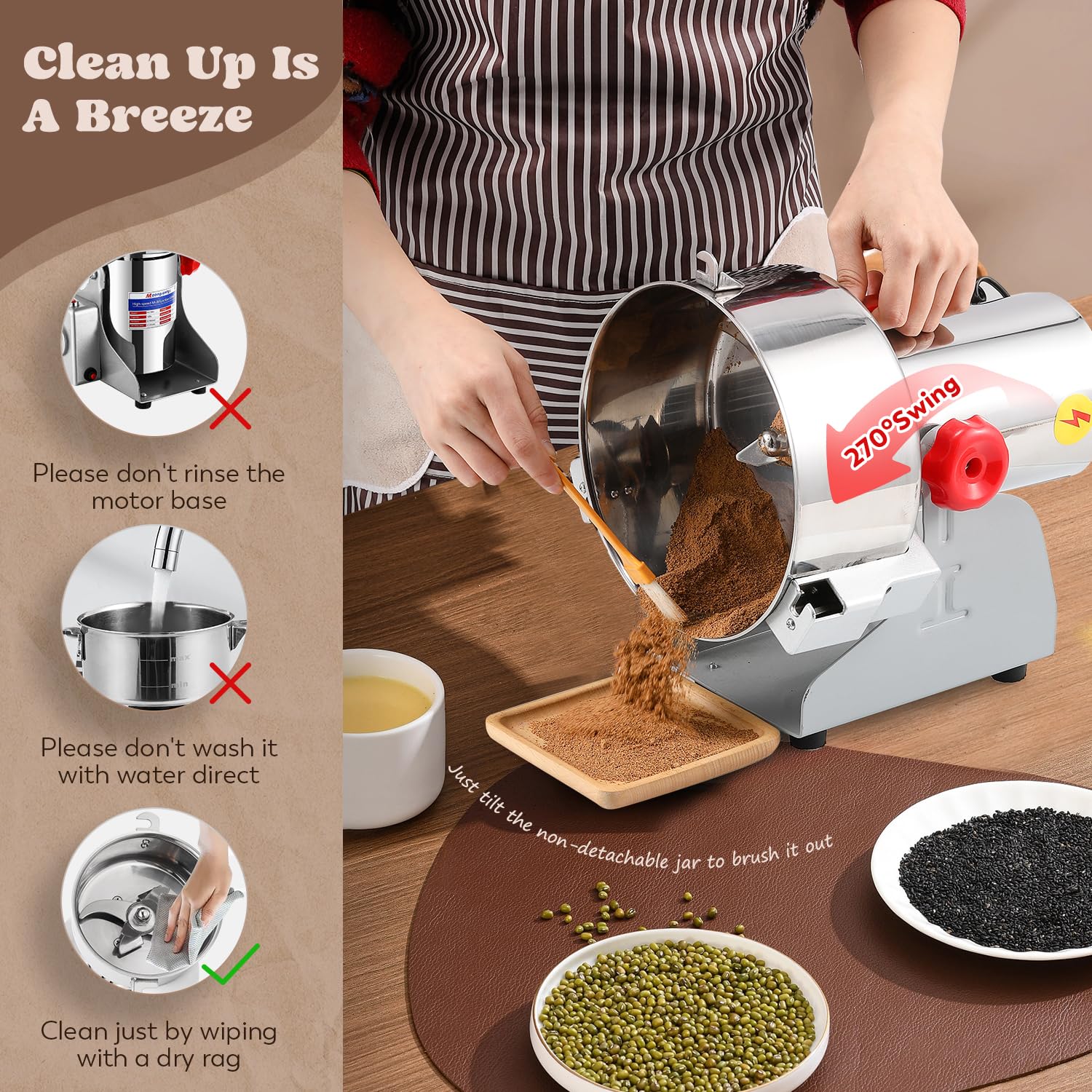 Easy To Use & Clean - This home mill grinder is easy to control by a 0-5 min Timer Switch. Turn the timer switch to the grinding time you want and the mill will start grinding automatically, and you can turn it back to zero to stop the operation immediately. Easily clean the inside jar with a cleaning brush and then wipe it with a dry cloth. (The grinding jar is not detachable, so Don't wash it with water directly or rinse the motor base.)