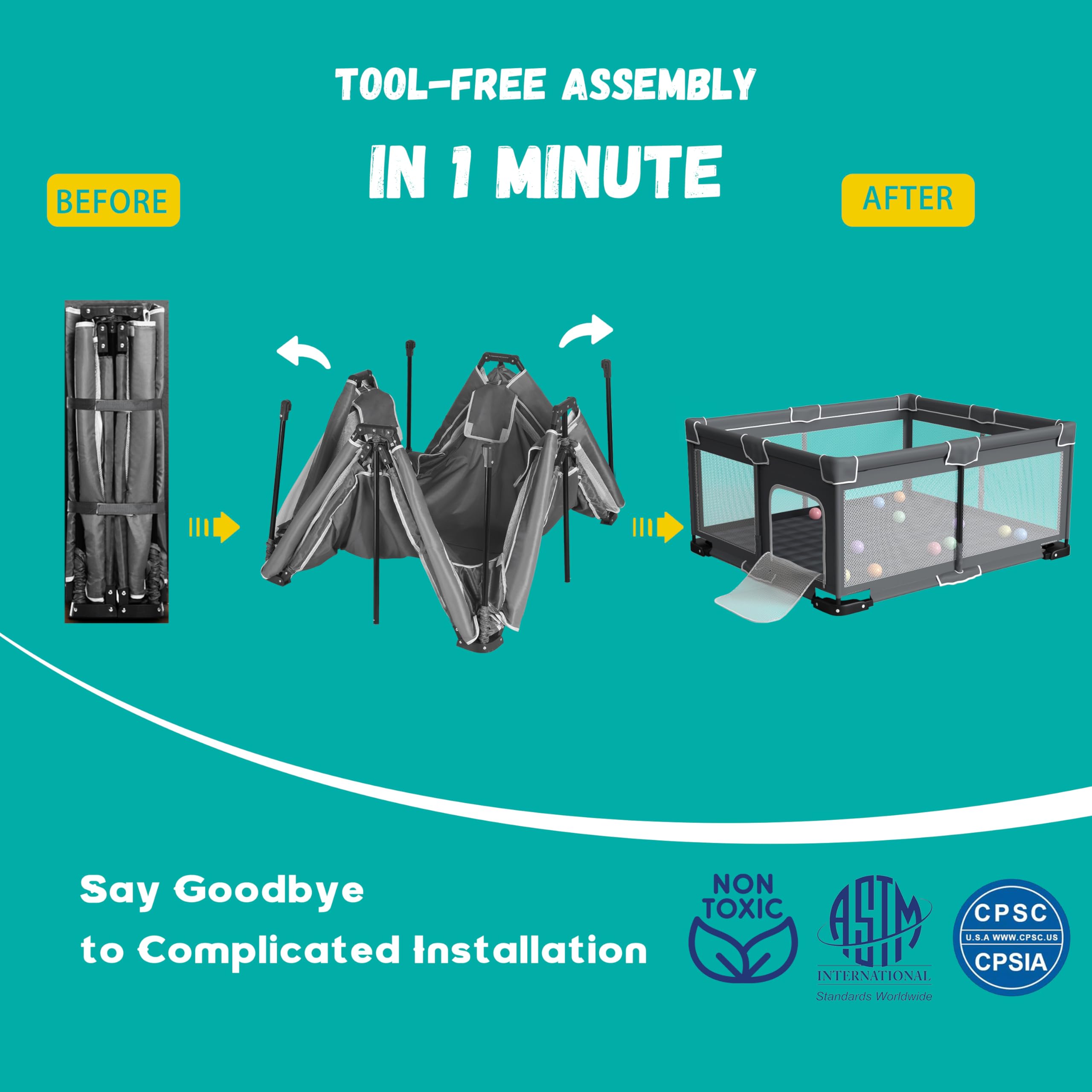 Easy to Assemble: Unlike other playpens, our baby playpen foldable has been upgraded for effortless assembly and disassembly, requiring no tools at all. You can complete the setup in just 1 to 3 minutes by yourself