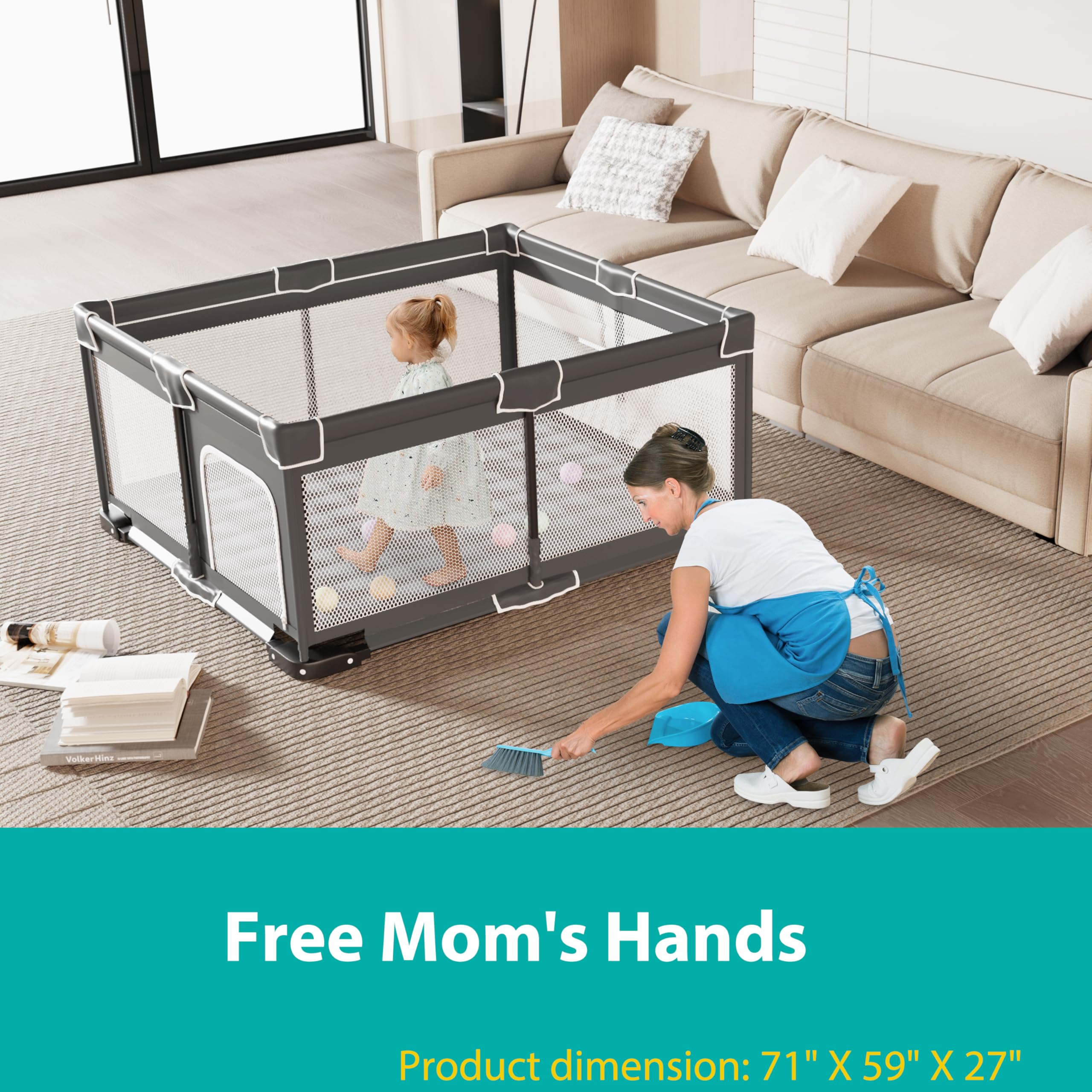 Free Parents' Hands: The ICAREWAY baby play pen foldable offers a generous space for your little ones to explore, play, and practice independent movement while ensuring their safety from potential hazards. With two pull-up rings and an ergonomically designed height(27"), this playpen aids your babies in learning to stand and walk, giving parents the freedom to tackle their own tasks or enjoy a well-deserved break
