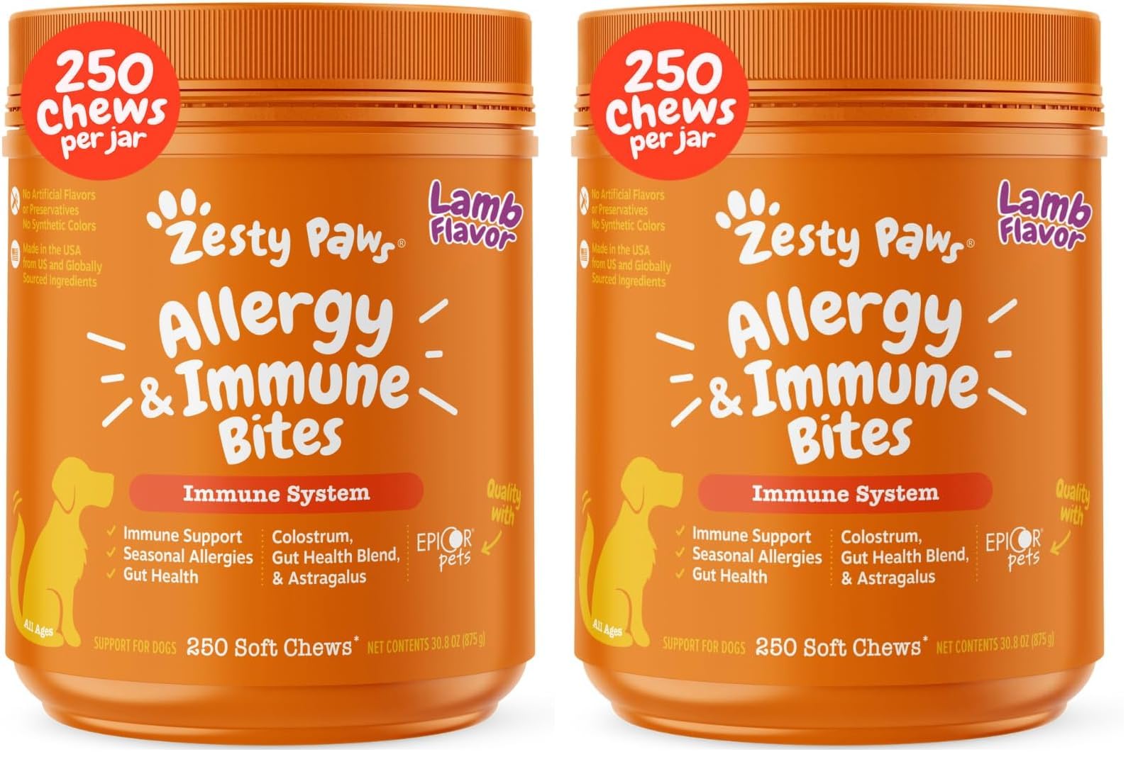 "Zesty Paws Allergy Relief Chews provide allergy relief for dogs itching with its comprehensive formula. Offering premium ingredients, these dog itching skin relief chews are designed to provide dog itch relief. Specifically crafted as dog supplements for itchy skin, ears, and paws, they also work to support digestion, immune function, and provide pet probiotics for dogs that target dog allergies and itching relief. With key ingredients like EpiCor Pets and Colostrum, these dog allergy chews help maintain normal histamine levels. This itchy skin relief for dog plays a dual role as both dog probiotics for digestive health and probiotics for dogs for allergies and itchy skin, promoting healthy gut flora and dog gut health. Zesty Paws dog supplements are crafted to support both skin and coat health, acting as dog supplements for skin and coat allergies. Featuring Omega-3 fatty acids, these chews deliver itchy paws dog relief, as well as seasonal allergy relief. Moreover, Zesty Paws Allergy Immune Bites cater to all dog sizes, from small puppies to large seniors, providing comprehensive allergy support. By using these dog probiotic chews, you provide your pup with dog allergy paw relief and itchy skin allergy relief, helping them enjoy a happier, itch-free life. These chews can be added to your dog supplements, as they are suitable for dog seasonal allergy relief or sensitive skin relief."