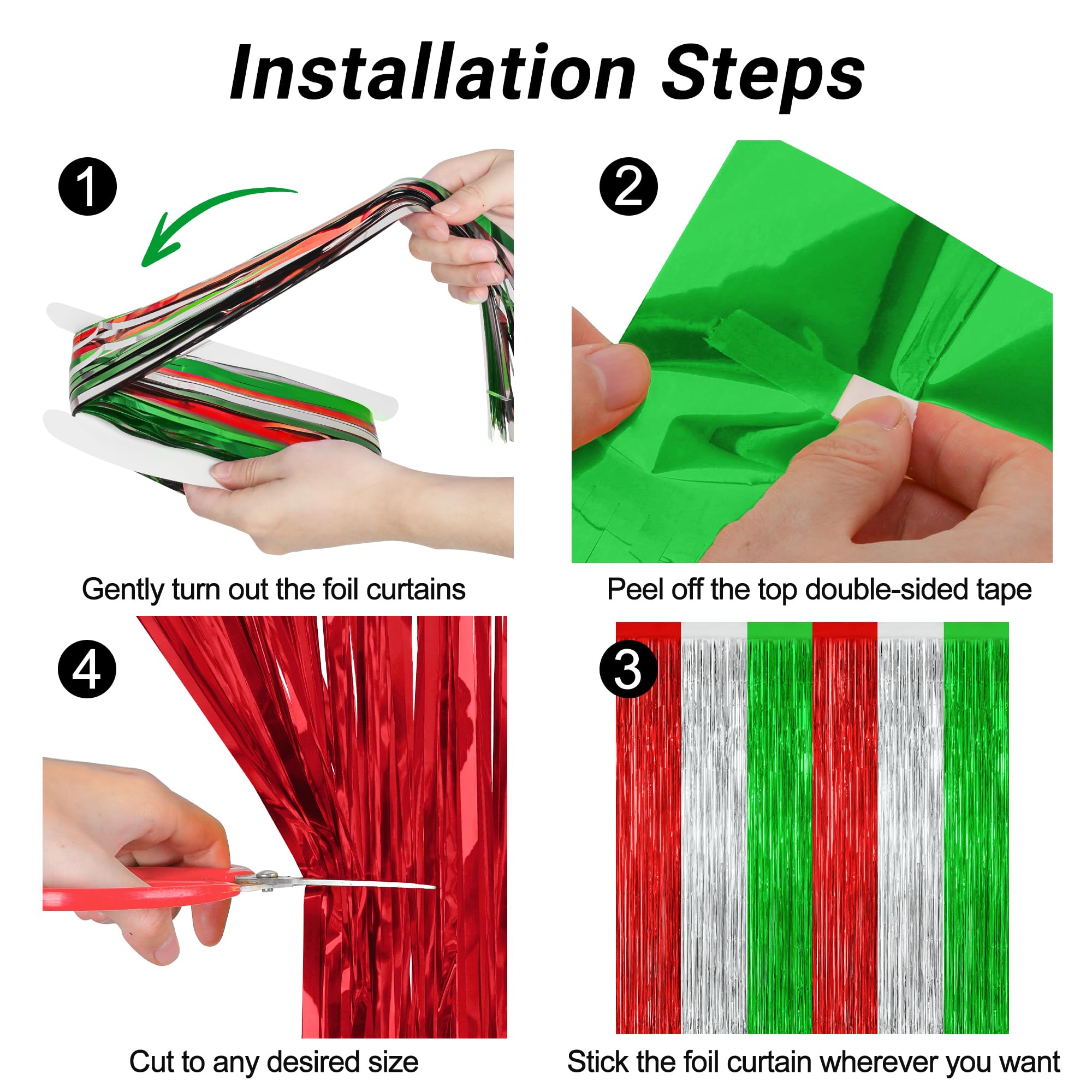Celebrate Christmas with these red silver and green party streamers! Quantity: 4 PCS Size: 3.28 FT x 7.05 FT Colors: Red Silver Green Design: Metallic glossy design Features: Large size: Can be cut to length as needed Non-tearable: 23 μm PET material, lightweight and non-tearable Easy to install: Comes with adhesive tape, no assembly required Use Occasions: Christmas, party, celebrations, birthday Warm Tips: These Christmas fringe curtains come with adhesive paper, but please do not stick them on rough and uneven surfaces.