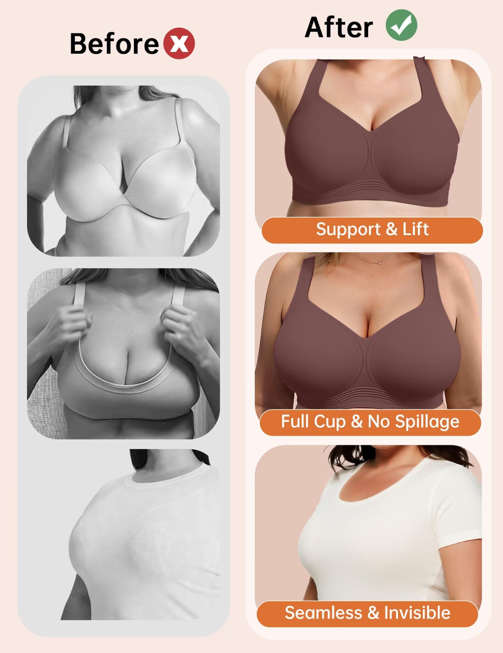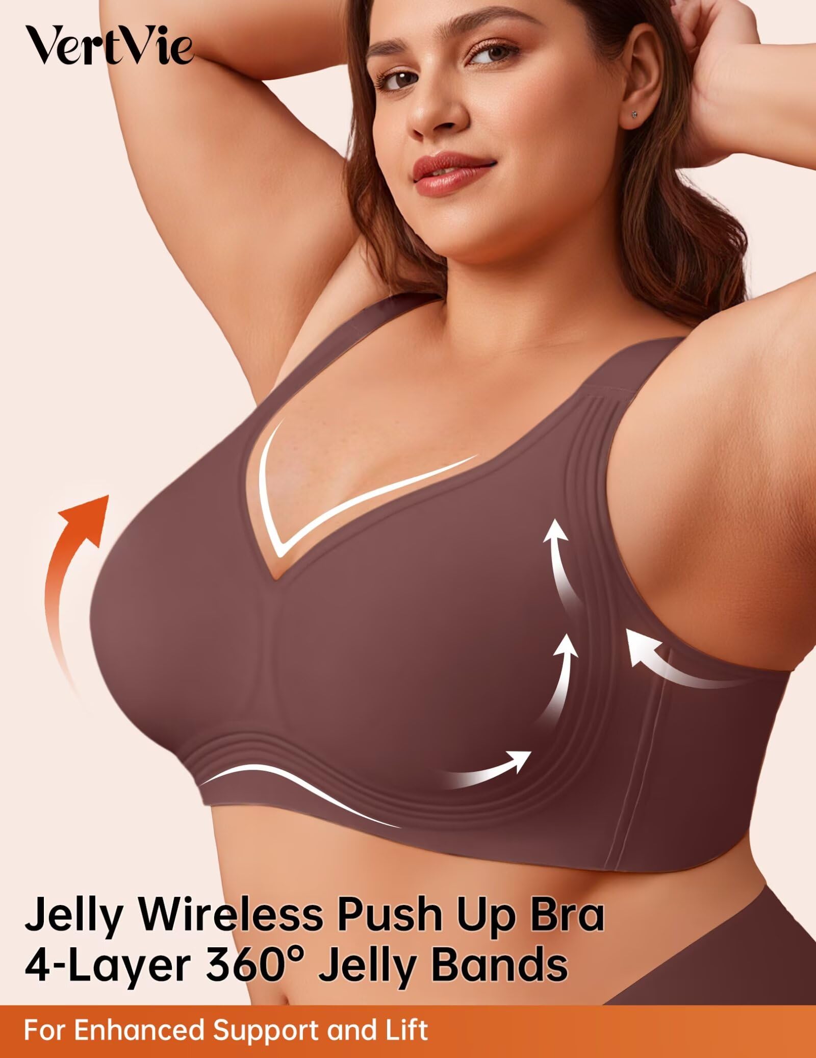 Ultimate Support & Lift Gel Wireless Pushup Bras for Women: Experience unparalleled support without the underwire! Our innovative jelly-bonded structure and 360° supportive bands are engineered to provide lift and shape that rival traditional underwire bras. This wireless pushup bra features a V-neck and wide reinforced underband with dual side boning that work together to prevent bounce, smooth your silhouette, and offer secure, all-day support—a feature that fuller figures deserve