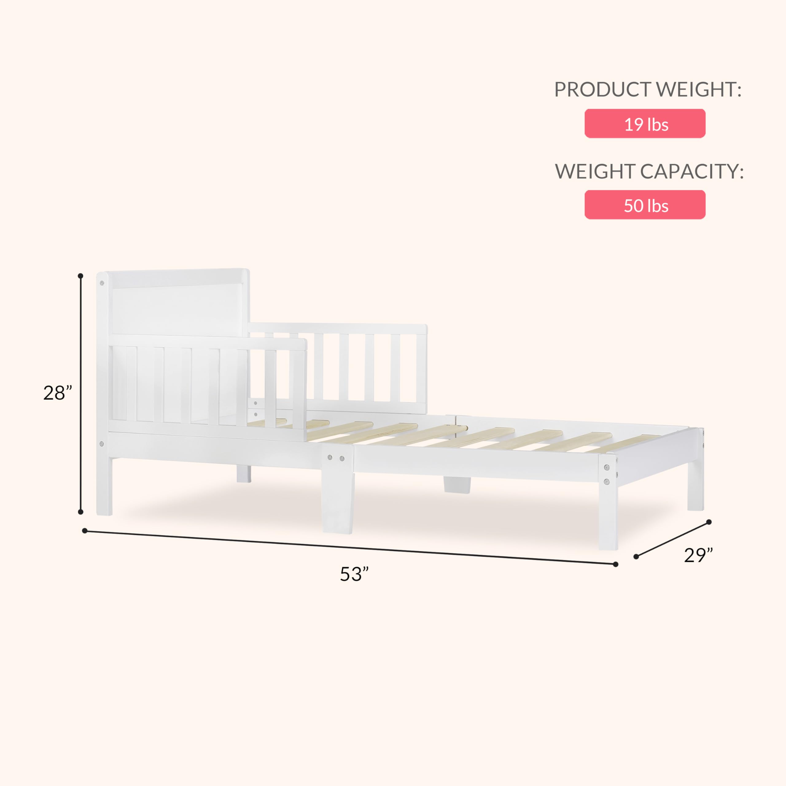 The Dream On Me Brookside Wooden Toddler Bed is the perfect solution for making the transition from crib to toddler bed smooth, safe, and stylish. Designed with a low-to-floor height, it allows little ones to get in and out with ease, while two wooden side safety rails and center legs provide added stability and security. Crafted from durable New Zealand pinewood, the Brookside combines strength with a modern design featuring clean lines that fit beautifully in any nursery or toddler bedroom. Parents can choose from 12 non-toxic, water-based finishes—from Blush Pink and Pebble Grey to Royal Blue—making it easy to match any décor. Safety is always a priority, which is why the Brookside is JPMA certified, Greenguard Gold certified, and tested to meet or exceed all ASTM and CPSC safety standards. Lightweight yet sturdy, it measures 53L x 29W x 28H inches, weighs only 19 lbs, and supports up to 50 lbs. For a perfect fit, pair it with any Dream On Me Greenguard Gold certified toddler or crib mattress. With its secure design, durable build, and range of radiant finishes, the Brookside is an ideal toddler bed for boys and girls ages 2–5.