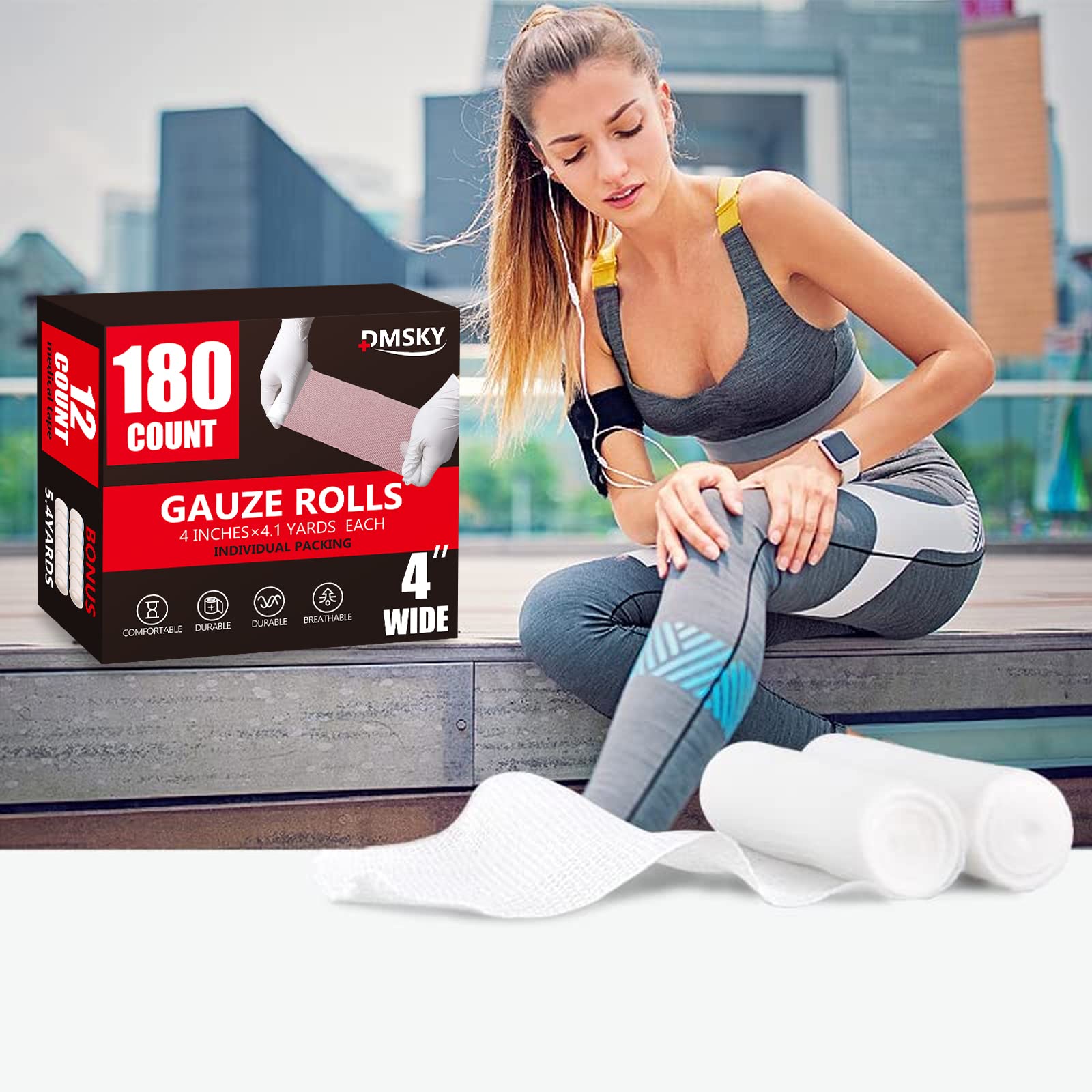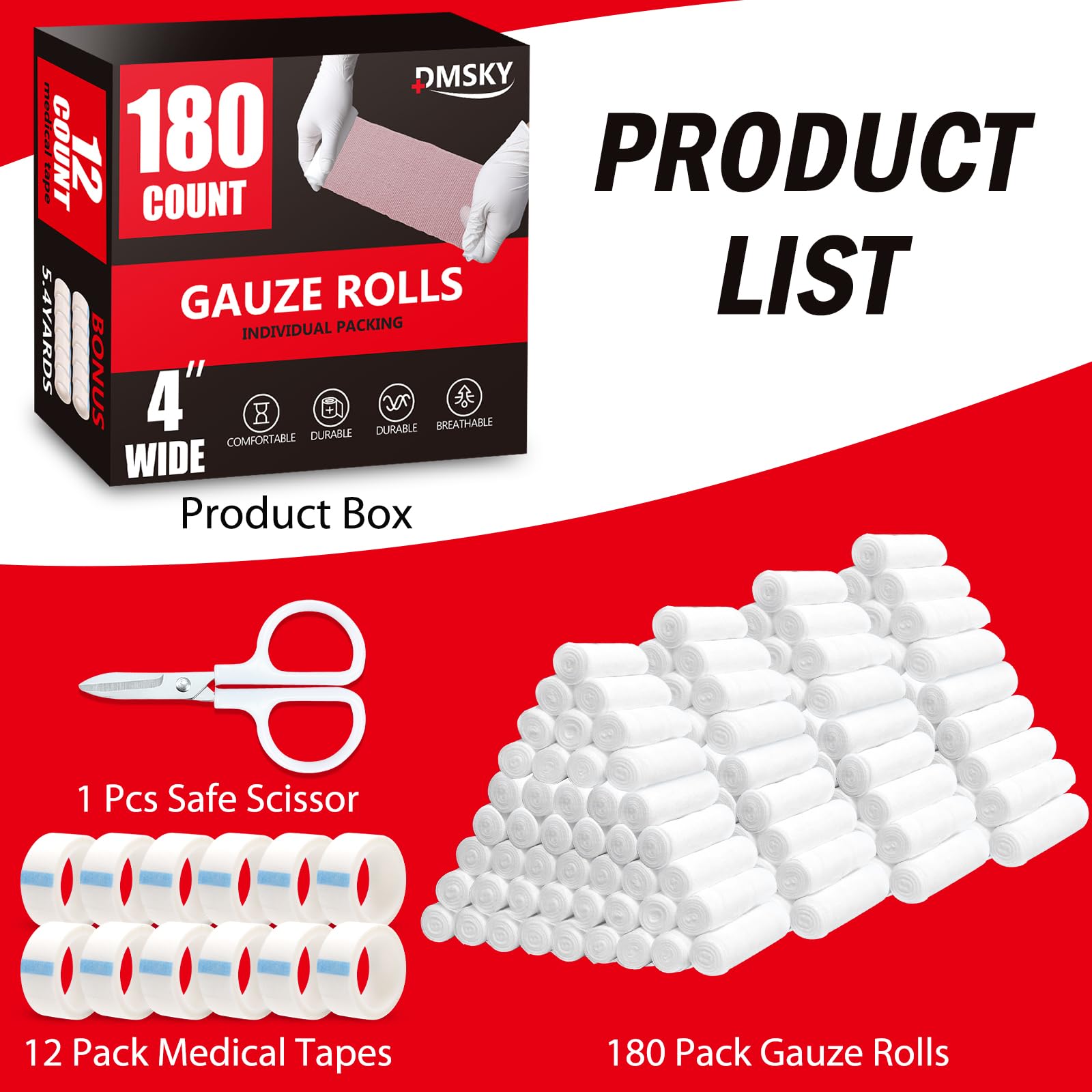 【Individually Packed】180 pack individually wrapped gauze rolls with 12 medical tapes is the first choice for your first aid kit! Each roll is 4 inches x 4.1 yards, you can cut it according to your needs. This is a good supplement to your first aid kit, hospitals, schools and sports.