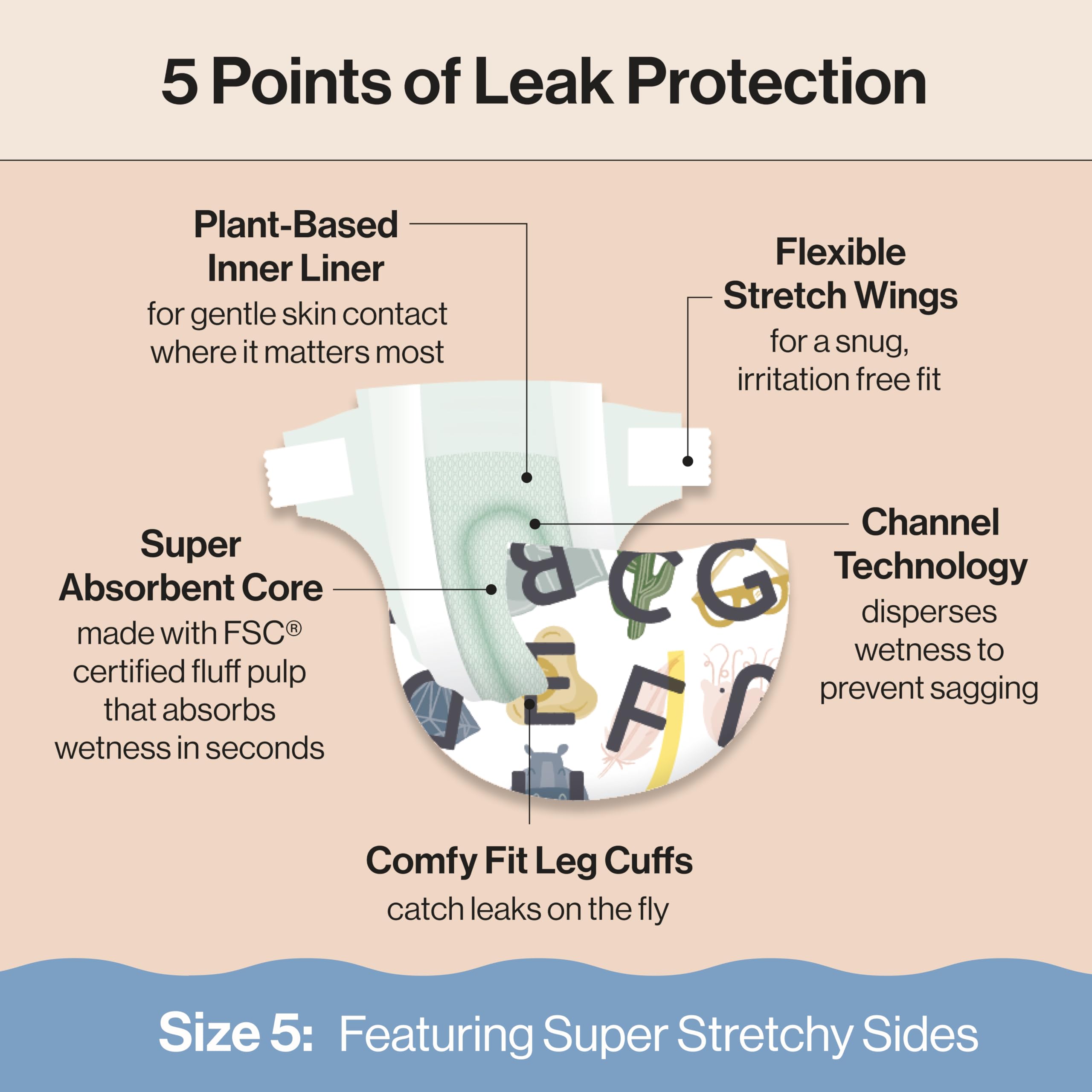 Designed to protect delicate skin, Honest Clean Conscious Diapers keep baby comfortable and dry through all the wiggles and wobbles Our softest diaper yet delivers up to 100% leak protection with Comfort Dry Technology. The hypoallergenic, plant based inner liner, flexible stretch wings, super absorbent core, and channel technology provide a comfy, secure fit for all ages and stages. Because safety is top priority, these diapers are OEKO-TEX STANDARD 100 Certified, a 3rd party that tests for 350 harmful chemicals, and made with FSC Certified Fluff Pulp and other controlled materials. And for cuteness overload, each diaper features a super cute print.