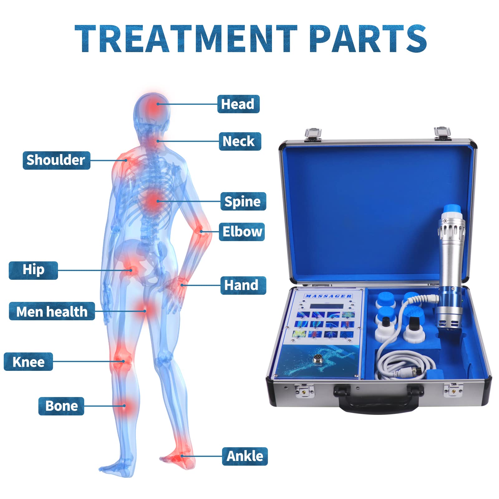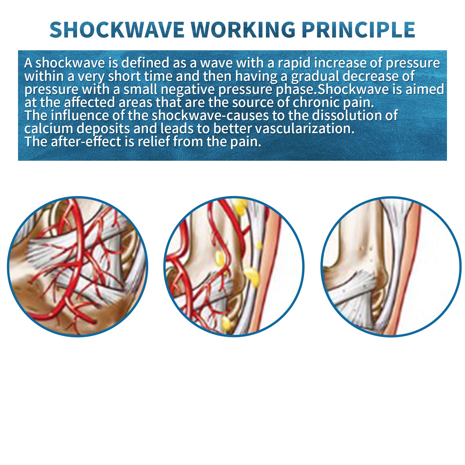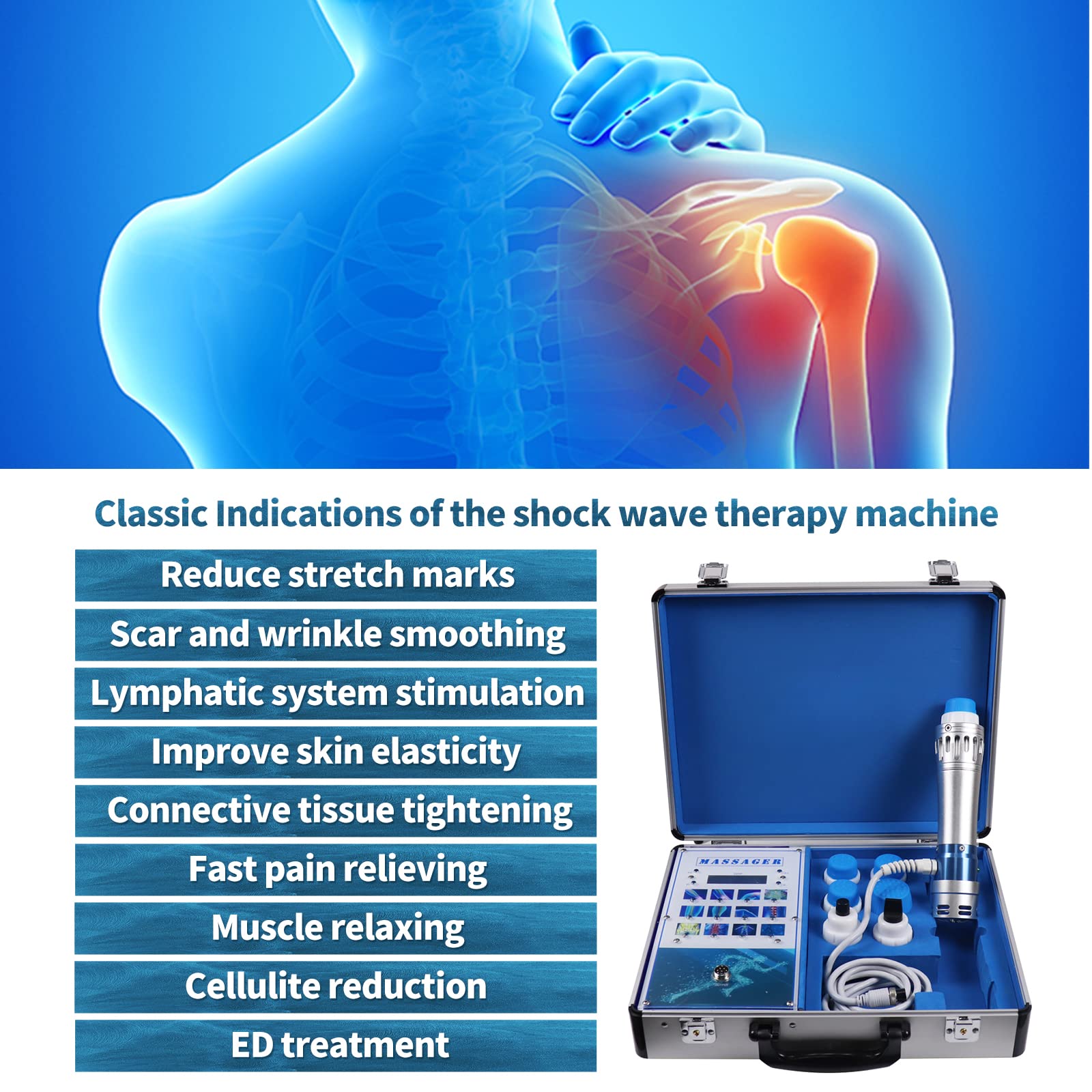 Functions: The shockwave can cure many pains: Shoulder pain, Calcific tendonltis, Radial or ulnar epicondylitis, Trochanteric tendonitis, Waist or stern pain, Patellar tendonitis, Tibial stress syndrome, Achillodynia, Plantar fasciitis, cellulite removal.