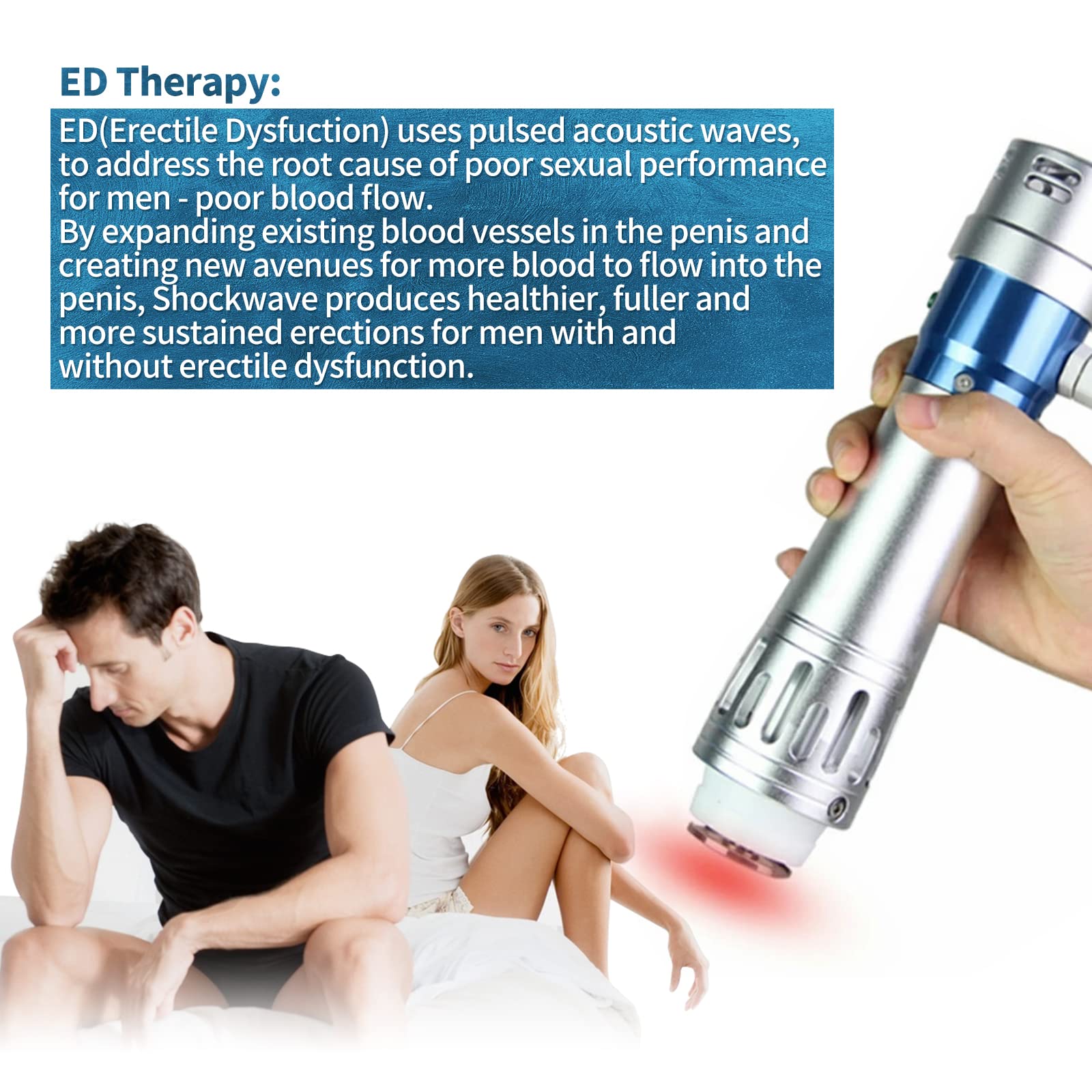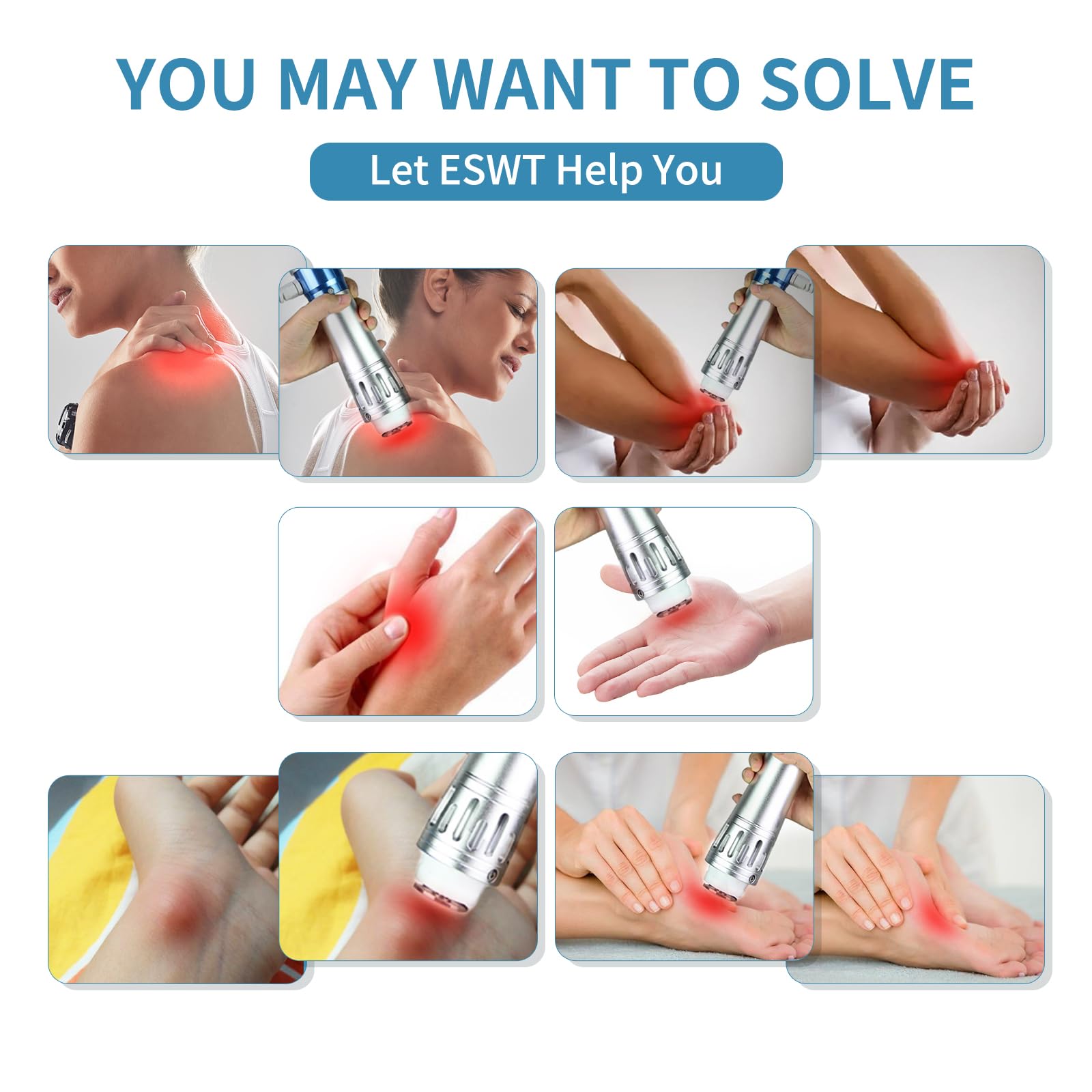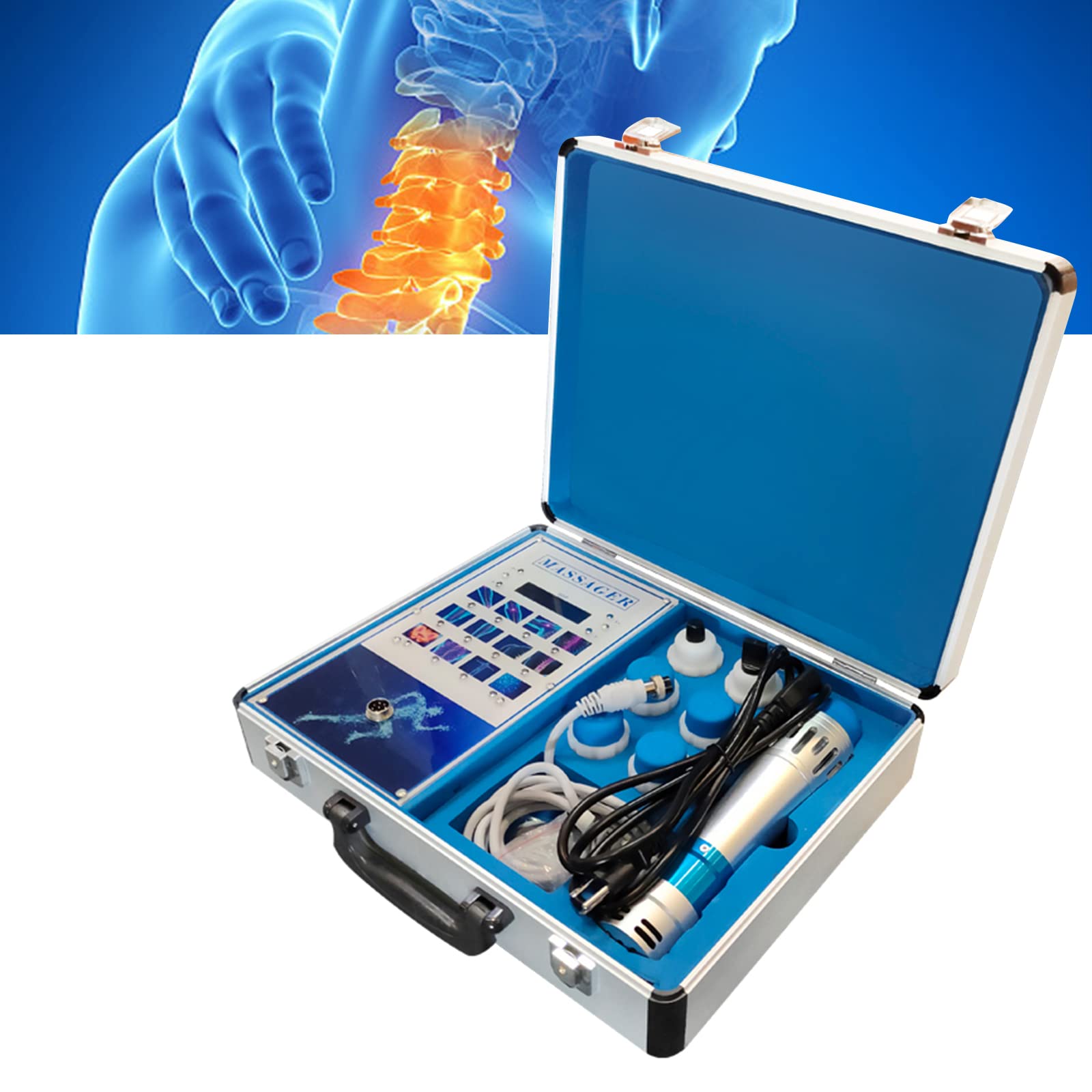 Functions: The shockwave can cure many pains: Shoulder pain, Calcific tendonltis, Radial or ulnar epicondylitis, Trochanteric tendonitis, Waist or stern pain, Patellar tendonitis, Tibial stress syndrome, Achillodynia, Plantar fasciitis, cellulite removal.